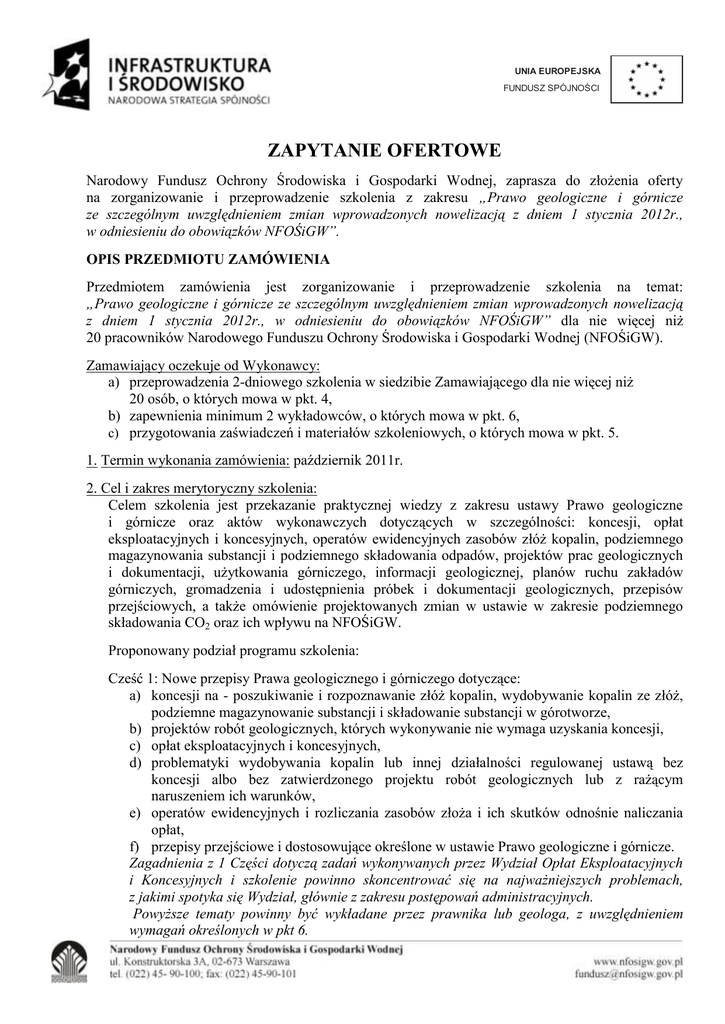 UNIA EUROPEJSKA FUNDUSZ SPÓJNOŚCI ZAPYTANIE OFERTOWE Narodowy Fundusz Ochrony Środowiska i Gospodarki Wodnej, zaprasza do złożenia oferty na zorganizowanie i przeprowadzenie szkolenia z zakresu „Prawo geologiczne i górnicze ze szczególnym uwzględnieniem zmian wprowadzonych nowelizacją z dniem 1 stycznia 2012r., w odniesieniu do obowiązków NFOŚiGW”. OPIS PRZEDMIOTU ZAMÓWIENIA Przedmiotem zamówienia jest zorganizowanie i przeprowadzenie szkolenia na temat: „Prawo geologiczne i górnicze ze szczególnym uwzględnieniem zmian wprowadzonych nowelizacją z dniem 1 stycznia 2012r., w odniesieniu do obowiązków NFOŚiGW” dla nie więcej niż 20 pracowników Narodowego Funduszu Ochrony Środowiska i Gospodarki Wodnej (NFOŚiGW). Zamawiający oczekuje od Wykonawcy: a) przeprowadzenia 2-dniowego szkolenia w siedzibie Zamawiającego dla nie więcej niż 20 osób, o których mowa w pkt. 4, b) zapewnienia minimum 2 wykładowców, o których mowa w pkt. 6, c) przygotowania zaświadczeń i materiałów szkoleniowych, o których mowa w pkt. 5. 1. Termin wykonania zamówienia: październik 2011r. 2. Cel i zakres merytoryczny szkolenia: Celem szkolenia jest przekazanie praktycznej wiedzy z zakresu ustawy Prawo geologiczne i górnicze oraz aktów wykonawczych dotyczących w szczególności: koncesji, opłat eksploatacyjnych i koncesyjnych, operatów ewidencyjnych zasobów złóż kopalin, podziemnego magazynowania substancji i podziemnego składowania odpadów, projektów prac geologicznych i dokumentacji, użytkowania górniczego, informacji geologicznej, planów ruchu zakładów górniczych, gromadzenia i udostępnienia próbek i dokumentacji geologicznych, przepisów przejściowych, a także omówienie projektowanych zmian w ustawie w zakresie podziemnego składowania CO2 oraz ich wpływu na NFOŚiGW. Proponowany podział programu szkolenia: Cześć 1: Nowe przepisy Prawa geologicznego i górniczego dotyczące: a) koncesji na - poszukiwanie i rozpoznawanie złóż kopalin, wydobywanie kopalin ze złóż, podziemne magazynowanie substancji i składowanie substancji w górotworze, b) projektów robót geologicznych, których wykonywanie nie wymaga uzyskania koncesji, c) opłat eksploatacyjnych i koncesyjnych, d) problematyki wydobywania kopalin lub innej działalności regulowanej ustawą bez koncesji albo bez zatwierdzonego projektu robót geologicznych lub z rażącym naruszeniem ich warunków, e) operatów ewidencyjnych i rozliczania zasobów złoża i ich skutków odnośnie naliczania opłat, f) przepisy przejściowe i dostosowujące określone w ustawie Prawo geologiczne i górnicze. Zagadnienia z 1 Części dotyczą zadań wykonywanych przez Wydział Opłat Eksploatacyjnych i Koncesyjnych i szkolenie powinno skoncentrować się na najważniejszych problemach, z jakimi spotyka się Wydział, głównie z zakresu postępowań administracyjnych. Powyższe tematy powinny być wykładane przez prawnika lub geologa, z uwzględnieniem wymagań określonych w pkt 6. Część 2: Projektowane przepisy Prawa geologicznego i górniczego: a) obecne przepisy dyrektywy w zakresie technologii podziemnego składowania CO2 + planowana zmiana Prawa geologicznego i górniczego. Powyższe tematy powinny być wykładane przez prawnika lub geologa, z uwzględnieniem wymagań określonych w pkt 6. Część 3: Pozostałe zagadnienia: a) projekty prac geologicznych i dokumentacji, b) użytkowanie górnicze, c) informacja geologiczna, d) plany ruchu zakładów górniczych, e) gromadzenie i udostępnienie próbek i dokumentacji geologicznych, f) rekultywacja terenów zdegradowanych wydobyciem i przeróbką surowców, g) likwidacja zakładów górniczych. Powyższe tematy powinny być wykładane przez geologa lub górnika, z uwzględnieniem wymagań określonych w pkt 6. Szczegółowy zakres merytoryczny zostanie ustalony między wykładowcą a uczestnikami szkolenia przed podpisaniem umowy i stanowić będzie załącznik do umowy. 3. Miejsce realizacji przedmiotu zamówienia: sala szkoleniowa w siedzibie NFOŚiGW wyposażona w laptop i rzutnik multimedialny. 4. Uczestnicy szkolenia: w szkoleniu uczestniczyć będą głównie pracownicy Wydziału Opłat Eksploatacyjnych i Koncesyjnych Departamentu Księgowości i Rozliczeń oraz Departamentu Ochrony Ziemi, którzy na co dzień zajmują się zagadnieniami z zakresu Prawa geologicznego i górniczego. Łączna liczba uczestników na szkoleniu wynosi nie więcej niż 20 osób. Zamawiający zastrzega sobie możliwość zmiany/modyfikacji listy uczestników, nie później niż 1 dzień przed rozpoczęciem szkolenia. 5. Materiały dla uczestników: Zadaniem Wykonawcy jest zapewnienie dla każdego uczestnika szkolenia kompletu merytorycznych materiałów szkoleniowych oraz dodatkowych materiałów szkoleniowych w postaci długopisu i zeszytu do notatek, a także zaświadczeń o ukończeniu szkolenia. Kserokopie zaświadczeń potwierdzonych „za zgodność z oryginałem” (x 2 egz.), Wykonawca przekaże Zamawiającemu najpóźniej 2 dni po zakończeniu szkolenia. Merytoryczne materiały szkoleniowe oraz zaświadczenia o ukończeniu szkolenia zostaną opatrzone przez Wykonawcę logo NFOŚiGW, logo UE oraz logo Programu Operacyjnego Infrastruktura i Środowisko, zgodnie z Księgą identyfikacji wizualnej Narodowej Strategii Spójności. Wykonawca przygotuje i przekaże na dzień roboczy przed rozpoczęciem szkolenia jeden egzemplarz materiałów merytorycznych w formie elektronicznej w formacie PDF, z prawem do ich umieszczenia na dysku kadrowym w folderze „Biblioteka szkoleń”, wyłącznie do celów edukacyjnych pracowników NFOŚiGW, z zastrzeżeniem zakazu ich rozpowszechnia i kopiowania. 6. Wymagania dotyczące osoby prowadzącej szkolenie: Szkolenie przeprowadzi co najmniej dwóch ekspertów w dziedzinie Prawa geologicznego i górniczego, posiadających doświadczenie zawodowe i publikacje ściśle związane z tematyką szkolenia oraz z uwzględnieniem podz