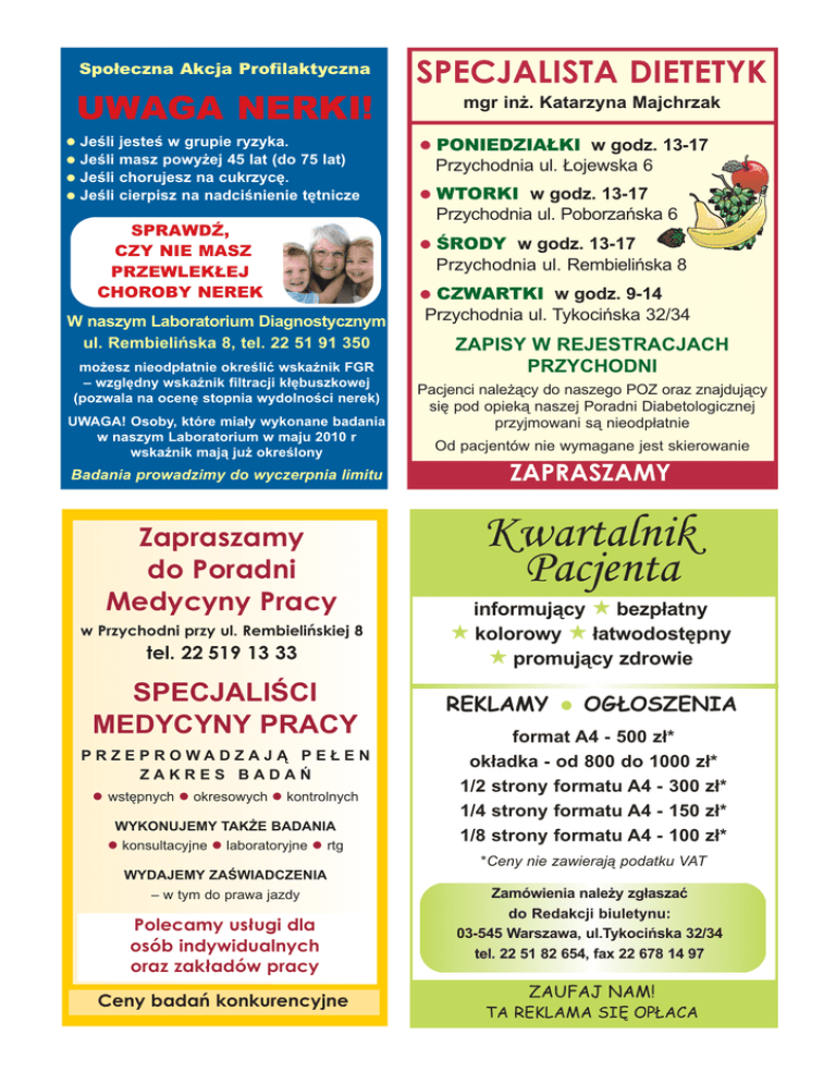 Społeczna Akcja Profilaktyczna SPECJALISTA DIETETYK UWAGA NERKI! mgr inż. Katarzyna Majchrzak Jeśli Jeśli Jeśli Jeśli jesteś w grupie ryzyka. masz powyżej 45 lat (do 75 lat) chorujesz na cukrzycę. cierpisz na nadciśnienie tętnicze PONIEDZIAŁKI w godz. 13-17 Przychodnia ul. Łojewska 6 WTORKI w godz. 13-17 Przychodnia ul. Poborzańska 6 SPRAWDŹ, CZY NIE MASZ PRZEWLEKŁEJ CHOROBY NEREK W naszym Laboratorium Diagnostycznym ul. Rembielińska 8, tel. 22 51 91 350 możesz nieodpłatnie określić wskaźnik FGR – względny wskaźnik filtracji kłębuszkowej (pozwala na ocenę stopnia wydolności nerek) UWAGA! Osoby, które miały wykonane badania w naszym Laboratorium w maju 2010 r wskaźnik mają już określony Badania prowadzimy do wyczerpnia limitu Zapraszamy do Poradni Medycyny Pracy w Przychodni przy ul. Rembielińskiej 8 tel. 22 519 13 33 SPECJALIŚCI MEDYCYNY PRACY PRZEPROWADZAJĄ PEŁEN ZAKRES BADAŃ wstępnych okresowych kontrolnych WYKONUJEMY TAKŻE BADANIA konsultacyjne laboratoryjne rtg ŚRODY w godz. 13-17 Przychodnia ul. Rembielińska 8 CZWARTKI w godz. 9-14 Przychodnia ul. Tykocińska 32/34 ZAPISY W REJESTRACJACH PRZYCHODNI Pacjenci należący do naszego POZ oraz znajdujący się pod opieką naszej Poradni Diabetologicznej przyjmowani są nieodpłatnie Od pacjentów nie wymagane jest skierowanie ZAPRASZAMY Kwartalnik Pacjenta informujący bezpłatny kolorowy łatwodostępny promujący zdrowie REKLAMY OGŁOSZENIA format A4 - 500 zł* okładka - od 800 do 1000 zł* 1/2 strony formatu A4 - 300 zł* 1/4 strony formatu A4 - 150 zł* 1/8 strony formatu A4 - 100 zł* *Ceny nie zawierają podatku VAT WYDAJEMY ZAŚWIADCZENIA – w tym do prawa jazdy Polecamy usługi dla osób indywidualnych oraz zakładów pracy Ceny badań konkurencyjne Zamówienia należy zgłaszać do Redakcji biuletynu: 03-545 Warszawa, ul.Tykocińska 32/34 tel. 22 51 82 654, fax 22 678 14 97 ZAUFAJ NAM! TA REKLAMA SIĘ OPŁACA