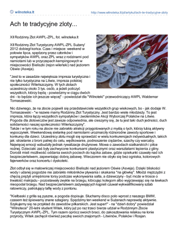 wilnoteka.lt http://www.wilnoteka.lt/pl/artykul/ach-te-tradycyjne-zloty Ach te tradycyjne zloty... XII Rodzinny Zlot AWPL-ZPL, fot. wilnoteka.lt XII Rodzinny Zlot Turystyczny AWPL-ZPL Sużany' 2012 dobiegł końca. Czas i miejsce: weekend w połowie lipca, spędzony przez członków i sympatyków AWPL oraz ZPL wraz z rodzinami pod namiotami lub w przyczepach kempingowych w miejscowości Bieliszki (rejon wileński) nad jeziorem Oświe (Asveja). "Jest to w zasadzie największa impreza turystyczna i nie tylko turystyczna na Litwie, impreza polskiej społeczności Wileńszczyzny. W tych zlotach uczestniczy około 3 tys. osób, a jeżeli policzyć wszystkich, którzy będą - powiedzmy w ciągu dwóch dni - to będzie ich jeszcze więcej" - powiedział dla "Wilnoteki" przewodniczący AWPL Waldemar Tomaszewski. Nic dziwnego, że na zlocie pojawili się przedstawiciele wszystkich grup wiekowych, bo - jak dodaje W. Tomaszewski - "w nazwie mamy Rodzinny Zlot Turystyczny. Jest bardzo wiele młodzieży. To jest impreza, która łączy wszystkich sympatyków i zwolenników Akcji Wyborczej Polaków na Litwie. Pogoda dla zlotowiczów jest zawsze odpowiednia, ale cieszymy się, że tu jest taki duch jedności, duch solidarności naszej społeczności Wileńszczyzny". Także i w tym roku na zlocie nie zabrakło atrakcji przygotowanych z myślą o tych, którzy lubią aktywny wypoczynek. Weekendową sielankę pod namiotami urozmaiciły różnorodne zawody sportowe i konkursy dla dzieci. Uczestnicy zlotu mogli się sprawdzić w wielu konkurencjach indywidualnych, takich jak: strzelanie z broni palnej do celu, wędkowanie, podnoszenie ciężarów, szachy czy warcaby. Najwięcej emocji wzbudziły jednak rywalizacje drużynowe. Mowa o zawodach siatkarskich i piłce nożnej. Dzieciaki zaś były zachwycone konkursami plastycznymi oraz warsztatami lepienia z gliny. Dorośli mieli możliwość oddania swoich pociech do kącika zabaw, gdzie opiekunki czuwały nad ich bezpieczeństwem, zapewniając dobrą zabawę. Wieczorem nie obyło się bez ogniska, kolorowych fajerwerków oraz koncertu i dyskoteki. Zlot odbył się w malowniczej miejscowości Bieliszki nad jeziorem Oświe (Asveja). Dzięki bliskości wody i udanej pogodzie nie zabrakło miłośników pływania i skakania "na główkę". Młodzi mężczyźni z chęcią prężyli umięśnione torsy podczas wykonywania salta, a dziewczyny - być może w trosce o trwałość makijażu - pozostawały zwykle na brzegu, kibicując kolegom albo wygrzewając się na ławkach nieopodal brzegu. Nad bezpieczeństwem zażywających kąpieli czuwał wykwalifikowany sztab ratowniczy, patrolujący taflę wody z pontonu. "Kiełbaski z grilla są pyszne, a pogoda dopisuje. Słuchamy disco polo wprost z naszego BMW, czasem też śpiewamy znane szlagiery. Spędzimy ten weekend w Sużanach naprawdę aktywnie. Szykujemy się na przykład do zawodów piłkarskich. Jest super!" - na "dzień dobry" powiedział "Wilnotece" 20-letni student Witek, który już po raz trzeci bierze udział w Rodzinnym Zlocie Turystycznym AWPL-ZPL. Tym razem oprócz swoich braci, do zakosztowania relaksu na łonie przyrody, Witek zachęcił również paczkę swoich znajomych - Litwinów, Polaków i Rosjan. I choć tegoroczny Rodzinny Zlot Turystyczny AWPL-ZPL nie zaskoczył uczestników nowymi atrakcjami, a jego atmosfera z racji wszechobecnej muzyki disco polo, tanich piw przechowywanych w bagażnikach podrasowanych samochodów z odzysku i zapachu strojów ludowych wyciągniętych z dna szafy, przypominała mi nieco gminne dożynki na południu Polski, w których brałam udział w dzieciństwie, nie da się ukryć, że gościnność i dobre humory, jakimi zarażali uczestnicy imprezy, naprawdę były jego mocną stroną. Więc może niepotrzebnie się czepiam. W całym zlocie chodziło wszak o dobrą zabawę i relaks na świeżym powietrzu w gronie przyjaciół, znajomych i nowopoznanych osób. A kiełbasa przedwyborcza? To tylko wisienka na torcie. Chyba żaden dorosły zlotowicz nie miał jednak wątpliwości, że siła narodu tkwi w jego jedności (o czym nomen omen przypominał także baner znajdujący się pod sceną, przetłumaczony na język litewski i rosyjski). Trzeba mieć nadzieję, że od jedności do zdobycia cennych mandatów wyborczych w październikowych wyborach dzieli już tylko mały krok! Zdaniem przewodniczącego AWPL Waldemara Tomaszewskiego "na każdym zlocie jest coś nowego, chociażby ta piękna scena (...) Teraz już mamy dwie sceny na zlocie. Mamy też więcej boisk, bo nie mogliśmy nadążyć z przeprowadzaniem zawodów sportowych, powiedzmy w siatkówce, w piłce nożnej zgłaszało się około 40 drużyn. Poszerzamy swe posiadłości, bo w tej 7-mio hektarowej parceli już się nie mieścimy". Warto jeszcze dodać, że spragnieni wyższych przeżyć estetycznych mieli okazję obejrzeć między innymi występ zespołu artystycznego "Czerwone Maki" z rejonu szyrwickiego - panie z czerwonymi kwiatami we włosach doskonale wpisały się w tradycję zlotu, wykonując acapella pieśni ludowe z rejonu. Słowo "do ludu" powiedzieli, przewodniczący AWPL Waldemar Tomaszewski, konsul RP w Wilnie Stanisław Kargul oraz gość z Polski, prezes Stowarzyszenia "Wspólnota Polska" Longin Komołowski. Impreza, jak co roku, została zorganizowana przez Akcję Wyborczą Polaków na Litwie oraz Związek Polaków na Litwie. Już wkrótce członków tych organizacji czeka ciężka praca: start i udział w kampanii wyborczej, a następnie trudne i odpowiedzialne wybory sejmowe. Wybory parlamentarne na Litwie odbęda się 14 października bieżącego roku. Na obejrzenie relacji ze zlotu zapraszamy do programu Wilnoteka w TVP Polonia we środę 18 lipca o godzinie 8.00 (czasu litewskiego), czyli 7 czasu polskiego, o godzinie 19.55 (LT), czyli 18.55 (PL), z powtórką w czwartek rano o godzinie 6.45 (LT) - 5.45 (PL). Wkrótce też zapraszamy na relację wideo w portalu "Wilnoteka". Na podst. inf. 