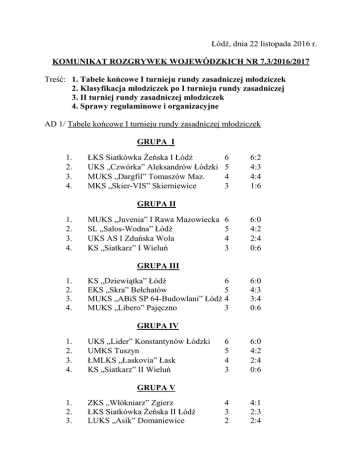 Łódź, dnia 22 listopada 2016 r. KOMUNIKAT ROZGRYWEK WOJEWÓDZKICH NR 7.3/2016/2017 Treść: 1. Tabele końcowe I turnieju rundy zasadniczej młodziczek 2. Klasyfikacja młodziczek po I turnieju rundy zasadniczej 3. II turniej rundy zasadniczej młodziczek 4. Sprawy regulaminowe i organizacyjne AD 1/ Tabele końcowe I turnieju rundy zasadniczej młodziczek GRUPA I 1. 2. 3. 4. ŁKS Siatkówka Żeńska I Łódź UKS „Czwórka” Aleksandrów Łódzki MUKS „Dargfil” Tomaszów Maz. MKS „Skier-VIS” Skierniewice 6 5 4 3 6:2 4:3 4:4 1:6 6 5 4 3 6:0 4:2 2:4 0:6 KS „Dziewiątka” Łódź 6 EKS „Skra” Bełchatów 5 MUKS „ABiS SP 64-Budowlani” Łódź 4 MUKS „Libero” Pajęczno 3 6:0 4:3 3:4 0:6 GRUPA II 1. 2. 3. 4. MUKS „Juvenia” I Rawa Mazowiecka SL „Salos-Wodna” Łódź UKS AS I Zduńska Wola KS „Siatkarz” I Wieluń GRUPA III 1. 2. 3. 4. GRUPA IV 1. 2. 3. 4. UKS „Lider” Konstantynów Łódzki UMKS Tuszyn ŁMLKS „Łaskovia” Łask KS „Siatkarz” II Wieluń 6 5 4 3 6:0 4:2 2:4 0:6 4 3 2 4:1 2:3 2:4 GRUPA V 1. 2. 3. ZKS „Włókniarz” Zgierz ŁKS Siatkówka Żeńska II Łódź LUKS „Asik” Domaniewice GRUPA VI 1. 2. 3. UKS „Volley 34” Łódź LUKS „Czarni” Szczerców UKS Ozorków 4 3 2 4:0 2:2 0:4 MKS 16 Łódź 4 MUKS „Juvenia” II Rawa Mazowiecka 3 UKS AS II Zduńska Wola 2 4:0 2:2 0:4 GRUPA VII 1. 2. 3. Wyniki wszystkich spotkań zostały zweryfikowane zgodnie z protokółami. AD 2/ Klasyfikacja młodziczek po I turnieju rundy zasadniczej 1. 2. 3. 4. 5. 6. 7. 8. 9. 10. 11. 12. 13. 14. 15. 16. 17. 18. 19. 20. 21. 22. 23. 24. 25. Zespół pkt. za I turniej ŁKS Siatkówka Żeńska I Łódź 25 UKS „Czwórka” Aleksandrów Łódzki 24 MUKS „Dargfil” Tomaszów Maz. 23 MKS „Skier-VIS” Skierniewice 22 MUKS „Juvenia” I Rawa Mazowiecka 21 SL „Salos-Wodna” Łódź 20 UKS AS I Zduńska Wola 19 KS „Siatkarz” I Wieluń 18 KS „Dziewiątka” Łódź 17 EKS „Skra” Bełchatów 16 MUKS „ABiS SP 64-Budowlani” Łódź 15 MUKS „Libero” Pajęczno 14 UKS „Lider” Konstantynów Łódzki 13 UMKS Tuszyn 12 ŁMLKS „Łaskovia” Łask 11 KS „Siatkarz” II Wieluń 10 ZKS „Włókniarz” Zgierz 9 ŁKS Siatkówka Żeńska II Łódź 8 LUKS „Asik” Domaniewice 7 UKS „Volley 34” Łódź 6 LUKS „Czarni” Szczerców 5 UKS Ozorków 4 MKS 16 Łódź 3 MUKS „Juvenia” II Rawa Mazowiecka 2 UKS AS II Zduńska Wola 1 Suma 25 24 23 22 21 20 19 18 17 16 15 14 13 12 11 10 9 8 7 6 5 4 3 2 1 AD 2/ II turniej rundy zasadniczej młodziczek a/ termin i skład grup II turnieju rundy zasadniczej Zgodnie z komunikatem rozgrywek wojewódzkich nr 7.1/2016/2017 z dnia 30 września 2016 r. pkt. 1.a.2 oraz 1.b.1, turniej zostanie rozegrany w dniu: 4 grudnia 2016 r. (niedziela), natomiast skład grup II turnieju rundy zasadniczej przedstawia się następująco: Grupa I 1. 2. 3. 4. ŁKS Siatkówka Żeńska I Łódź – gospodarz turnieju UKS „Czwórka” Aleksandrów Łódzki MUKS „Dargfil” Tomaszów Mazowiecki MUKS „Juvenia” I Rawa Mazowiecka Grupa II 1. 2. 3. 4. MKS „Skier-VIS” Skierniewice SL „Salos-Wodna” Łódź – gospodarz turnieju UKS AS I Zduńska Wola KS „Dziewiątka” Łódź Grupa III 1. 2. 3. 4. KS „Siatkarz” I Wieluń EKS „Skra” Bełchatów MUKS „ABiS SP 64-Budowlani” Łódź UKS „Lider” Konstantynów Łódzki – gospodarz turnieju Grupa IV 1. 2. 3. 4. MUKS „Libero” Pajęczno UMKS Tuszyn ŁMLKS „Łaskovia” Łask ZKS „Włókniarz” Zgierz – gospodarz turnieju Grupa V 1. KS „Siatkarz” II Wieluń 2. ŁKS Siatkówka Żeńska II Łódź 3. UKS „Volley 34” Łódź – gospodarz turnieju Grupa VI 1. LUKS „Asik” Domaniewice – gospodarz turnieju 2. LUKS „Czarni” Szczerców 3. MKS 16 Łódź Grupa VII 1. UKS Ozorków 2. MUKS „Juvenia” II Rawa Mazowiecka 3. UKS AS II Zduńska Wola – gospodarz turnieju b/ Kolejność i rozkład spotkań: − w przypadku turnieju 4-zespołowego: 1-4, 2-3, 4-3, 1-2, 2-4, 3-1 − w przypadku turnieju 3-zespołowego: 2-3, 1-2, 3-1 Ad. 3/ Sprawy regulaminowe i organizacyjne a/ w sprawach nieujętych w niniejszym komunikacie obowiązują regulacje zawarte w Regulaminie Rozgrywek ŁZPS, Komunikacie Organizacyjnym na sezon 2016/2017 oraz Komunikacie Rozgrywek nr 7.1/2016/2017. b/ niniejszy komunikat oraz wszystkie następne dot. rozgrywek młodziczek należy udostępnić sędziom głównym zawodów. Przewodniczący Wydziału Gier i Ewidencji ŁZPS Piotr Bilkowski