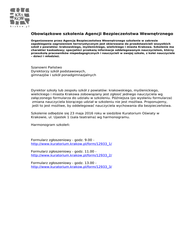 Obowiązkowe szkolenia Agencji Bezpieczeństwa Wewnętrznego Organizowane przez Agencję Bezpieczeństwa Wewnętrznego szkolenie w zakresie zapobiegania zagrożeniom terrorystycznym jest skierowane do przedstawicieli wszystkich szkół z powiatów: krakowskiego, myślenickiego, wielickiego i miasta Krakowa. Szkolenie ma charakter kaskadowy; specjaliści przekażą informacje oddelegowanym nauczycielom, którzy przeszkolą pracowników niepedagogicznych i nauczycieli w swojej szkole, z kolei nauczyciele – dzieci i młodzież. Szanowni Państwo Dyrektorzy szkół podstawowych, gimnazjów i szkół ponadgimnazjalnych Dyrektor szkoły lub zespołu szkół z powiatów: krakowskiego, myślenickiego, wielickiego i miasta Krakowa zobowiązany jest zgłosić jednego nauczyciela wg załączonego formularza do udziału w szkoleniu. Późniejsza (po wysłaniu formularza) zmiana nauczyciela biorącego udział w szkoleniu nie jest możliwa. Proponujemy, jeśli to jest możliwe, by oddelegować nauczyciela wychowania dla bezpieczeństwa. Szkolenie odbędzie się 23 maja 2016 roku w siedzibie Kuratorium Oświaty w Krakowie, ul. Ujastek 1 (sala teatralna) wg harmonogramu. Harmonogram szkoleń: Formularz zgłoszeniowy - godz. 9.00 http://www.kuratorium.krakow.pl/form/12933_1/ Formularz zgłoszeniowy - godz. 11.00 http://www.kuratorium.krakow.pl/form/12933_2/ Formularz zgłoszeniowy - godz. 13.00 http://www.kuratorium.krakow.pl/form/12933_3/ Powered by TCPDF (www.tcpdf.org)