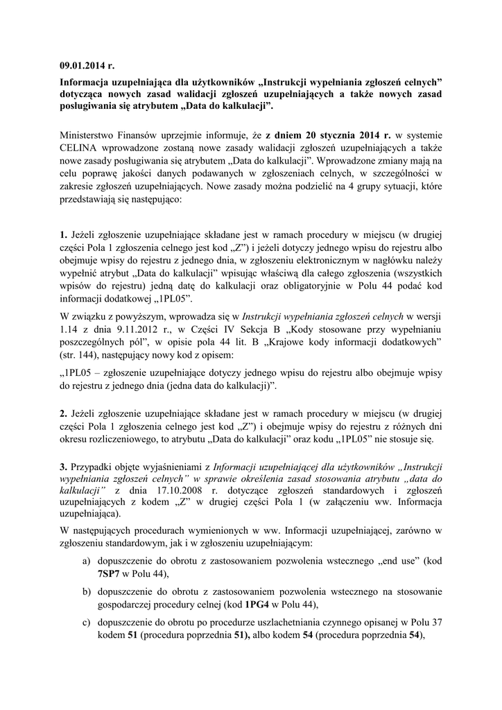 09.01.2014 r. Informacja uzupełniająca dla uŜytkowników „Instrukcji wypełniania zgłoszeń celnych” dotycząca nowych zasad walidacji zgłoszeń uzupełniających a takŜe nowych zasad posługiwania się atrybutem „Data do kalkulacji”. Ministerstwo Finansów uprzejmie informuje, Ŝe z dniem 20 stycznia 2014 r. w systemie CELINA wprowadzone zostaną nowe zasady walidacji zgłoszeń uzupełniających a takŜe nowe zasady posługiwania się atrybutem „Data do kalkulacji”. Wprowadzone zmiany mają na celu poprawę jakości danych podawanych w zgłoszeniach celnych, w szczególności w zakresie zgłoszeń uzupełniających. Nowe zasady moŜna podzielić na 4 grupy sytuacji, które przedstawiają się następująco: 1. JeŜeli zgłoszenie uzupełniające składane jest w ramach procedury w miejscu (w drugiej części Pola 1 zgłoszenia celnego jest kod „Z”) i jeŜeli dotyczy jednego wpisu do rejestru albo obejmuje wpisy do rejestru z jednego dnia, w zgłoszeniu elektronicznym w nagłówku naleŜy wypełnić atrybut „Data do kalkulacji” wpisując właściwą dla całego zgłoszenia (wszystkich wpisów do rejestru) jedną datę do kalkulacji oraz obligatoryjnie w Polu 44 podać kod informacji dodatkowej „1PL05”. W związku z powyŜszym, wprowadza się w Instrukcji wypełniania zgłoszeń celnych w wersji 1.14 z dnia 9.11.2012 r., w Części IV Sekcja B „Kody stosowane przy wypełnianiu poszczególnych pól”, w opisie pola 44 lit. B „Krajowe kody informacji dodatkowych” (str. 144), następujący nowy kod z opisem: „1PL05 – zgłoszenie uzupełniające dotyczy jednego wpisu do rejestru albo obejmuje wpisy do rejestru z jednego dnia (jedna data do kalkulacji)”. 2. JeŜeli zgłoszenie uzupełniające składane jest w ramach procedury w miejscu (w drugiej części Pola 1 zgłoszenia celnego jest kod „Z”) i obejmuje wpisy do rejestru z róŜnych dni okresu rozliczeniowego, to atrybutu „Data do kalkulacji” oraz kodu „1PL05” nie stosuje się. 3. Przypadki objęte wyjaśnieniami z Informacji uzupełniającej dla uŜytkowników „Instrukcji wypełniania zgłoszeń celnych” w sprawie określenia zasad stosowania atrybutu „data do kalkulacji” z dnia 17.10.2008 r. dotyczące zgłoszeń standardowych i zgłoszeń uzupełniających z kodem „Z” w drugiej części Pola 1 (w załączeniu ww. Informacja uzupełniająca). W następujących procedurach wymienionych w ww. Informacji uzupełniającej, zarówno w zgłoszeniu standardowym, jak i w zgłoszeniu uzupełniającym: a) dopuszczenie do obrotu z zastosowaniem pozwolenia wstecznego „end use” (kod 7SP7 w Polu 44), b) dopuszczenie do obrotu z zastosowaniem pozwolenia wstecznego na stosowanie gospodarczej procedury celnej (kod 1PG4 w Polu 44), c) dopuszczenie do obrotu po procedurze uszlachetniania czynnego opisanej w Polu 37 kodem 51 (procedura poprzednia 51), albo kodem 54 (procedura poprzednia 54), d) dopuszczenie do obrotu po procedurze odprawy czasowej (procedura poprzednia 53), - naleŜy wypełnić atrybut „Data do kalkulacji”, ale jednocześnie niedopuszczalne jest podanie dla wszystkich ww. przypadków kodu 1PL05 w Polu 44; e) dopuszczenie do obrotu towarów objętych uprzednio procedurą składu celnego w składzie celnym typu D lub typu E z elementami typu D, z zastosowaniem art. 112 ust. 3 Wspólnotowego Kodeksu Celnego w zw. z art. 525 ust. 2 lit. a Rozporządzenia Wykonawczego, - wypełnienie atrybutu „Data do kalkulacji” jest opcjonalne dla zgłaszającego (pozostawione jest do jego decyzji), ale jednocześnie niedopuszczalne jest podanie kodu 1PL05 w Polu 44. W omawianych sytuacjach, przez dopuszczenie do obrotu rozumie się nie tylko kod procedury 40, ale takŜe inne kody procedur wiąŜące się z dopuszczeniem do obrotu, jak np. 42, 45. Natomiast z zakresu ww. Informacji uzupełniającej wyłączony został przypadek dopuszczenia do obrotu z retrospektywnym zastosowaniem kontyngentów. Jest to uzasadnione tym, Ŝe wniosek taki, czyli retrospektywny wniosek o zaliczenie towarów na poczet kontyngentu taryfowego rozdysponowywanego zgodnie z chronologicznym porządkiem przyjmowania zgłoszeń do procedury dopuszczenia do obrotu oraz rozstrzygnięcie organu celnego w tej sprawie dokonywane jest poza systemem CELINA i dotyczy kontyngentu, który obowiązywał w dniu przyjęcia zgłoszenia celnego, którego wniosek dotyczy. W związku z powyŜszym w tym przypadku nie ma zastosowania atrybut „Data do kalkulacji”. 4. Dla potrzeb zgłoszeń uzupełniających składanych w wyniku zastosowania zgłoszenia uproszczonego albo niekompletnego (procedura uproszczona, o której mowa w art. 76 ust. 1 lit. a i b WKC) niezmienna pozostaje zasada, Ŝe jeŜeli w drugiej części Pola 1 zgłoszenia celnego jest kod X albo Y, naleŜy wypełnić atrybut „Data do kalkulacji” właściwy na dzień złoŜenia zgłoszenia uproszczonego albo niekompletnego – kod 1PL05 nie ma tutaj zastosowania. W przypadkach opisanych w pkt 1, 3 i 4 gdyby zgłaszający zdecydował się lub, ze względu np. na awarię systemu, zmuszony był złoŜyć zgłoszenie standardowe lub uzupełniające w formie papierowej, to dla potrzeb wskazania „Daty do kalkulacji”, po kodzie informacji dodatkowej 4PL02 wpisywanym w polu 44 zgłoszenia naleŜy podać datę w formacie „RRRR/MM/DD”. Sporządzono w Departamencie Polityki Celnej, Warszawa, dnia 09.01.2014 r.