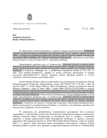 Pan Stanisław Rachwał Radny Miasta Krakowa W odpowiedzi na Pana interpelację w sprawie wykupu mieszkania przez [wyłączenie jawności w zakresie danych osobowych; na podstawie art. 5 ust. 2 ustawy z dnia 6 września 2001r. o dostępie do informacji publicznej; jawność wyłączył Ryszard Marek Pełnomocnik Prezydenta Miasta Krakowa ds. Ochrony Informacji Niejawnych], zgłoszoną na sesji Rady Miasta Krakowa w dniu 26 marca 2014 r., uprzejmie informuję. Nieruchomość położona przy ul. Krakowskiej [wyłączenie jawności w zakresie danych osobowych; na podstawie art. 5 ust. 2 ustawy z dnia 6 września 2001r. o dostępie do informacji publicznej; jawność wyłączył Ryszard Marek Pełnomocnik Prezydenta Miasta Krakowa ds. Ochrony Informacji Niejawnych] w Krakowie, składająca się z zabudowanej budynkiem działki nr 78 w obr. 14 jedn. ewid. Kraków-Śródmieście, zgodnie ze stanem prawnym ujawnionym w księdze wieczystej KR1P/00415525/3 stanowi własność Gminy Miejskiej Kraków w 12/192 częściach i osób fizycznych w pozostałej części. Gmina Miejska Kraków stała się właścicielem tej nieruchomości na podstawie decyzji komunalizacyjnej Wojewody Małopolskiego numer RR.VIII.SJ.7723-1-457-04 z dnia 28 stycznia 2005 r. Z kolei Skarb Państwa nabył przedmiotowy udział na podstawie decyzji Ministra Finansów z dnia 25 lipca 2000 r. numer BR-5/ZN/UO-32/2076/2000 w miejsce [wyłączenie jawności w zakresie danych osobowych; na podstawie art. 5 ust. 2 ustawy z dnia 6 września 2001r. o dostępie do informacji publicznej; jawność wyłączył Ryszard Marek Pełnomocnik Prezydenta Miasta Krakowa ds. Ochrony Informacji Niejawnych] . Okoliczność posiadania przez Gminę Miejską Kraków 12/192 części nieruchomości położonej przy ul. Krakowskiej [wyłączenie jawności w zakresie danych osobowych; na podstawie art. 5 ust. 2 ustawy z dnia 6 września 2001r. o dostępie do informacji publicznej; jawność wyłączył Ryszard Marek Pełnomocnik Prezydenta Miasta Krakowa ds. Ochrony Informacji Niejawnych] w Krakowie nie oznacza, iż Gmina jest wyłącznym właścicielem któregokolwiek z lokali usytuowanych w przedmiotowym budynku i w związku z tym aktualnie sprzedaż tych lokali na rzecz najemców nie jest możliwa. W odniesieniu do przedmiotowej nieruchomości prowadzone były czynności wyjaśniające w celu ustalenia możliwości zniesienia jej współwłasności poprzez ustanowienie odrębnej własności lokali. Postępowanie to prowadzone było w związku z wnioskami najemców o wykup zajmowanych lokali mieszkalnych złożonymi w oparciu o przepisy poprzednio obowiązującej uchwały nr XXII/190/03 Rady Miasta Krakowa z dnia 27 sierpnia 2003 r. w sprawie zasad zbywania lokali mieszkalnych stanowiących własność Gminy Miejskiej Kraków (z późn. zm.), aktualnie zastąpionej przepisami uchwały nr L/654/08 Rady Miasta Krakowa z dnia 10 września 2008 r. w sprawie zasad znoszenia współwłasności zabudowanych budynkami wielolokalowymi nieruchomości, stanowiących w części własność Gminy Miejskiej Kraków. W toku prowadzonego postępowania w sprawie nieruchomości położonej przy ul. Krakowskiej [wyłączenie jawności w zakresie danych osobowych; na podstawie art. 5 ust. 2 ustawy z dnia 6 września 2001r. o dostępie do informacji publicznej; jawność wyłączył Ryszard Marek Pełnomocnik Prezydenta Miasta Krakowa ds. Ochrony Informacji Niejawnych] w Krakowie wnioski o wykup, oprócz wniosku [wyłączenie jawności w zakresie danych osobowych; na podstawie art. 5 ust. 2 ustawy z dnia 6 września 2001r. o dostępie do informacji publicznej; jawność wyłączył Ryszard Marek Pełnomocnik Prezydenta Miasta Krakowa ds. Ochrony Informacji Niejawnych] , zostały złożone przez 10 najemców lokali mieszkalnych. Aktualnie nie są podejmowane żadne czynności w przedmiocie zniesienia współwłasności tej nieruchomości, bowiem w celu dokonania podziału rzeczy wspólnej konieczne jest pozyskanie stanowisk w tym zakresie pozostałych współwłaścicieli nieruchomości, w przypadku zaś braku takiej możliwości (co ma miejsce w przedmiotowej sprawie ) - ustalenie aktualnego kręgu współwłaścicieli. W odniesieniu do nieruchomości przy ul. Krakowskiej [wyłączenie jawności w zakresie danych osobowych; na podstawie art. 5 ust. 2 ustawy z dnia 6 września 2001r. o dostępie do informacji publicznej; jawność wyłączył Ryszard Marek Pełnomocnik Prezydenta Miasta Krakowa ds. Ochrony Informacji Niejawnych] w Krakowie prowadzone są aktualnie czynności mające na celu uregulowanie jej stanu prawnego. Prokuratoria Generalna Skarbu Państwa w lutym 2010 r. skierowała do sądu powszechnego wniosek o zasiedzenie prawa własności udziałów w nieruchomości położonej przy ul. Krakowskiej [wyłączenie jawności w zakresie danych osobowych; na podstawie art. 5 ust. 2 ustawy z dnia 6 września 2001r. o dostępie do informacji publicznej; jawność wyłączył Ryszard Marek Pełnomocnik Prezydenta Miasta Krakowa ds. Ochrony Informacji Niejawnych] w Krakowie, stanowiących własność osób fizycznych. Ponadto w Departamencie Finansów Resortu Ministerstwa Finansów prowadzone jest postępowanie administracyjne w przedmiocie stwierdzenia przejścia na rzecz Skarbu Państwa udziału w wysokości 9/64 części, za które w ramach polsko-amerykańskiego układu indemnizacyjnego przyznano odszkodowanie [wyłączenie jawności w zakresie danych osobowych; na podstawie art. 5 ust. 2 ustawy z dnia 6 września 2001r. o dostępie do informacji publicznej; jawność wyłączył Ryszard Marek Pełnomocnik Prezydenta Miasta Krakowa ds. Ochrony Informacji Niejawnych] . W tym stanie rzeczy z uwagi na prejudycjalny (wstępny) charakter postępowania o zasiedzenie w stosunku do postępowania o zniesienie współwłasności nieruchomości, opisane wyżej czynności mające na celu dokonanie podziału rzeczy wspólnej nie będą kontynuowane do czasu zakończenia postępowani