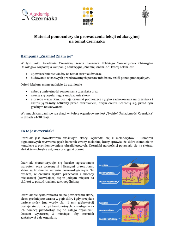 Materia pomocniczy do prowadzenia lekcji edukacyjnej na temat czerniaka Kampania „Znami Znam je?” tym roku Akademia Czerniaka, sekcja naukowa Polskiego Towarzystwa Chirurgów Onkologów rozpocz kampani edukacyjn „Znami Znam je?”, której celem jest upowszechnienie wiedzy na temat czerniaków oraz budowanie ciwych prozdrowotnych postaw odzie Dzi ki lekcjom, mamy nadziej szkó ponadgimnazjalnych. uczniowie nab umiej tno ci rozpoznania czerniaka oraz naucz si regularnego samobadania skóry przede wszystkim, poznaj czynniki podnosz ce ryzyko zachorowania na czerniaka zastosuj zasady ochrony przed czerniakiem, dzi ki czemu uchroni si przed tym gro nym nowotworem. ramach kampanii po raz drugi dniach 24-30 maja. Polsce organizowany jest „Tydzie wiadomo ci Czerniaka” Co to jest czerniak? Czerniak jest nowotworem liwym skóry. Wywodzi si melanocytów komórek pigmentowych wytwarzaj cych barwnik zwany melanin który sprawia, skóra ciemnieje kontakcie promieniowaniem ultrafioletowych. Czerniaki najcz ciej pojawiaj si na skórze, ale tak obr bie ust, nosa oraz ga ki ocznej. Czerniak charakteryzuje si bardzo agresywnym wzrostem oraz wczesnymi licznymi przerzutami, które trudne leczeniu farmakologicznym. To oznacza, czerniak szybko przechodzi choroby miejscowej (rozwijaj cej si jednym miejscu na skórze) posta rozsian tzw. uogólnion Czerniak nie tylko rozrasta si na powierzchni skóry, ale co gro niejsze wrasta skóry gdy przejdzie barier skóry (ma wtedy ok. mm boko ci) dostaje si do naczy krwiono nych, nast pnie za ich pomoc przedostaje si do ca ego organizmu. Czasem wystarcz miesi ce, aby czerniak zaatakowa ca organizm. Jednak, usuni cie czerniaka miejscowego, kiedy choroba nie jest jeszcze zaawansowana pozwala na wyleczenie nawet 80% chorych. Dlatego tak wa ne jest szybkie prawid owe rozpoznanie tego nowotworu. Czerniak jest nowotworem, który atwo dostrzec, gdy rozwija si na skórze, nie wewn trz organizmu. Czerniak mo pojawi si kilku miejscach na ciele. Jedno ognisko choroby nie wyklucza pojawiania si kilku innych nawet je li czerniak nie jest rozsiany. Czerniak to najcz ciej nowa zmiana na skórze. Jednak cze „zrakowie czyli zamieni si czerniaka. Wyst powanie czerniaka zwyk ych znamion mo Polsce Polsce co roku odnotowuje si oko 50 000 przypadków nowych zachorowa na nowotwory skóry, tym 3000 zachorowa na czerniaki. Czerniak jest najbardziej agresywnym nowotworem skóry jednym najbardziej agresywnych nowotworów ogóle. Czerniak stanowi tylko 6% wszystkich nowotworów skóry, ale 80% chorych na czerniaki umiera powodu choroby. redni czas prze ycia od momentu diagnozy to 6-8 miesi cy. Liczba zachorowa na czerniaka Polsce podwaja si co 10 lat. Najcz ciej na czerniaki choruj czy ni wieku ok. 50 lat jest to wynik wieloletniej niew ciwej ekspozycje na ce. Czerniak jest jednym najcz stszych nowotworów wyst puj cych ród nastolatków, którzy cz sto korzystaj solarium, nie stosuj filtrów onecznych przebywaj na cu godzinach najwy szego promieniowania. Kto jest grupie ryzyka zachorowania na czerniaka? Oko 25% Polaków ma jasn onecznym to osoby, które lub bardzo jasn karnacj która atwo ulega poparzeniom ciwie ogóle nie powinny korzysta pieli onecznych. Dodatkowo ok. 40% Polaków ma jasn karnacj która, mimo jest bardziej odporna na promieniowanie oneczne, nadal jest fenotypem skóry, który mie ci nasz naród grupie wysokim stopniu ryzyka zachorowania na czerniaka. Osoby najbardziej nara one na rozwój czerniaka to osoby: jasnych rudych osach, jasnych oczach, jasnej lub bardzo jasnej cerze, piegami i/lub znamionami, które atwo ulegaj poparzeniom onecznym, abo toleruj ce, opalaj si du ym trudem lub ogóle których rodzinie wyst powa czerniak. Osoby te bezwzgl dnie powinny unika ca oraz ca kowicie zrezygnowa solarium. Grup szczególnie nara on na poparzenia oneczne dzieci. Ich skóra nie jest jeszcze dojrza nie potrafi obroni si przed silnym promieniowaniem onecznym. Poparzenia oneczne ród dzieci, które niestety nie rzadkie, podnosz dwukrotnie ryzyko zachorowania na czerniaka przysz ci. Jak wygl da czerniak, czyli ABCDE Czerniaka? Badanie opinii publicznej TNS OBOP zrealizowane przez Akademi Czerniaka 2013 roku wskazuj 30% Polaków, którym pokazano zdj cie czerniaka nie rozpozna oby nowotworu nie uda oby si do lekarza, aby zbada znami Dlatego warto zna cechy czerniaka okre lane za pomoc kryteriów ABCDE: A. B. C. D. E. asymetria np. znami „wylewaj ce” si na jedn stron brzegi poszarpane, nierównomierne, posiadaj ce zgrubienia, czerwony lub czarny niejednolity kolor du rozmiar, wielko zmiany powy ej 0,5 cm, ewolucja, czyli post puj ce zmiany zachodz ce znamieniu. Wszystkie znamiona, naro la, pieprzyki, które maj te cechy powinny zosta zbadane przez lekarza dermatologa lub chirurga onkologa razie jakichkolwiek tpliwo ci wyci te. Sw dzenie, krwawienie kanie znamienia, jest sygna em alarmowym do natychmiastowej konsultacji. Sprawd czy rozpoznasz czerniaka Warto sprawdzi swoj wiedz oraz czujno przechodz przez krótki internetowy quiz „Znami Znam je?”. Gra przedstawia sze ró nych znamion rol gracza jest sprawdzi czy prawid owo odró nia czerniaka od niegro nych zmian skórnych. Gra dost pna jest na stronie www Akademii Czerniaka: http://www.akademiaczerniaka.pl/kampania-znamie-znam-je/gra-interaktywna/ Samobadanie skóry pierwszy krok zmianie zachowa Badania opinii Polaków przeprowadzone kwietniu 2013 roku wykaza y, 14% badanych ogóle nie zwraca uwagi na znamiona, 32% deklaruje, nie ma adnych podejrzanych zmian. To oznacza, blisko po owa badanych Polaków (46%) nie obserwuje skóry lub nie zwraca uwagi na znamiona. Kluczem wczesnego rozpoznania czerniaka jest dobra znajomo asnego cia skóry. Samoocena skóry powinna by wykonywana raz miesi cu zarówno przez osoby starsze jak odzie Po wi cie kilka minut, aby pozna Kamil Dawida oraz przej szybki kurs samooceny skóry: http://www.akademiaczerniaka.pl/kampaniaznamie-znam-je/program-do-szkolponadgimnazjalnych/film-edukacyjny-dlau