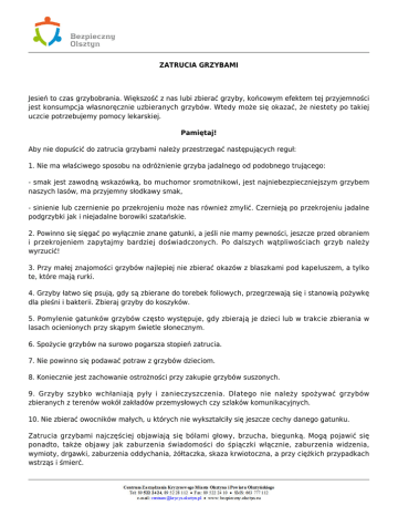 ZATRUCIA GRZYBAMI Jesień to czas grzybobrania. Większość z nas lubi zbierać grzyby, końcowym efektem tej przyjemności jest konsumpcja własnoręcznie uzbieranych grzybów. Wtedy może się okazać, że niestety po takiej uczcie potrzebujemy pomocy lekarskiej. Pamiętaj! Aby nie dopuścić do zatrucia grzybami należy przestrzegać następujących reguł: 1. Nie ma właściwego sposobu na odróżnienie grzyba jadalnego od podobnego trującego: - smak jest zawodną wskazówką, bo muchomor sromotnikowi, jest najniebezpieczniejszym grzybem naszych lasów, ma przyjemny słodkawy smak, - sinienie lub czernienie po przekrojeniu może nas również zmylić. Czernieją po przekrojeniu jadalne podgrzybki jak i niejadalne borowiki szatańskie. 2. Powinno się sięgać po wyłącznie znane gatunki, a jeśli nie mamy pewności, jeszcze przed obraniem i przekrojeniem zapytajmy bardziej doświadczonych. Po dalszych wątpliwościach grzyb należy wyrzucić! 3. Przy małej znajomości grzybów najlepiej nie zbierać okazów z blaszkami pod kapeluszem, a tylko te, które mają rurki. 4. Grzyby łatwo się psują, gdy są zbierane do torebek foliowych, przegrzewają się i stanowią pożywkę dla pleśni i bakterii. Zbieraj grzyby do koszyków. 5. Pomylenie gatunków grzybów często występuje, gdy zbierają je dzieci lub w trakcie zbierania w lasach ocienionych przy skąpym świetle słonecznym. 6. Spożycie grzybów na surowo pogarsza stopień zatrucia. 7. Nie powinno się podawać potraw z grzybów dzieciom. 8. Koniecznie jest zachowanie ostrożności przy zakupie grzybów suszonych. 9. Grzyby szybko wchłaniają pyły i zanieczyszczenia. Dlatego nie należy spożywać grzybów zbieranych z terenów wokół zakładów przemysłowych czy szlaków komunikacyjnych. 10. Nie zbierać owocników małych, u których nie wykształciły się jeszcze cechy danego gatunku. Zatrucia grzybami najczęściej objawiają się bólami głowy, brzucha, biegunką. Mogą pojawić się ponadto, także objawy jak zaburzenia świadomości do śpiączki włącznie, zaburzenia widzenia, wymioty, drgawki, zaburzenia oddychania, żółtaczka, skaza krwiotoczna, a przy ciężkich przypadkach wstrząs i śmierć. Należy pamiętać, iż w przypadku wystąpienie jakichkolwiek niepokojących objawów, które pojawiły się po zjedzeniu grzybów powinniśmy jak najszybciej skontrolować się z lekarzem, ponieważ często tylko w porę udzielona pomoc może uratować nam życie. Pamiętajmy, że przy zatruciach muchomorem sromotnikowym występuje faza pozornej poprawy, po której nasz stan może się gwałtownie pogorszyć. Nie lekceważmy objawów Postępowanie przy podejrzeniu zatruciu grzybami: 1. Natychmiast opróżnić żołądek. Pić ciepłą wodę z solą(dorośli) dzieci wodę(bez soli) i spowodować wymioty. 2. W żadnym razie nie zażywać środków przeczyszczających, żadnych leków, alkoholu czy mleka. 3. Natychmiast zapewnić pomoc lekarską, lub odwieźć chorego do szpitala. 4. Zabezpieczyć resztki pozostałe z czyszczenia grzybów, resztki jedzenia, pozwoli to na precyzyjną diagnozę. 5. Jeżeli oznaki zatrucia występują bardzo późno, najczęściej dopiero po 10 lub 11 godzinach po posiłku, istnieje wówczas podejrzenie zatrucia muchomorem sromotnikowym, wiosennym lub jadowitym, możliwym do neutralizacji tylko w specjalistycznych klinikach. 6. Również przy objawiających się zatruciach, wskazujących na spożycie grzybów nie zagrażających życiu, należy natychmiast zapewnić pomoc lekarską.( nie można wykluczyć, iż w posiłku nie znalazły się trujące grzyby, które zadziałają dopiero późno) 7. Najgroźniejsze jest zatrucie muchomorem sromotnikowym, który często jest mylony z sową !!! Pamiętaj! . Do zatrucia dochodzi zazwyczaj po spożyciu nieznanych grzybów, lub wskutek mylnego zaliczenia grzybów trujących do jadalnych, nieprawidłowego przyrządzenia oraz z powodu nadwrażliwości na grzyby jadalne.