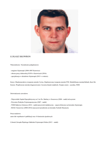 ŁUKASZ SKOWRON Wykształcenie / Kształcenie podyplomowe - magister fizjoterapii (2004 AWF Katowice) - obrona pracy doktorskiej SUM w Katowicach (2016) - specjalizacja w dziedzinie fizjoterapii (2015- w trakcie) Kursy: Międzynarodowy terapeuta metody Cyriax, Dyplomowany terapeuta metody PNF, Rehabilitacja metodą Bobath, Kurs Mc Kenzie, Współczesne metody diagnozowania i leczenia tkanek miękkich, Terapia cranio - sacralna, FDM Doświadczenie zawodowe - Wojewódzki Szpital Specjalistyczny nr.5 im Św. Barbary w Sosnowcu (2004 - nadal) mł.asystent - Prywatna Praktyka Fizjoterapeutyczna (2007 - nadal) - WSB Dąbrowa Górnicza (2014 - nadal) pracownik dydaktyczny - zajęcia kliniczne na kierunku fizjoterapia - RCKU Sosnowiec (2008-2016) nauczyciel przedmiotu na kierunku Technik Masażysta Praca naukowa: autor lub współautor 6 publikacji oraz 10 doniesień zjazdowych Członek Zarządu Śląskiego Oddziału Fizjoterapia Polska (2015 – nadal) Dlaczego chcę kandydować - Chcę bronić dobra i jakości polskiej fizjoterapii i polskich fizjoterapeutów - Wybrać najepszych i przygotowanych fizjoterapeutów do Krajowej Rady Fizjoterapeutów i Krajowej Izby Fizjoterapeutów