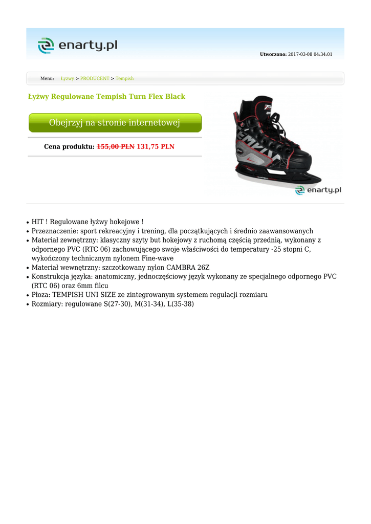 Utworzono: 2017-03-08 04:34:01 Menu: Łyżwy > PRODUCENT > Tempish Łyżwy Regulowane Tempish Turn Flex Black Obejrzyj na stronie internetowej Cena produktu: 155,00 PLN 131,75 PLN ● ● ● ● ● ● ● HIT ! Regulowane łyżwy hokejowe ! Przeznaczenie: sport rekreacyjny i trening, dla początkujących i średnio zaawansowanych Materiał zewnętrzny: klasyczny szyty but hokejowy z ruchomą częścią przednią, wykonany z odpornego PVC (RTC 06) zachowującego swoje właściwości do temperatury -25 stopni C, wykończony technicznym nylonem Fine-wave Materiał wewnętrzny: szczotkowany nylon CAMBRA 26Z Konstrukcja języka: anatomiczny, jednoczęściowy język wykonany ze specjalnego odpornego PVC (RTC 06) oraz 6mm filcu Płoza: TEMPISH UNI SIZE ze zintegrowanym systemem regulacji rozmiaru Rozmiary: regulowane S(27-30), M(31-34), L(35-38) Rodzaj Producent Hokejowe, Regulowane Tempish Typ Męskie, Dziecięce Kolor Czarny_#000000 Adres: www.erowery.pl [email protected] Adres: www.enarty.pl Telefon: 605 515 185, 34 361 16 71 Email: [email protected] Email: