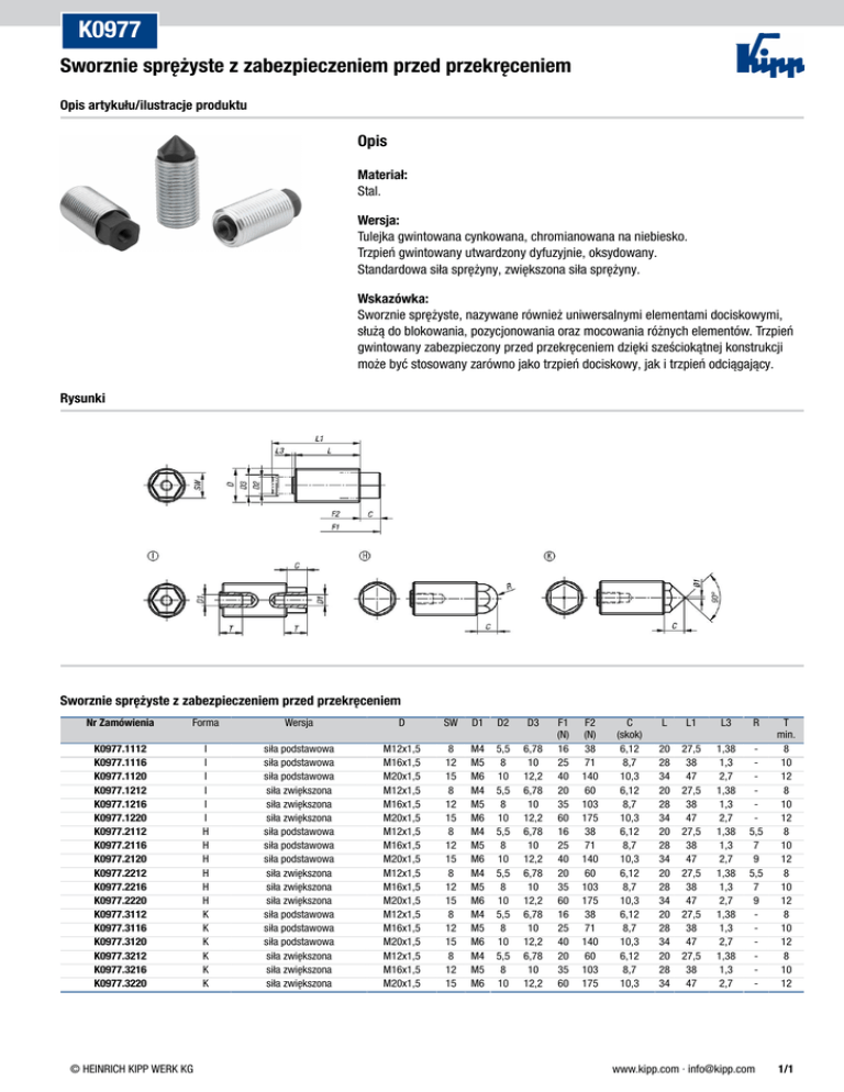 K0977 Sworznie sprężyste z zabezpieczeniem przed przekręceniem Opis artykułu/ilustracje produktu Opis Materiał: Stal. Wersja: Tulejka gwintowana cynkowana, chromianowana na niebiesko. Trzpień gwintowany utwardzony dyfuzyjnie, oksydowany. Standardowa siła sprężyny, zwiększona siła sprężyny. Wskazówka: Sworznie sprężyste, nazywane również uniwersalnymi elementami dociskowymi, służą do blokowania, pozycjonowania oraz mocowania różnych elementów. Trzpień gwintowany zabezpieczony przed przekręceniem dzięki sześciokątnej konstrukcji może być stosowany zarówno jako trzpień dociskowy, jak i trzpień odciągający. Rysunki Sworznie sprężyste z zabezpieczeniem przed przekręceniem Nr Zamówienia Forma Wersja D SW D1 D2 D3 K0977.1112 K0977.1116 K0977.1120 K0977.1212 K0977.1216 K0977.1220 K0977.2112 K0977.2116 K0977.2120 K0977.2212 K0977.2216 K0977.2220 K0977.3112 K0977.3116 K0977.3120 K0977.3212 K0977.3216 K0977.3220 I I I I I I H H H H H H K K K K K K siła podstawowa siła podstawowa siła podstawowa siła zwiększona siła zwiększona siła zwiększona siła podstawowa siła podstawowa siła podstawowa siła zwiększona siła zwiększona siła zwiększona siła podstawowa siła podstawowa siła podstawowa siła zwiększona siła zwiększona siła zwiększona M12x1,5 M16x1,5 M20x1,5 M12x1,5 M16x1,5 M20x1,5 M12x1,5 M16x1,5 M20x1,5 M12x1,5 M16x1,5 M20x1,5 M12x1,5 M16x1,5 M20x1,5 M12x1,5 M16x1,5 M20x1,5 8 12 15 8 12 15 8 12 15 8 12 15 8 12 15 8 12 15 M4 M5 M6 M4 M5 M6 M4 M5 M6 M4 M5 M6 M4 M5 M6 M4 M5 M6 5,5 8 10 5,5 8 10 5,5 8 10 5,5 8 10 5,5 8 10 5,5 8 10 6,78 10 12,2 6,78 10 12,2 6,78 10 12,2 6,78 10 12,2 6,78 10 12,2 6,78 10 12,2 © HEINRICH KIPP WERK KG F1 (N) 16 25 40 20 35 60 16 25 40 20 35 60 16 25 40 20 35 60 F2 (N) 38 71 140 60 103 175 38 71 140 60 103 175 38 71 140 60 103 175 C (skok) 6,12 8,7 10,3 6,12 8,7 10,3 6,12 8,7 10,3 6,12 8,7 10,3 6,12 8,7 10,3 6,12 8,7 10,3 L L1 L3 R 20 28 34 20 28 34 20 28 34 20 28 34 20 28 34 20 28 34 27,5 38 47 27,5 38 47 27,5 38 47 27,5 38 47 27,5 38 47 27,5 38 47 1,38 1,3 2,7 1,38 1,3 2,7 1,38 1,3 2,7 1,38 1,3 2,7 1,38 1,3 2,7 1,38 1,3 2,7 5,5 7 9 5,5 7 9 - www.kipp.com · [email protected] T min. 8 10 12 8 10 12 8 10 12 8 10 12 8 10 12 8 10 12 1/1