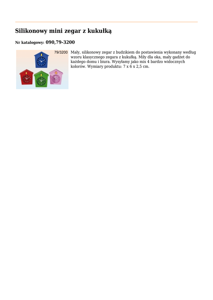 Silikonowy mini zegar z kukułką Nr katalogowy: 090,79-3200 Mały, silikonowy zegar z budzikiem do postawienia wykonany według wzoru klasycznego zegara z kukułką. Miły dla oka, mały gadżet do każdego domu i biura. Wysyłamy jako mix 4 bardzo widocznych kolorów. Wymiary produktu: 7 x 6 x 2,5 cm.