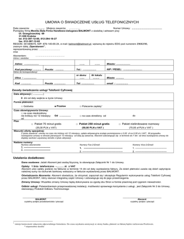UMOWA O ŚWIADCZENIE USŁUG TELEFONICZNYCH Data zawarcia: ….......... Miejsce zawarcia: …............. Numer Umowy: ............................................ Pomiędzy firmą Monika Bała Firma Handlowo-Usługowa BALMONT z siedzibą i adresem przy Ul. Grzegórzeckiej 69 31-559 Kraków tel. 012-397-12-00, 012-294-18-27 fax. 012-397-12-02 REGON: 351489070, NIP: 678-145-65-24, e-mail: [email protected], wpisaną do rejestru EDG pod numerem 29682/98, zwanym dalej „Operatorem”, reprezentowaną przez: …........................... oraz Abonentem: …....................................... Adres i siedziba: Adres: ….................. Kod pocztowy: …........ ….... Poczta: …........ ….... Miasto: …................. Tel.: …................ NIP / PESEL: …........................ nr domu …... Miasto …........ Adres do korespondencji: Ulica : …............... Kod …........... Poczta …............. Nr lokalu …...... Tel: …............... email : ….............. Zasady świadczenia usługi Telefonii Cyfrowej Data aktywacji ( …...........) 0 dni od daty wejścia w życie Umowy Forma płatności: □ Gotówka Czas obowiązywania Umowy: □ na czas nieokreślony nie krótszy niż 12 miesięcy od Plan ■ Przelew □ Polecenie zapłaty1 Od …............. □ na czas określony od □ Pakiet 70 minut gratis (35,00 PLN z VAT) Warunki oferty specjalnej: □ Pakiet 250 minut gratis do □ Pakiet nielimitowane rozmowy (50,00 PLN z VAT ) (70,00 zł PLN z VAT ) Z tytułu zawarcia umowy na czas nie krótszy niż 12 miesięcy, opłata aktywacyjna zostaje pomniejszona z 0,00 zł na 0,00 zł z VAT,. W przypadku rozwiązania umowy w okresie pierwszych 12 miesięcy od daty jej zawarcia, Abonent zobowiązuje się w terminie do 7 dni od dnia rozwiązania umowy do dopłaty wartości uzyskanej obniżki z tytułu aktywacji. Nadane numery: Numery abonenckie: Numery Fax-2-Email: Numery Vice-2-Email: 1. -------------------------------2. -------------------------------- 1. ----------------------------------------------- 1. -------------------------------------- 2. ------------------------------------------------- 2. -------------------------------------- Ustalenia dodatkowe: Dane osobowe: Jeżeli Abonent jest osobą fizyczną, to obowiązuje Załącznik Nr 1 do Umowy. Opłaty: 1 linia telefoniczna -........... zł. z VAT Abonent uiści opłaty podane na fakturze w terminie 14 dni od daty wystawienia faktury. Za dzień płatności uważa się dzień wpłynięcia należnej sumy na rachunek bankowy wskazany w fakturze wystawionej przez BALMONT. Oświadczenie Abonenta: Abonent oświadcza, że otrzymał, zapoznał się i akceptuje Regulamin wykonywania usług Telefonii Cyfrowej przez BALMONT, który stanowi integralną część Umowy i zobowiązuje się do jego przestrzegania. Zmiany Umowy: Wszelkie zmiany Umowy będą dokonywane za zgodą obu Stron w formie pisemnej pod rygorem nieważności. Odbiór usługi: Potwierdzeniem przeprowadzonej instalacji, możliwości sprawnego korzystania z usługi, jest Załącznik Nr 2 do Umowy, stanowiący Protokół Odbioru Technicznego ____________________________ BALMONT czytelny podpis przedstawiciela i pieczęć 1 ____________________________ Abonent czytelny podpis i pieczęć istnieje konieczność załączenia odpowiedniego formularza. Do czasu uzyskania autoryzacji ze strony banku, płatność za fakturę będzie realizowana Przelewem. * niepotrzebne skreślić
