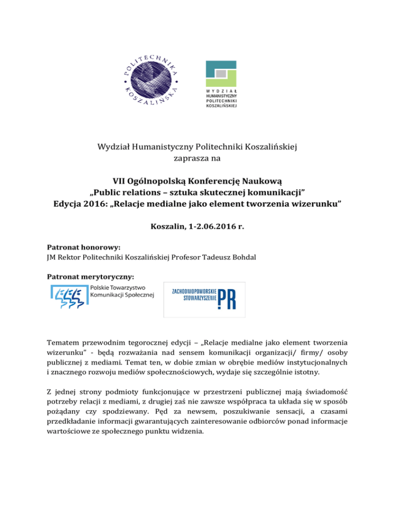 Wydział Humanistyczny Politechniki Koszalińskiej zaprasza na VII Ogólnopolską Konferencję Naukową „Public relations – sztuka skutecznej komunikacji” Edycja 2016: „Relacje medialne jako element tworzenia wizerunku” Koszalin, 1-2.06.2016 r. Patronat honorowy: JM Rektor Politechniki Koszalińskiej Profesor Tadeusz Bohdal Patronat merytoryczny: Tematem przewodnim tegorocznej edycji – „Relacje medialne jako element tworzenia wizerunku” - będą rozważania nad sensem komunikacji organizacji/ firmy/ osoby publicznej z mediami. Temat ten, w dobie zmian w obrębie mediów instytucjonalnych i znacznego rozwoju mediów społecznościowych, wydaje się szczególnie istotny. Z jednej strony podmioty funkcjonujące w przestrzeni publicznej mają świadomość potrzeby relacji z mediami, z drugiej zaś nie zawsze współpraca ta układa się w sposób pożądany czy spodziewany. Pęd za newsem, poszukiwanie sensacji, a czasami przedkładanie informacji gwarantujących zainteresowanie odbiorców ponad informacje wartościowe ze społecznego punktu widzenia. W przestrzeni tej – medialnej i organizacyjnej – interesująca będzie rola osób odpowiedzialnych za kształtowanie polityki informacyjnej i będących często pośrednikiem w dystrybucji treści organizacji do mediów. Podczas konferencji będziemy koncentrować się zarówno na teoretycznych aspektach modeli komunikowania się z otoczeniem, jak również praktyce relacji z mediami. Konferencyjnym prelekcjom towarzyszyć będą panele stanowiące moment bezpośredniej wymiany poglądów, nawiązywaniu kontaktów i – mamy nadzieję – budzące refleksję otwierającą nowe obszary badań i poszukiwań. Zapraszamy do zgłaszania tematów wystąpień oraz przygotowania tekstów artykułów, które po uzyskaniu pozytywnych recenzji zostaną opublikowane w monografii zbiorowej: rozwiązania organizacyjne struktur informacyjnych przedsiębiorstw, instytucji i podmiotów obsługujących, rola etyki zawodowej w relacjach medialnych, informacja dostarczona mediom vs. treści opublikowane – jakie treści są najchętniej publikowane przez media?, wartość i jakość przekazu medialnego wobec komercjalizacji treści, manipulacja w mediach, odmienność dystrybucji treści organizacyjnych w kontekście nowych mediów, siła branży/siła samorządu zawodowego w relacjach z mediami – realna czy pozorna? odpowiedzialność za dystrybucję treści organizacji, firmy, osoby publicznej w przestrzeni mediów, odpowiedzialność mediów wobec organizacji i odbiorców treści, odpowiedzialność – mediów i użytkowników – za dystrybucję treści w nowych mediach. Organizatorzy: Wydział Humanistyczny Politechniki Koszalińskiej Studenckie Koło Naukowe Public Relations FUTURA Studenckie Koło Naukowe REDAKCJA AKADEMICKA Komitet naukowy Konferencji: dr Monika Kaczmarek-Śliwińska dr Lidia Sudakiewicz dr Piotr Szarszewski Komitet organizacyjny Konferencji: dr Monika Kaczmarek-Śliwińska Teresa Domaradz Maja Gudell Kacper Banach Informacje organizacyjne: Do 25.04 termin przesłania zgłoszenia [email protected] Do 12.06 termin przesłania tekstu artykułu do recenzji na adres: Opłaty: Uczestnictwo w konferencji (czynne i bierne) bez wyżywienia i publikacji artykułu jest zwolnione z opłat i wymaga jedynie rejestracji poprzez przesłania zgłoszenia na adres: [email protected] 150 zł opłata konferencyjna obejmuje obiady w dniu 1-2.06 i kolację w dniu 1.06 200 zł opłata konferencyjna obejmuje obiad w dniu 1-2.06, kolację w dniu 1.06 oraz publikację tekstu (po uzyskaniu pozytywnej recenzji) Termin wniesienia opłaty konferencyjnej: do dnia 15.05.2016 r. Numer konta poniżej w formularzu zgłoszeniowym. Organizatorzy nie gwarantują noclegów.