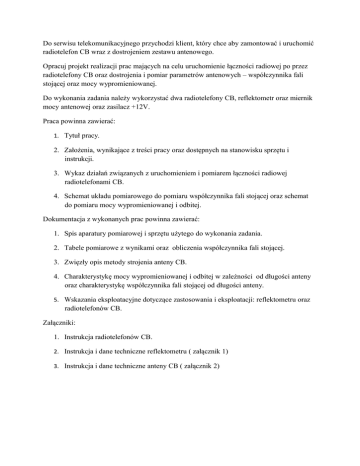 Do serwisu telekomunikacyjnego przychodzi klient, który chce aby zamontować i uruchomić radiotelefon CB wraz z dostrojeniem zestawu antenowego. Opracuj projekt realizacji prac mających na celu uruchomienie łączności radiowej po przez radiotelefony CB oraz dostrojenia i pomiar parametrów antenowych – współczynnika fali stojącej oraz mocy wypromieniowanej. Do wykonania zadania należy wykorzystać dwa radiotelefony CB, reflektometr oraz miernik mocy antenowej oraz zasilacz +12V. Praca powinna zawierać: 1. Tytuł pracy. 2. Założenia, wynikające z treści pracy oraz dostępnych na stanowisku sprzętu i instrukcji. 3. Wykaz działań związanych z uruchomieniem i pomiarem łączności radiowej radiotelefonami CB. 4. Schemat układu pomiarowego do pomiaru współczynnika fali stojącej oraz schemat do pomiaru mocy wypromieniowanej i odbitej. Dokumentacja z wykonanych prac powinna zawierać: 1. Spis aparatury pomiarowej i sprzętu użytego do wykonania zadania. 2. Tabele pomiarowe z wynikami oraz obliczenia współczynnika fali stojącej. 3. Zwięzły opis metody strojenia anteny CB. 4. Charakterystykę mocy wypromieniowanej i odbitej w zależności od długości anteny oraz charakterystykę współczynnika fali stojącej od długości anteny. 5. Wskazania eksploatacyjne dotyczące zastosowania i eksploatacji: reflektometru oraz radiotelefonów CB. Załączniki: 1. Instrukcja radiotelefonów CB. 2. Instrukcja i dane techniczne reflektometru ( załącznik 1) 3. Instrukcja i dane techniczne anteny CB ( załącznik 2)