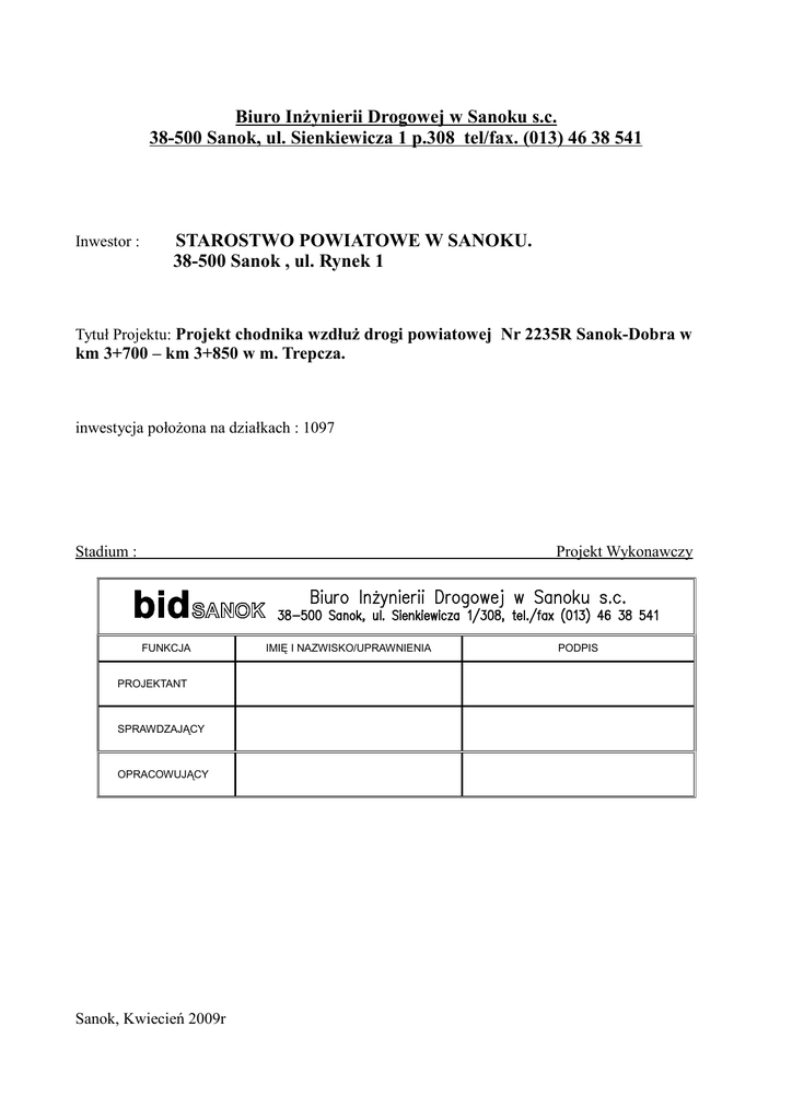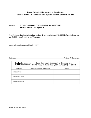 Biuro InŜynierii Drogowej w Sanoku s.c. 38-500 Sanok, ul. Sienkiewicza 1 p.308 tel/fax. (013) 46 38 541 Inwestor : STAROSTWO POWIATOWE W SANOKU. 38-500 Sanok , ul. Rynek 1 Tytuł Projektu: Projekt chodnika wzdłuŜ drogi powiatowej Nr 2235R Sanok-Dobra w km 3+700 – km 3+850 w m. Trepcza. inwestycja połoŜona na działkach : 1097 Stadium : Projekt Wykonawczy FUNKCJA PROJEKTANT SPRAWDZAJĄCY OPRACOWUJĄCY Sanok, Kwiecień 2009r IMIĘ I NAZWISKO/UPRAWNIENIA PODPIS CZĘŚĆ OPISOWA : Spis zawartości : 1. Część opisowa 1.1 Opis techniczny 1.2 Rozwiązania konstrukcyjno – materiałowe podstawowych elementów konstrukcyjnych i sposób ich wykonania. 2.Rysunki budowlano-konstrukcyjne 2.1 Plan sytuacyjny – stan projektowany 2.2 Przekroje typowe ` skala 1:500 skala 1:50,1:100 Część opisowa: Opis techniczny a) Przedmiot, podstawa, zakres i cel opracowania. Przedmiotem opracowania jest projekt chodnika wzdłuŜ drogi powiatowej Nr 2235R Sanok-Dobra w km 3+700 – km 3+850 w m. Trepcza. - plan sytuacyjno wysokościowy - skala 1:500 - umowa pomiędzy Starostwem Powiatowym a BID s.c. Sanok - wizja lokalna i pomiary w terenie - Dz.U. nr 43 z dnia 14.05.1999r - „Warunki techniczne jakim powinny odpowiadać drogi publiczne i ich usytuowanie”, Instrukcja oznakowania robót prowadzonych w pasie drogowym i literatura techniczna Zakres opracowania obejmuje rysunki konstrukcyjne, opis wykonania nawierzchni chodnika, przedmiar robót Celem opracowania jest poprawienie warunków dla poruszania się pieszych wzdłuŜ drogi powiatowej. b) Lokalizacja i usytuowanie Przedmiotowy odcinek znajduje się w ciągu drogi powiatowej Nr 2235R SanokDobra w km 3+700 – km 3+850 w m. Trepcza. c) Stan istniejący i projektowany : Stan istniejący Na przedmiotowym odcinku(odcinek 150mb) ruch pieszych odbywa się poboczem drogi powiatowej. WzdłuŜ remontowanego odcinka występuje zabudowa wielorodzinna oraz obiekty uŜyteczności publicznej (szkoła, kościół), co generuje dość duŜy ruch pieszych. Stan projektowany Stan projektowany zakłada wykonanie nawierzchni chodnika w celu odseparowania ruchu pieszych wzdłuŜ drogi powiatowej, w tym celu naleŜy: − wykonać oznakowanie robót drogowych zgodnie z projektem organizacji ruchu na czas wykonywania robót − wyznaczyć geodezyjnie punkty i linie charakterystyczne chodnika − wykonać warstwę podbudowy − ustawić krawęŜniki − wykonać nawierzchnie na chodnikach i zjazdy do posesji − ułoŜyć kolektor - uporządkować teren budowy i wykonać inwentaryzację podwykonawczą 1.2 Rozwiązania konstrukcyjno – materiałowe podstawowych elementów konstrukcyjnych i sposób ich wykonania: 1.2.1 Przekrój typowy: Zaprojektowano przekrój o spadku 2% w kierunku jezdni Stan projektowany budowy chodnika zakłada : − − − − − − szerokość chodnika: 1,50m wykonanie poszerzenia ulicy wykonanie koryta i warstw konstrukcyjnych nawierzchni chodnika i zjazdów ułoŜenie krawęŜnika betonowego o wymiarach 15x30cm ułoŜenie kolektora Ø400 ułoŜenie płyt typu JOMB w celu zabezpieczenia skarpy Stan projektowany chodnika i zjazdów km 3+700 – 3+826: − 8 cm kostka brukowa betonowa 20x10x8cm − 4 cm podsypka cementowo piaskowa − śr.7cm podbudowa z klińca Stan projektowany chodnika i zjazdów km 3+826 – 3+850: − 8 cm kostka brukowa betonowa 20x10x8cm − 4 cm podsypka cementowo piaskowa − 15cm podbudowa z klińca Przekrój poprzeczny ulicy przekrój poprzeczny jezdni o nachyleniu w kierunku krawęŜnika. Szerokość jezdni – 3,50m(odcinek km 3+826-3+850 – poszerzenia 0.60-1.00m) Zjazdy do posesji przyległych do ulicy-na zjazdach do posesji przewidziano obniŜenie krawęŜnika betonowego i wykonanie nawierzchni z kostki. 1.2.2 Przekrój podłuŜny: Przekrój podłuŜny i spadki podłuŜne naleŜy zachować identyczne ze stanem istniejącym. Wpływ inwestycji na środowisko – Inwestycja związana z przebudową nawierzchni drogi nie wprowadzi istotnych zmian w dotychczasowym korzystaniu ze środowiska. Odseparowanie ruchu pieszych wpłynie na poprawę bezpieczeństwa w miejscu wykonanego chodnika. 1.3. Uwagi końcowe Wszelkie prace naleŜy prowadzić zgodnie z przepisami BHP. Przed przystąpieniem do robót naleŜy opracować i zatwierdzić projekt organizacji ruchu na czas wykonywania remontu. Składowanie materiału z rozbiórki naleŜy uzgodnić z Zarządca drogi.