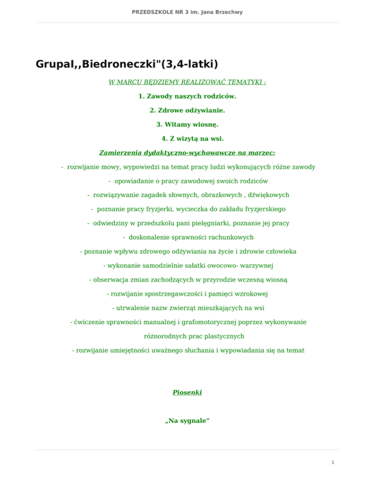 PRZEDSZKOLE NR 3 im. Jana Brzechwy GrupaI,,Biedroneczki"(3,4-latki) W MARCU BĘDZIEMY REALIZOWAĆ TEMATYKI : 1. Zawody naszych rodziców. 2. Zdrowe odżywianie. 3. Witamy wiosnę. 4. Z wizytą na wsi. Zamierzenia dydaktyczno-wychowawcze na marzec: - rozwijanie mowy, wypowiedzi na temat pracy ludzi wykonujących różne zawody - opowiadanie o pracy zawodowej swoich rodziców - rozwiązywanie zagadek słownych, obrazkowych , dźwiękowych - poznanie pracy fryzjerki, wycieczka do zakładu fryzjerskiego - odwiedziny w przedszkolu pani pielęgniarki, poznanie jej pracy - doskonalenie sprawności rachunkowych - poznanie wpływu zdrowego odżywiania na życie i zdrowie człowieka - wykonanie samodzielnie sałatki owocowo- warzywnej - obserwacja zmian zachodzących w przyrodzie wczesną wiosną - rozwijanie spostrzegawczości i pamięci wzrokowej - utrwalenie nazw zwierząt mieszkających na wsi - ćwiczenie sprawności manualnej i grafomotorycznej poprzez wykonywanie różnorodnych prac plastycznych - rozwijanie umiejętności uważnego słuchania i wypowiadania się na temat Piosenki „Na sygnale” 1 PRZEDSZKOLE NR 3 im. Jana Brzechwy Tu, tu, tu, tu, tu, tu, pędzi strażak ile tchu. Do pożaru śpieszy się, ogień wodą zgasić chce. Tu, tu, tu, tu, tu, tu, pędzi strażak ile tchu. Tu, tu, tu, tu, tu, tu, mknie policjant ile tchu. Pędzi szybko radiowozem, dzisiaj komuś znów pomoże. Tu, tu, tu, tu, tu, tu, mknie policjant ile tchu Tu, tu, tu, tu, tu, tu, pędzi lekarz ile tchu Pędzi, pędzi pogotowie by ratować ludziom zdrowie Tu, tu, tu, tu, tu, tu, pędzi lekarz ile tchu. „Zdrowe odżywianie” Zjemy obiad kolorowy, pełen ryb i warzyw zdrowych Jeśli zechcesz, zobacz sam, będzie smacznie mniam, mniam, mniam. 2 PRZEDSZKOLE NR 3 im. Jana Brzechwy Refren: Bo zasadę taką mamy, że się zdrowo odżywiamy! Bo zasadę taką mamy, że się zdrowo odżywiamy! Dziś na deser jest szarlotka z jabłek, no i niezbyt słodka. Jeśli zechcesz, zobacz sam, będzie smacznie, mniam, mniam, mniam. Refren: Bo zasadę taką mamy… Ach, do picia tylko woda! Chociaż zwykła – zdrowia doda. Jeśli zechcesz, zobacz sam, będzie smacznie, mniam, mniam, mniam „Pani wiosna” Idzie, idzie pani wiosna cicho na paluszkach, taka piękna i radosna jak bajkowa wróżka. Refren: Obudź się, niedźwiadku, już, wiosna jest tuż, tuż! (x2) Idzie wiosna kolorowa, ma w koszyku kwiatki. 3 PRZEDSZKOLE NR 3 im. Jana Brzechwy Pragnie nimi obdarować dzieci i niedźwiadki. Refren: Obudź się niedźwiadku już, wiosna jest tuż, tuż! (x2) Wiersz „Tyle kobiet” Rankiem , gdy zaspane oczy , otwieram po trochu , mama głaszcze mnie po głowie : - Wstawaj prędzej śpiochu ! Babcia kraje chleb , smaruje krząta się od rana . Z torbą śpieszy listonoszka może jest coś dla nas? Jeśli kaszel mam , gorączkę , jeśli boli głowa , jest w pobliżu pani doktor , pomóc mi gotowa . Tyle kobiet dookoła : starszych , młodszych , małych . Dużo jest ich , bardzo dużo w wielkim świecie całym . Mamom , babciom , paniom wszystkim , dalekim i bliskim , Przesyłamy dziś życzenia na zielonych listkach . Na wiosennych listkach młodych , na wierzbowej bazi , Dziś w dniu kobiet niech się 4 PRZEDSZKOLE NR 3 im. Jana Brzechwy każdej coś miłego zdarzy ! 5