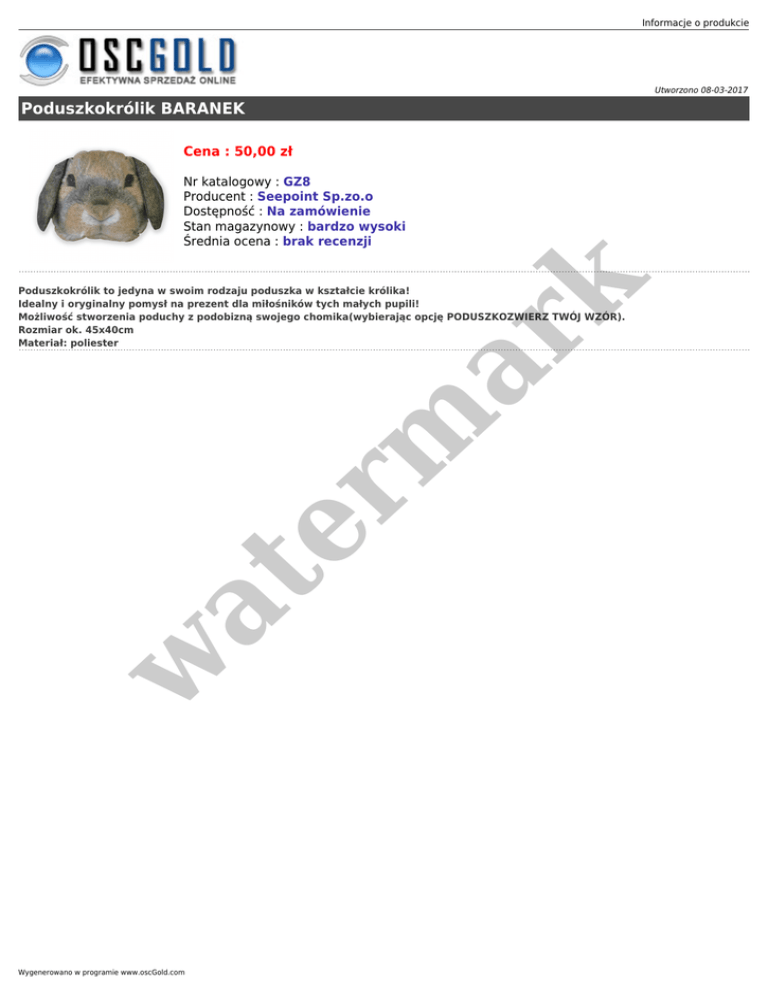 Informacje o produkcie Utworzono 08-03-2017 Poduszkokrólik BARANEK Cena : 50,00 zł er m ar k Nr katalogowy : GZ8 Producent : Seepoint Sp.zo.o Dostępność : Na zamówienie Stan magazynowy : bardzo wysoki Średnia ocena : brak recenzji w at Poduszkokrólik to jedyna w swoim rodzaju poduszka w kształcie królika! Idealny i oryginalny pomysł na prezent dla miłośników tych małych pupili! Możliwość stworzenia poduchy z podobizną swojego chomika(wybierając opcję PODUSZKOZWIERZ TWÓJ WZÓR). Rozmiar ok. 45x40cm Materiał: poliester Wygenerowano w programie www.oscGold.com