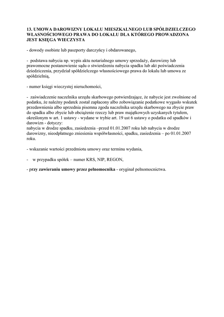 13. UMOWA DAROWIZNY LOKALU MIESZKALNEGO LUB SPÓŁDZIELCZEGO WŁASNOŚCIOWEGO PRAWA DO LOKALU DLA KTÓREGO PROWADZONA JEST KSIĘGA WIECZYSTA - dowody osobiste lub paszporty darczyńcy i obdarowanego, - podstawa nabycia np. wypis aktu notarialnego umowy sprzedaży, darowizny lub prawomocne postanowienie sądu o stwierdzeniu nabycia spadku lub akt poświadczenia dziedziczenia, przydział spółdzielczego własnościowego prawa do lokalu lub umowa ze spółdzielnią, - numer księgi wieczystej nieruchomości, - zaświadczenie naczelnika urzędu skarbowego potwierdzające, że nabycie jest zwolnione od podatku, że należny podatek został zapłacony albo zobowiązanie podatkowe wygasło wskutek przedawnienia albo uprzednia pisemna zgoda naczelnika urzędu skarbowego na zbycie praw do spadku albo zbycie lub obciążenie rzeczy lub praw majątkowych uzyskanych tytułem, określonym w art. 1 ustawy - wydane w trybie art. 19 ust 6 ustawy o podatku od spadków i darowizn - dotyczy: nabycia w drodze spadku, zasiedzenia –przed 01.01.2007 roku lub nabycia w drodze darowizny, nieodpłatnego zniesienia współwłasności, spadku, zasiedzenia – po 01.01.2007 roku. - wskazanie wartości przedmiotu umowy oraz terminu wydania, - w przypadku spółek – numer KRS, NIP, REGON, - przy zawieraniu umowy przez pełnomocnika - oryginał pełnomocnictwa.