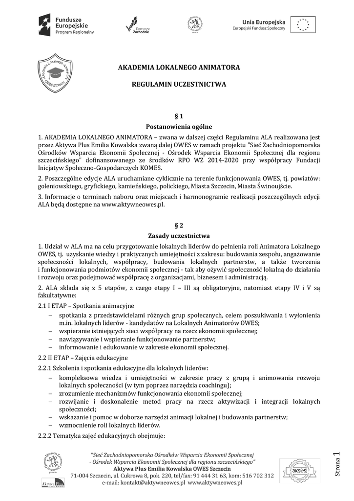 AKADEMIA LOKALNEGO ANIMATORA REGULAMIN UCZESTNICTWA §1 Postanowienia ogólne 1. AKADEMIA LOKALNEGO ANIMATORA – zwana w dalszej części Regulaminu ALA realizowana jest przez Aktywa Plus Emilia Kowalska zwaną dalej OWES w ramach projektu "Sieć Zachodniopomorska Ośrodków Wsparcia Ekonomii Społecznej - Ośrodek Wsparcia Ekonomii Społecznej dla regionu szczecińskiego" dofinansowanego ze środków RPO WZ 2014-2020 przy współpracy Fundacji Inicjatyw Społeczno-Gospodarczych KOMES. 2. Poszczególne edycje ALA uruchamiane cyklicznie na terenie funkcjonowania OWES, tj. powiatów: goleniowskiego, gryfickiego, kamieńskiego, polickiego, Miasta Szczecin, Miasta Świnoujście. 3. Informacje o terminach naboru oraz miejscach i harmonogramie realizacji poszczególnych edycji ALA będą dostępne na www.aktywneowes.pl. §2 Zasady uczestnictwa 1. Udział w ALA ma na celu przygotowanie lokalnych liderów do pełnienia roli Animatora Lokalnego OWES, tj. uzyskanie wiedzy i praktycznych umiejętności z zakresu: budowania zespołu, angażowanie społeczności lokalnych, współpracy, budowania lokalnych partnerstw, a także tworzenia i funkcjonowania podmiotów ekonomii społecznej - tak aby ożywić społeczność lokalną do działania i rozwoju oraz podejmować współpracę z organizacjami, biznesem i administracją. 2. ALA składa się z 5 etapów, z czego etapy I – III są obligatoryjne, natomiast etapy IV i V są fakultatywne: 2.1 I ETAP – Spotkania animacyjne spotkania z przedstawicielami różnych grup społecznych, celem poszukiwania i wyłonienia m.in. lokalnych liderów - kandydatów na Lokalnych Animatorów OWES; wspieranie istniejących sieci współpracy na rzecz ekonomii społecznej; nawiązywanie i wspieranie funkcjonowanie partnerstw; informowanie i edukowanie w zakresie ekonomii społecznej. 2.2 II ETAP – Zajęcia edukacyjne 2.2.1 Szkolenia i spotkania edukacyjne dla lokalnych liderów: kompleksowa wiedza i umiejętności w zakresie pracy z grupą i animowania rozwoju lokalnych społeczności (w tym poprzez narzędzia coachingu); zrozumienie mechanizmów funkcjonowania ekonomii społecznej; rozwijanie i doskonalenie metod pracy na rzecz aktywizacji i integracji lokalnych społeczności; wskazanie i pomoc w doborze narzędzi animacji lokalnej i budowania partnerstw; wzmocnienie roli lokalnych liderów. Strona 1 2.2.2 Tematyka zajęć edukacyjnych obejmuje: narzędzia pracy lokalnego animatora - jak skutecznie dotrzeć do społeczności lokalnej i otoczenia diagnozę środowiska lokalnego proces budowania partnerstw lokalnych tworzenie podmiotów ekonomii społecznej - charakterystyka podmiotów w sektorze ekonomii społecznej, tworzenie stowarzyszeń, fundacji, spółdzielni socjalnych krok po kroku, odpłatna działalność pożytku publicznego czy działalność gospodarcza - co wybrać? pozyskiwanie środków na finansowanie działalności podmiotów integracji i ekonomii społecznej - rodzaje finansowania, np. crowdfunding, jak i gdzie szukać źródeł, tworzenie projektów na rzecz lokalnych społeczności w gminie/powiecie, zlecanie zadań publicznych). 2.3 III ETAP – Doradztwo 2.3.1 Wsparcie lokalnych liderów przez kadrę OWES w tym: indywidualne doradztwo z zakresu aktywizacji i budowania partnerstw lokalnych, doradztwo formalno-prawne, które ułatwi tworzenie, rejestrację i funkcjonowanie organizacji, uzupełnienie uzyskanych podczas zajęć edukacyjnych umiejętności, dzięki którym skutecznie opracujesz, poprowadzisz i wypromujesz projekt dla społeczności lokalnej, możliwość korzystania z doradztwa dodatkowego w ramach OWES. 2.3.2 Na zakończenie udziału w etapach I-III ALA, uczestnik otrzymuje certyfikat Lokalnego Animatora OWES. 2.4 IV ETAP – Wydarzenia animacyjne Lokalni Animatorzy wezmą udział w: debatach, targach, eventach itp. – na poziomie lokalnym i angażujące w ich przygotowanie lokalnych animatorów i lokalne środowiska, aby pobudzić aktywność lokalną i partycypację społeczną najbliższego środowiska; wizytach studyjnych, celem doświadczenia istnienia realnego podmiotu, inspiracji, motywacji do działania. 2.5 V ETAP – Konkurs na dotację 2.5.1 Konkurs na najlepsze przedsięwzięcie aktywizujące społeczność lokalną, które otrzyma dofinansowanie (dotację na realizację) dedykowany jest tylko dla Lokalnych Animatorów OWES (tj. osób, które ukończyły etapy I, II i III). 2.5.2 Celem konkursu jest tworzenie i rozwój lokalnych przedsięwzięć i inicjatyw m.in. w formie klubów ekonomii społecznej lub podmiotów ekonomii społecznej. 2.5.3 Zasady udziału w konkursie na dotację zawarte są w „Wytycznych do konkursu ALA” do pobrania ze strony internetowej www.aktywneowes.pl 2.5.4 Formularz konkursowy dostępny jest na stronie internetowej www. aktywneowes.pl 2.6 Lokalni Animatorzy, o których mowa w § 2 ust. 2.3.2 regulaminu, którzy wezmą udział w etapach IV-V ALA (§ 2 ust. 2.4-2.5) otrzymają certyfikat Lokalnego Animatora OWES II stopnia. §3 Zasady rekrutacji Strona 2 1. Rekrutacja do ALA prowadzona jest przez OWES. 2. ALA kierowana jest do aktywnych mieszkańców woj. zachodniopomorskiego - powiatów: goleniowskiego, gryfickiego, kamieńskiego, polickiego, Miasto Szczecin, Miasto Świnoujście, angażujących się na rzecz społeczności lokalnych, tj.: a) przedstawicieli społeczności lokalnych (grup nieformalnych, sołectw, kół gospodyń wiejskich, rad osiedli, itp.); b) osób fizycznych zainteresowanych założeniem, prowadzeniem i pracą w podmiocie ekonomii społecznej; c) przedstawicieli podmiotów ekonomii społecznej (fundacji, stowarzyszeń, klubów integracji społecznej, centrów integracji społecznej, spółdzielni socjalnych, spółdzielni inwalidów, itp.). 3. Pierwszeństwo w ALA będą miały osoby spełniające następujące warunki dodatkowe: a) osoba zagrożona wykluczeniem społecznym*; b) osoba fizyczna zainteresowana założeniem, prowadzeniem i pracą w sektorze ekonomii s