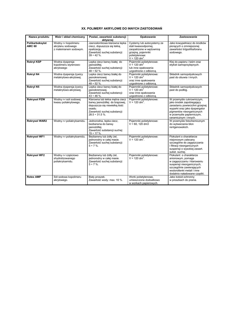 XX. POLIMERY AKRYLOWE DO INNYCH ZASTOSOWAŃ Nazwa produktu Wzór i skład chemiczny Polikarboksylat AMC 60 Wodny r-r kopolimeru akrylanu sodowego z maleinianem sodowym. Rokryl KSP Wodna dyspersja kopolimeru styrenowoakrylowego Rokryl N4 Wodna dyspersja żywicy metakrylowo-akrylowej. Rokryl N5 Wodna dyspersja żywicy metakrylowo-akrylowej. Rokrysol PZW Wodny r-r soli sodowej kwasu poliakrylowego. Rokrysol WAR2 Wodny r-r poliakryloamidu. Rokrysol WF1 Wodny r-r poliakryloamidu. Rokrysol WF2 Rotex AMP Postać, zawartość substancji aktywnej Jasnosłomkowa klarowna lepka ciecz, dopuszcza się lekką opalizację. Zawartość suchej substancji: 39 ÷ 42 %. Lepka ciecz barwy białej do jasnożółtej. Zawartość suchej substancji: 48 ÷ 52 %. Lepka ciecz barwy białej do jasnokremowej. Zawartość suchej substancji: 48 ÷ 52 %. Lepka ciecz barwy białej do jasnokremowej. Zawartość suchej substancji: 43 ÷ 46 %. Klarowna lub lekka mętna ciecz barwy jasnożółtej do brązowej, dopuszcza się niewielką ilość osadu. Zawartość suchej substancji: 28.5 ÷ 31.5 %. Opakowanie Cysterny lub autocysterny ze stali kwasoodpornej, zaopatrzone w wężownicę grzejną, pojemniki polietylenowe: V = 120 dm3. Pojemniki polietylenowe: V = 120 dm3 lub inne opakowania uzgodnione z odbiorcą. Pojemniki polietylenowe: V = 120 dm3 oraz inne opakowania uzgodnione z odbiorcą. Pojemniki polietylenowe: V = 120 dm3 oraz inne opakowania uzgodnione z odbiorcą. Pojemniki polietylenowe: V = 120 dm3. Jednorodna, lepka ciecz, bezbarwna do barwy jasnożółtej. Zawartość substancji suchej: 15 ÷ 17 %. Bezbarwny lub żółty żel, jednorodny w całej masie. Zawartość suchej substancji: 5 ÷ 7 %. Pojemniki polietylenowe: V = 60, 120 dm3 Wodny r-r częściowo shydrolizowanego poliakryloamidu. Bezbarwny lub żółty żel, jednorodny w całej masie. Zawartość suchej substancji: 5 ÷ 7 %. Pojemniki polietylenowe: V = 120 dm3. Sól sodowa kopolimeru akrylowego. Biały proszek. Zawartość wody: max. 10 %. Worki polietylenowe, umieszczone dodoatkowo w workach papierowych. Pojemniki polietylenowe: V = 120 dm3. Zastosowanie Jako kowypełniacz do środków piorących o zmniejszonej zawartości trójpolifosforanu sodowego. Klej do papieru i taśm oraz etykiet samoprzylepnych. Składnik samopołyskowych past do obuwia i innych. Składnik samopołyskowych past do podłóg. W przemyśle cukrowniczym, jako środek zapobiegający zarastaniu powierzchni grzejnej wyparki oraz jako dyspergator pigmentów nieorganicznych w przemyśle papierniczym, ceramicznym i innych. W przemyśle fotochemicznym do wytwarzania błon rentgenowskich. Flokulant o charakterze niejonowym zalecany szczególne do zagęszczania i filtracji nieorganicznych suspensji o wysokiej zawart. subst. suchej. Flokulant o charakterze anionowym, pomaga w zagęszczaniu i klarowaniu suspensji nieorganicznych, szczególnie zawierających wodorotlenki metali i inne dodatnio naładowane cząstki. Jako koloid ochronny w proszkach do prania.