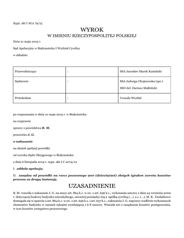 Sygn. akt I ACa 79/15 WYROK W IMIENIU RZECZYPOSPOLITEJ POLSKIEJ Dnia 21 maja 2015 r. Sąd Apelacyjny w Białymstoku I Wydział Cywilny w składzie: Przewodniczący : SSA Jarosław Marek Kamiński Sędziowie : SSA Jadwiga Chojnowska (spr.) SSO del. Dariusz Małkiński Protokolant : Urszula Westfal po rozpoznaniu w dniu 21 maja 2015 r. w Białymstoku na rozprawie sprawy z powództwa B. M. przeciwko J. G. o nakazanie na skutek apelacji powódki od wyroku Sądu Okręgowego w Białymstoku z dnia 6 listopada 2014 r. sygn. akt I C 2074/12 I. oddala apelację; II. zasądza od powódki na rzecz pozwanego 900 (dziewięćset) złotych tytułem zwrotu kosztów procesu za drugą instancję. UZASADNIENIE B. M. wnosiła o nakazanie J. G. na mocy art. 864 k.c. w zw. z art. 656 k.c., wykonania umowy z dnia 24 września 2009 r. dotyczącej budowy budynku mieszkalnego, zawartej pomiędzy nią a spółką cywilną (...) s.c. (...), M. K.. Dodatkowo domagała się w oparciu o art. 864 k.c. w zw. z art. 656 k.c. i art. 637 k.c., nakazania J. G. naprawy wadliwie wykonanych elementów budynku w ramach rękojmi wynikającej z § 8 umowy. Wniosła też o zasądzenie kosztów postępowania, w tym kosztów zastępstwa procesowego. W uzasadnieniu podniosła, że zawarta pomiędzy nią a spółką cywilną (...) umowa z dnia 24 września 2009 r. o wykonanie budynku mieszkalnego usytuowanego na działce oznaczonej nr (...) położonej w miejscowości M. nie została w znacznej części zrealizowana. Nadto wykonane przez spółkę prace obarczone są licznymi wadami. J. G. w odpowiedzi na pozew wniósł o oddalenie powództwa i zasądzenie od powódki na jego rzecz kosztów procesu, w tym kosztów zastępstwa prawnego według norm przepisanych. W uzasadnieniu wskazał, że powódka nie spełniła ciążących na niej obowiązków, m.in. w zakresie wykonania przyłączy zewnętrznych, co uniemożliwiło mu wykonanie części prac zgodnie z umową. Odnośnie natomiast wad budynku zaznaczył, że powódka utraciła uprawnienia z tytułu rękojmi za wady, bowiem nie zawiadomiła go o ich wykryciu w terminie miesiąca. Jednocześnie wraz z odpowiedzią na pozew wywiódł powództwo wzajemne, w którym domagał się zasądzenia od powódki na jego rzecz kwoty 132.389 zł wraz z ustawowymi odsetkami od dnia wniesienia pozwu do dnia zapłaty. Obejmowała ona kwotę 52.389 zł z tytułu niedopłaconego wynagrodzenia oraz kwotę 80.000 zł z tytułu kar umownych za odstąpienie od umowy z winy powódki. Wyrokiem z 6 listopada 2014 r. Sąd Okręgowy w Białymstoku oddalił powództwo, zasądził od powódki głównej na rzecz pozwanego głównego 1.200 zł tytułem kosztów zastępstwa procesowego. Oddalił też powództwo wzajemne i zasądził od powoda wzajemnego na rzecz pozwanej wzajemnej 3.600 zł tytułem zwrotu kosztów procesu oraz nakazał pobrać od powódki na rzecz Skarbu Państwa 711 zł tytułem pokrycia brakujących wydatków na opinię biegłego. Z ustaleń poczynionych przez Sąd wynikało, że wykonawcą umowy z dnia 24 września 2009 r. o budowę budynku mieszkalnego była spółka cywilna, która się rozwiązała i nie funkcjonuje. (...) spółki cywilnej prowadzili działalność gospodarczą w zakresie odpowiadającym zakresowi umowy. Obecnie natomiast pozwany główny nie prowadzi działalności gospodarczej w zakresie wynikającym z tej umowy. Sąd, w oparciu o zeznania świadków i opinię biegłego ustalił, że niedociągnięcia w realizacji umowy ciążyły zarówno po stronie inwestora, jak i wykonawcy. Zrealizowano prace na kwotę 357.647 zł. Celem usunięcia wadliwości wykonanych robót należy wydatkować kwotę 14.796 zł. Sąd uznał, że powódka zapłaciła kwotę 30.000 zł, na którą brak pisemnego pokwitowania. Sąd przyjął, że kwotę należną na rozpoczęcie budowy – 70.000 zł powódka przekazała w dwóch turach, najpierw 30.000 zł na podstawie faktury, a następnie 40.000 zł bezpośrednio do ręki. Pozwana spółka wypowiedziała umowę łączącą strony podnosząc, iż przyczyną tego jest niewykonanie przez powódkę przyłączy zewnętrznych, co z kolei stanowiło podstawę do naliczenia kary umownej. Biorąc powyższe pod uwagę Sąd uznał, że powództwo o nakazanie nie może być zrealizowane, albowiem kierowane jest do podmiotu, który nie ma przymiotu możliwego do realizacji tego nakazu. Spółka (...), która była spółką cywilną, nie funkcjonuje już w obrocie. Pozwany wspólnik nie prowadzi aktualnie działalności gospodarczej w tym zakresie, a zatem żądanie od niego wykonania tej umowy bez żądań finansowych skutkuje oddaleniem powództwa głównego i rozstrzygnięciem o kosztach procesu stosownie do treści art. 98 k.p.c. Sąd uznał również za nieuzasadnione powództwo wzajemne przyjmując, że nie występowały przesłanki do odstąpienia od umowy, a co za tym idzie do naliczenia kar umownych, zaś prace wykonane przez wykonawcę zostały w całości opłacone. Apelację od tego wyroku wywiodła B. M., która zaskarżając go w części dotyczącej oddalenia powództwa głównego, zarzuciła mu: 1) obrazę art. 637 § 1 k.c. poprzez przyjęcie, iż pozwany nie jest w stanie usunąć wad dzieła, podczas gdy ze zgromadzonego w sprawie materiału dowodowego wynika, że J. G. prowadził działalność gospodarczą w chwili wniesienia powództwa, a nadto jako wspólnik spółki cywilnej odpowiada solidarnie za zobowiązania spółki; 2) oparcie zaskarżonego wyroku o błędnie wyciągnięte wnioski, polegające na przyjęciu, iż opóźnienie po stronie zamawiającego miało znaczenie dla faktu wadliwego wykonania dzieła przez przyjmującego, podczas gdy zasady logiki i doświadczenia życiowego nakazują przyjąć zgoła odmienne stanowisko; 3) naruszenie art. 640 k.c. poprzez pominięcie przez Sąd I instancji faktu, iż skoro przyjmujący nie wyznaczył zamawiającemu terminu do usunięcia wad po jego stronie to spółka (...) s.c. J. G., M. K. wi