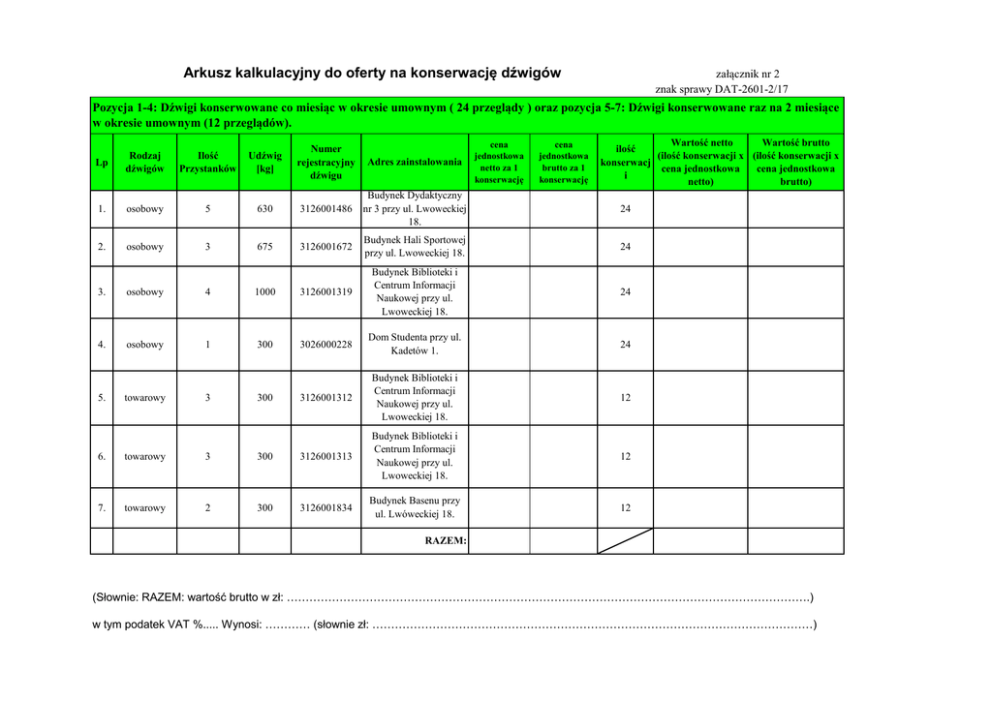 Arkusz kalkulacyjny do oferty na konserwację dźwigów załącznik nr 2 znak sprawy DAT-2601-2/17 Pozycja 1-4: Dźwigi konserwowane co miesiąc w okresie umownym ( 24 przeglądy ) oraz pozycja 5-7: Dźwigi konserwowane raz na 2 miesiące w okresie umownym (12 przeglądów). cena jednostkowa netto za 1 konserwację cena jednostkowa brutto za 1 konserwację Wartość netto Wartość brutto ilość (ilość konserwacji x (ilość konserwacji x konserwacj cena jednostkowa cena jednostkowa i netto) brutto) Lp Rodzaj dźwigów Ilość Przystanków Udźwig [kg] Numer rejestracyjny dźwigu Adres zainstalowania 1. osobowy 5 630 3126001486 Budynek Dydaktyczny nr 3 przy ul. Lwoweckiej 18. 24 2. osobowy 3 675 3126001672 Budynek Hali Sportowej przy ul. Lwoweckiej 18. 24 24 3. osobowy 4 1000 3126001319 Budynek Biblioteki i Centrum Informacji Naukowej przy ul. Lwoweckiej 18. 4. osobowy 1 300 3026000228 Dom Studenta przy ul. Kadetów 1. 24 3126001312 Budynek Biblioteki i Centrum Informacji Naukowej przy ul. Lwoweckiej 18. 12 12 12 5. towarowy 3 300 6. towarowy 3 300 3126001313 Budynek Biblioteki i Centrum Informacji Naukowej przy ul. Lwoweckiej 18. 7. towarowy 2 300 3126001834 Budynek Basenu przy ul. Lwóweckiej 18. RAZEM: (Słownie: RAZEM: wartość brutto w zł: ………………………………………………………………………………………………………………………….) w tym podatek VAT %..... Wynosi: ………… (słownie zł: ………………………………………………………………………………………………………)
