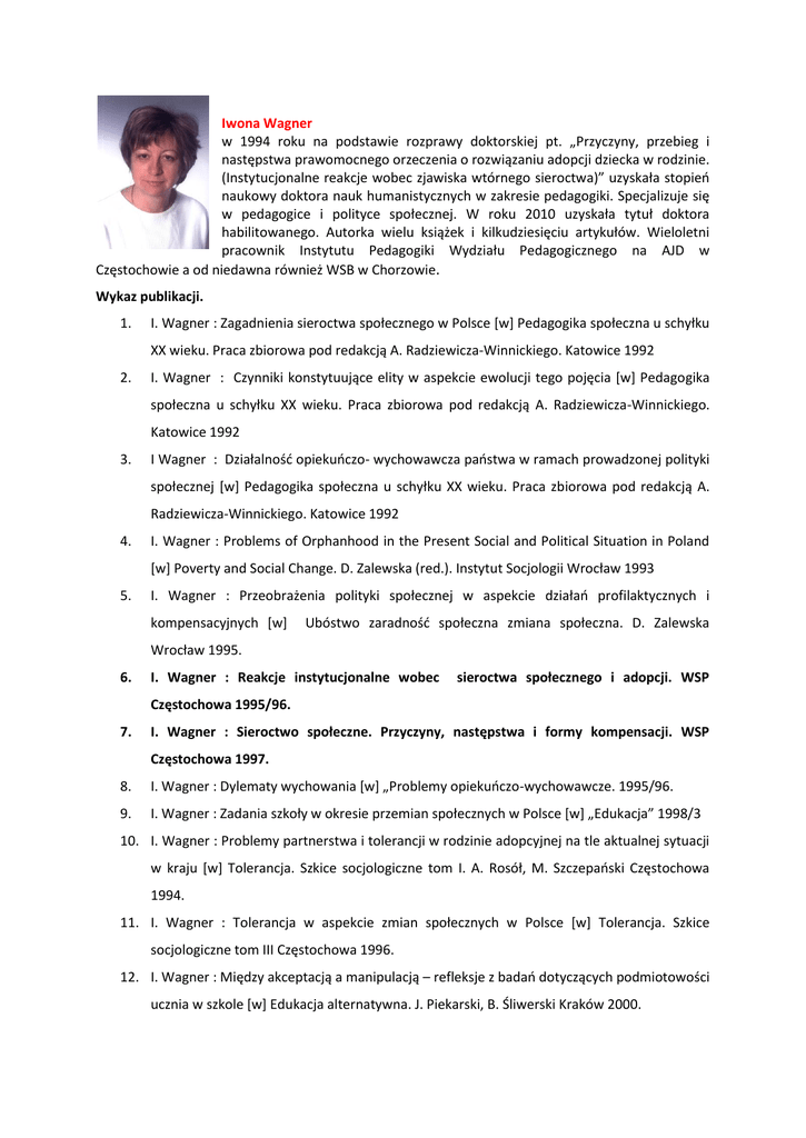 Iwona Wagner w 1994 roku na podstawie rozprawy doktorskiej pt. „Przyczyny, przebieg i następstwa prawomocnego orzeczenia o rozwiązaniu adopcji dziecka w rodzinie. (Instytucjonalne reakcje wobec zjawiska wtórnego sieroctwa)” uzyskała stopień naukowy doktora nauk humanistycznych w zakresie pedagogiki. Specjalizuje się w pedagogice i polityce społecznej. W roku 2010 uzyskała tytuł doktora habilitowanego. Autorka wielu książek i kilkudziesięciu artykułów. Wieloletni pracownik Instytutu Pedagogiki Wydziału Pedagogicznego na AJD w Częstochowie a od niedawna również WSB w Chorzowie. Wykaz publikacji. 1. I. Wagner : Zagadnienia sieroctwa społecznego w Polsce [w] Pedagogika społeczna u schyłku XX wieku. Praca zbiorowa pod redakcją A. Radziewicza-Winnickiego. Katowice 1992 2. I. Wagner : Czynniki konstytuujące elity w aspekcie ewolucji tego pojęcia [w] Pedagogika społeczna u schyłku XX wieku. Praca zbiorowa pod redakcją A. Radziewicza-Winnickiego. Katowice 1992 3. I Wagner : Działalność opiekuńczo- wychowawcza państwa w ramach prowadzonej polityki społecznej [w] Pedagogika społeczna u schyłku XX wieku. Praca zbiorowa pod redakcją A. Radziewicza-Winnickiego. Katowice 1992 4. I. Wagner : Problems of Orphanhood in the Present Social and Political Situation in Poland [w] Poverty and Social Change. D. Zalewska (red.). Instytut Socjologii Wrocław 1993 5. I. Wagner : Przeobrażenia polityki społecznej w aspekcie działań profilaktycznych i kompensacyjnych [w] Ubóstwo zaradność społeczna zmiana społeczna. D. Zalewska Wrocław 1995. 6. I. Wagner : Reakcje instytucjonalne wobec sieroctwa społecznego i adopcji. WSP Częstochowa 1995/96. 7. I. Wagner : Sieroctwo społeczne. Przyczyny, następstwa i formy kompensacji. WSP Częstochowa 1997. 8. I. Wagner : Dylematy wychowania [w] „Problemy opiekuńczo-wychowawcze. 1995/96. 9. I. Wagner : Zadania szkoły w okresie przemian społecznych w Polsce [w] „Edukacja” 1998/3 10. I. Wagner : Problemy partnerstwa i tolerancji w rodzinie adopcyjnej na tle aktualnej sytuacji w kraju [w] Tolerancja. Szkice socjologiczne tom I. A. Rosół, M. Szczepański Częstochowa 1994. 11. I. Wagner : Tolerancja w aspekcie zmian społecznych w Polsce [w] Tolerancja. Szkice socjologiczne tom III Częstochowa 1996. 12. I. Wagner : Między akceptacją a manipulacją – refleksje z badań dotyczących podmiotowości ucznia w szkole [w] Edukacja alternatywna. J. Piekarski, B. Śliwerski Kraków 2000. 13. I. Wagner : Problemy społeczne w dobie zmian ustrojowych a dysfunkcje rodziny [w] Współczesna rodzina polska. H. Cudak, H. Marzec. Piotrków Trybunalski 2001. 14. I. Wagner : Rodzina polska wobec ekonomicznej bariery dostępu młodzieży do edukacji [w] Socjalizacja i wychowanie we współczesnych rodzinach polskich. H. Cudak. Piotrków Trybunalski 2001. 15. I. Wagner : Uczeń w szkole : Podmiot praw czy przedmiot manipulacji edukacyjny w procesie przemian w latach 1989 [w] System – 1996. M. Szczepański, I. Wagner, B. Pawlica. Częstochowa 1997. 16. I. Wagner : Aktualne aspekty funkcjonowania rodzin w Polsce [w] Rodzina polska u progu XXI wieku. H. Cudak (red.). Łowicz 1997. 17. I. Wagner : Prawa ucznia w opiniach nauczycieli [w] Polska szkoła: Między admiracją a odrzuceniem. Praca zbiorowa pod redakcją A. Rosoła i M. S. Szczepańskiego. CzęstochowaKatowice 1997. 18. I. Wagner : Szkoła polska – szansa czy konieczność? [w] Polska szkoła: Miedzy centralizmem a decentralizacją. Praca zbiorowa pod redakcją M. S. Szczepańskiego. Częstochowa –Katowice 1998 19. I. Wagner : Reforma systemu edukacji : między sukcesem a porażką [w] Polska szkoła: Szkoła i system edukacyjny w procesie przemian. B. Pawlica, M. Szczepański, I. Wagner. Częstochowa – Katowice 2000. 20. A. Siedlaczek – Szwed, I. Wagner : Rodzinne i pozarodzinne środowiska wychowawcze. Częstochowa 2000. 21. I. Wagner : Przyczyny i skutki rozwiązania adopcji [w] Dziecko krzywdzone 2003/5 Warszawa 2003. 22. I. Wagner : On the way to information society – between development and exclusion [w] The New Educational Review2004/3 – 4. 23. K. Rędziński, I Wagner : Edukacja – różnica i tożsamość. Częstochowa 2004/2005 24. I. Wagner : Stałość czy zmienność autorytetów. Pedagogiczno-społeczne studium funkcjonowania i degradacji autorytetu w zmieniającym się społeczeństwie. Oficyna Wydawnicza „IMPULS”, Kraków 2005 25. I. Wagner : Sytuacja dziecka we współczesnej rodzinie – analiza zagrożeń sprzyjających sieroctwu: [w] Współczesna rodzina polska – jej stan i perspektywy. H. Cudak, H. Marzec (red.). Mysłowice 2005. 26. I. Wagner : Alternatives for Unemployed Graduates – Opportunities or Threats. [ w] The New Educational Review 2005.Vol.7, No. 3-4 27. I. Wagner : Analiza wybranych aspektów zagrożeń współczesnej rodziny [w] Socialia 2006. Univerzita Hradec Kralove. 28. I. Wagner : Tolerance as Value in Search for Axiological Perspektive in Education. [ w] The New Educational Review 2007. Vol. 11, No. 1 29. I. Wagner : Marginalizacja pokolenia przełomu i nadziei [ w ] Społeczne determinanty edukacji i gospodarowania. K. Rędziński, M. Zieliński ( red.) Gliwice 2008. 30. I. Wagner : Obiektywna i subiektywna percepcja biedy w rodzinie. Diagnoza nierówności społecznych AJD Częstochowa 2009. 31. I. Wagner : Transformacja wartości i anomia jako czynniki sprzyjające zmienności i upadkowi autorytetów. „Problemy Opiekuńczo-wychowawcze”, 2011 nr. 7 32. I. Wagner : Pracoholizm-charakterystyka zjawiska. „Praca socjalna”, 2011 nr.6 33. I. Wagner : Obiektywna i subiektywna percepcja biedy w rodzinie. Częstochowa 2012 34. I. Wagner : Modele przemian wartości i norm moralnych w polskim społeczeństwie [w] J. Krukowski, Rzeczywistość dziecka. Tarnów 2012 35. I. Wagner : Bieda a nierówności społeczne [w] Európske a svetove kontenty chudoby. Rużomberok 2013 Zbigniew Wajda magister psychologii, psychoterape