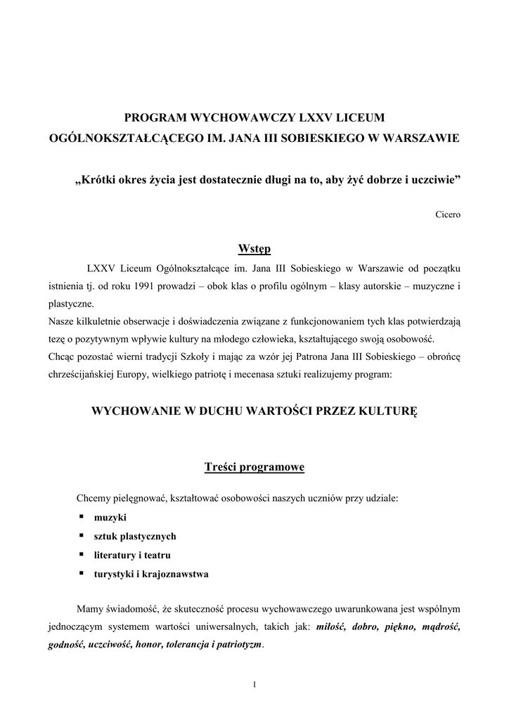PROGRAM WYCHOWAWCZY LXXV LICEUM OGÓLNOKSZTAŁCĄCEGO IM. JANA III SOBIESKIEGO W WARSZAWIE „Krótki okres życia jest dostatecznie długi na to, aby żyć dobrze i uczciwie” Cicero Wstęp LXXV Liceum Ogólnokształcące im. Jana III Sobieskiego w Warszawie od początku istnienia tj. od roku 1991 prowadzi – obok klas o profilu ogólnym – klasy autorskie – muzyczne i plastyczne. Nasze kilkuletnie obserwacje i doświadczenia związane z funkcjonowaniem tych klas potwierdzają tezę o pozytywnym wpływie kultury na młodego człowieka, kształtującego swoją osobowość. Chcąc pozostać wierni tradycji Szkoły i mając za wzór jej Patrona Jana III Sobieskiego – obrońcę chrześcijańskiej Europy, wielkiego patriotę i mecenasa sztuki realizujemy program: WYCHOWANIE W DUCHU WARTOŚCI PRZEZ KULTURĘ Treści programowe Chcemy pielęgnować, kształtować osobowości naszych uczniów przy udziale: muzyki sztuk plastycznych literatury i teatru turystyki i krajoznawstwa Mamy świadomość, że skuteczność procesu wychowawczego uwarunkowana jest wspólnym jednoczącym systemem wartości uniwersalnych, takich jak: miłość, dobro, piękno, mądrość, godność, uczciwość, honor, tolerancja i patriotyzm. 1 Proponujemy naszym Uczniom uczestnictwo w następujących zajęciach: Dział muzyczny • W próbach i występach chóru szkolnego • W próbach i występach zespołu muzycznego • W nauce tańca • W koncertach organizowanych w szkole i poza nią • W konkursach muzycznych organizowanych przez Szkołę i inne instytucje Dział plastyczny • W wycieczkach do muzeów na wystawy stałe i okresowe (Muzeum Narodowe, Muzeum Etnograficzne, Centrum Sztuki Współczesnej, Zachęta, Królikarnia, Arkadia i inne) • W odczytach prowadzonych przez profesjonalistów i uczniów (np. „Przez style w sztuce – architektura”, „Impresjonizm i koloryzm”, inne) • W wystawach plastycznych – indywidualnych, klasowych, szkolnych • W warsztatach plastycznych (nauka malarstwa olejnego, rzeźby w papier mache, i innych technik) • W plenerach jedno- i wielodniowych (Łazienki Królewskie, Wilanów, Park Skaryszewski, Arkadia i inne) Dział literatury, teatru i filmu • W inscenizacjach teatralnych przedstawianych w szkole i poza nią • W konkursach recytatorskich szkolnych i zewnętrznych • W redagowaniu gazetki szkolnej • W działalności koła teatralnego Dział turystyczno – krajoznawczy • W zielonych i białych szkołach 2 • W wycieczkach będących częścią realizowanych programów nauczania (krajowych i zagranicznych) • W wymianach międzynarodowych organizowanych przez nauczycieli języków obcych Struktura programu Elementy wyznaczające strukturę tego programu ujęte są w trzech hasłach programowych: 1. Mój świat wewnętrzny 2. Moje relacje z innymi osobami 3. Moje relacje z grupą – klasą – środowiskiem Etapy kształcenia i wychowania obejmujące trzy lata pobytu Ucznia w Szkole oraz podstawowy zasób wiedzy i umiejętności Ucznia, których osiągnięciu podporządkowane są działania środowiska wychowawczego Szkoły ujęte są w poniższej tabeli: Mój świat wewnętrzny Wiadomości i umiejętności ucznia Metody i formy służące ich przyswojeniu i opanowaniu Ma poczucie własnej wartości - godziny wychowawcze poświęcone wzmacnianiu poczucia własnej wartości, - właściwy stosunek do uczniów ze strony pracowników szkoły – okazywanie szacunku, twórcza krytyka, pełna akceptacja osoby, - organizowanie samooceny dotyczącej wykonywanych zadań, zachowania odpowiedzialni: - cały personel szkoły Tworzy swój system wartości - zajęcia wychowawcze poświęcone wartościom i normom moralnym, - dyskusje na temat wspólnie obejrzanych przedstawień teatralnych lub filmowych, przeczytanych pozycji literatury, - korelacja tematyki katechez i zajęć z etyki z tematami zajęć wychowawczych odpowiedzialni: 3 - wychowawcy, - nauczyciele religii, - pedagog, - psycholog Poznaje wartość zdrowia, dba o zdrowie i bezpieczeństwo własne i innych, potrafi przeciwstawić się próbom wciągnięcia go w nałogi – nikotynowy, alkoholowy, narkotykowy - profilaktyka uzależnień w szerokim znaczeniu tego terminu, - zajęcia wychowawcze na temat aktywnego wypoczynku i znaczenia profilaktyki w utrzymaniu zdrowia i dobrej kondycji, - lekcje wychowania fizycznego oraz dodatkowe zajęcia sportowe, - działania profilaktyczno-wychowawcze wynikające ze Szkolnego Programu Profilaktyki, - zapoznawanie z planem ewakuacyjnym szkoły (próby alarmowe), - organizowanie zajęć z dziedziny wiktymologii, - siłownia dostępna da uczniów, - możliwość korzystania z pomocy medycznej (nadzór pielęgniarki)) odpowiedzialni: - wychowawcy, - pedagog, - dyrekcja szkoły, - pielęgniarka, - nauczyciele kultury fizycznej Potrafi uczyć się, planować pracę, wypoczywać - zajęcia wychowawcze na temat technik uczenia się i zapamiętywania, - planowanie zajęć własnych, klasowych, wycieczek itp., - planowanie i organizowanie pozalekcyjnych spotkań klasowych lub rodzicielskich pod opieką wychowawcy, - zajęcia wychowawcze dotyczące higieny pracy, metod aktywnego wypoczynku, - przygotowywanie projektów przedmiotowych – indywidualnych i grupowych, - autotest „Mój styl uczenia się” odpowiedzialni: - wychowawcy, - pedagog, - pielęgniarka, - psycholog - spotkania z pedagogiem szkolnym, - spotkania z psychologiem, - indywidualne spotkania, rozmowy z wychowawcą, - zajęcia wychowawcze poświęcone działalności Radzi sobie z rozwiązywaniem własnych problemów, w razie potrzeby wie, gdzie i do kogo zwrócić się o pomoc w ich rozwiązaniu 4 instytucji służącym pomocą młodemu człowiekowi, - spotkania ze specjalistami, - wykaz miejsc, instytucji, - spotkania z przedstawicielami tych instytucji - organizowanie grupy wsparciowo rozwojowej odpowiedzialni: - wychowawcy, - pedagog, - psycholog, - specjaliści zewnętrzni Zna i stosuje podstawowe zasad