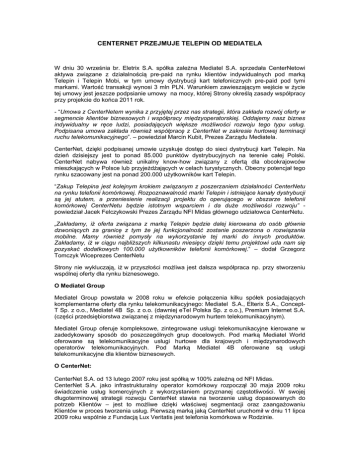 CENTERNET PRZEJMUJE TELEPIN OD MEDIATELA W dniu 30 września br. Eletrix S.A. spółka zależna Mediatel S.A. sprzedała CenterNetowi aktywa związane z działalnością pre-paid na rynku klientów indywidualnych pod marką Telepin i Telepin Mobi, w tym umowy dystrybucji kart telefonicznych pre-paid pod tymi markami. Wartość transakcji wynosi 3 mln PLN. Warunkiem zawieszającym wejście w życie tej umowy jest jeszcze podpsianie umowy na mocy, której Strony określą zasady współpracy przy projekcie do końca 2011 rok. - “Umowa z CenterNetem wynika z przyjętej przez nas strategii, która zakłada rozwój oferty w segmencie klientów biznesowych i współpracy międzyoperatorskiej. Oddajemy nasz biznes indywidualny w ręce ludzi, posiadających większe możliwości rozwoju tego typu usług. Podpisana umowa zakłada również współpracę z CenterNet w zakresie hurtowej terminacji ruchu telekomunikacyjnego”. – powiedział Marcin Kubit, Prezes Zarządu Mediatela. CenterNet, dzięki podpisanej umowie uzyskuje dostęp do sieci dystrybucji kart Telepin. Na dzień dzisiejszy jest to ponad 85.000 punktów dystrybucyjnych na terenie całej Polski. CenterNet nabywa również unikalny know-how związany z ofertą dla obcokrajowców mieszkających w Polsce lub przyjeżdżających w celach turystycznych. Obecny potencjał tego rynku szacowany jest na ponad 200.000 użytkowników kart Telepin. “Zakup Telepina jest kolejnym krokiem związanym z poszerzaniem działalności CenterNetu na rynku telefonii komórkowej. Rozpoznawalność marki Telepin i istniejące kanały dystrybucji są jej atutem, a przeniesienie realizacji projektu do operującego w obszarze telefonii komórkowej CenterNetu będzie istotnym wsparciem i da duże możliwości rozwoju” powiedział Jacek Felczykowski Prezes Zarządu NFI Midas głównego udziałowca CenterNetu. „Zakładamy, iż oferta związana z marką Telepin będzie dalej kierowana do osób głównie dzwoniących za granicę z tym że jej funkcjonalność zostanie poszerzona o rozwiązania mobilne. Mamy również pomysły na wykorzystanie tej marki do innych produktów. Zakładamy, iż w ciągu najbliższych kilkunastu miesięcy dzięki temu projektowi uda nam się pozyskać dodatkowych 100.000 użytkowników telefonii komórkowej.” – dodał Grzegorz Tomczyk Wiceprezes CenterNetu Strony nie wykluczają, iż w przyszłości możliwa jest dalsza współpraca np. przy stworzeniu wspólnej oferty dla rynku biznesowego. O Mediatel Group Mediatel Group powstała w 2008 roku w efekcie połączenia kilku spółek posiadających komplementarne oferty dla rynku telekomunikacyjnego: Mediatel S.A., Elterix S.A., ConceptT Sp. z o.o., Mediatel 4B Sp. z o.o. (dawniej eTel Polska Sp. z o.o.), Premium Internet S.A. (części przedsiębiorstwa związanej z międzynarodowym hurtem telekomunikacyjnym). Mediatel Group oferuje kompleksowe, zintegrowane usługi telekomunikacyjne kierowane w zadedykowany sposób do poszczególnych grup docelowych. Pod marką Mediatel World oferowane są telekomunikacyjne usługi hurtowe dla krajowych i międzynarodowych operatorów telekomunikacyjnych. Pod Marką Mediatel 4B oferowane są usługi telekomunikacyjne dla klientów biznesowych. O CenterNet: CenterNet S.A. od 13 lutego 2007 roku jest spółką w 100% zależną od NFI Midas. CenterNet S.A. jako infrastrukturalny operator komórkowy rozpoczął 30 maja 2009 roku świadczenie usług komercyjnych z wykorzystaniem przyznanej częstotliwości. W swojej długoterminowej strategii rozwoju CenterNet stawia na tworzenie usług dopasowanych do potrzeb Klientów – jest to możliwe dzięki właściwej segmentacji oraz zaangażowaniu Klientów w proces tworzenia usług. Pierwszą marką jaką CenterNet uruchomił w dniu 11 lipca 2009 roku wspólnie z Fundacją Lux Veritatis jest telefonia komórkowa w Rodzinie.