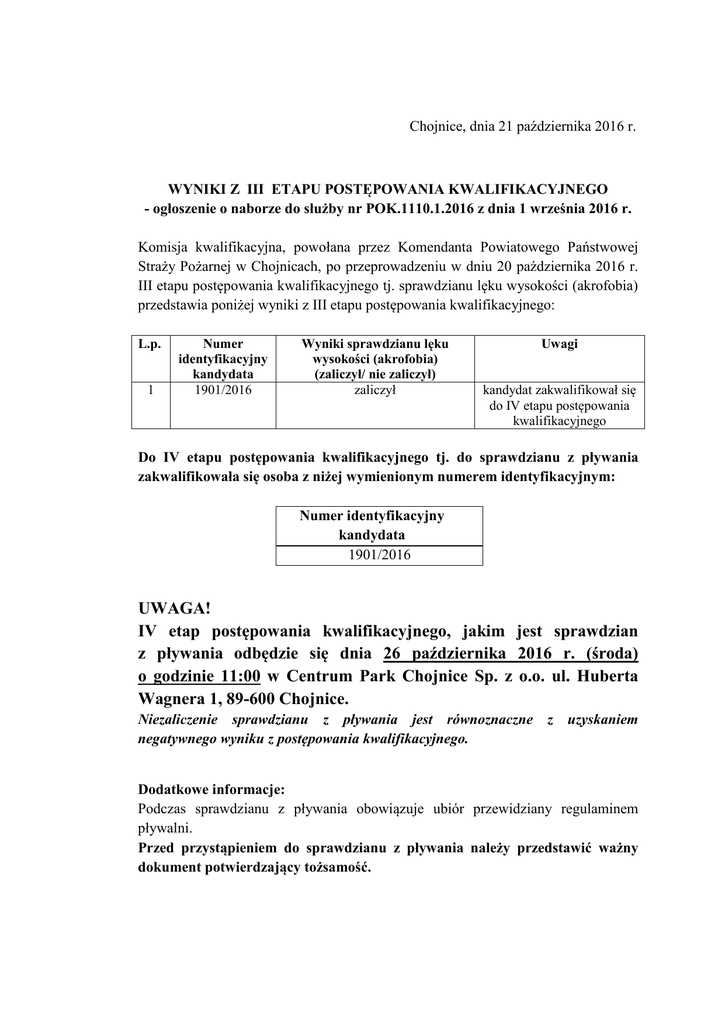 Chojnice, dnia 21 października 2016 r. WYNIKI Z III ETAPU POSTĘPOWANIA KWALIFIKACYJNEGO - ogłoszenie o naborze do służby nr POK.1110.1.2016 z dnia 1 września 2016 r. Komisja kwalifikacyjna, powołana przez Komendanta Powiatowego Państwowej Straży Pożarnej w Chojnicach, po przeprowadzeniu w dniu 20 października 2016 r. III etapu postępowania kwalifikacyjnego tj. sprawdzianu lęku wysokości (akrofobia) przedstawia poniżej wyniki z III etapu postępowania kwalifikacyjnego: L.p. 1 Numer identyfikacyjny kandydata 1901/2016 Wyniki sprawdzianu lęku wysokości (akrofobia) (zaliczył/ nie zaliczył) zaliczył Uwagi kandydat zakwalifikował się do IV etapu postępowania kwalifikacyjnego Do IV etapu postępowania kwalifikacyjnego tj. do sprawdzianu z pływania zakwalifikowała się osoba z niżej wymienionym numerem identyfikacyjnym: Numer identyfikacyjny kandydata 1901/2016 UWAGA! IV etap postępowania kwalifikacyjnego, jakim jest sprawdzian z pływania odbędzie się dnia 26 października 2016 r. (środa) o godzinie 11:00 w Centrum Park Chojnice Sp. z o.o. ul. Huberta Wagnera 1, 89-600 Chojnice. Niezaliczenie sprawdzianu z pływania jest równoznaczne z uzyskaniem negatywnego wyniku z postępowania kwalifikacyjnego. Dodatkowe informacje: Podczas sprawdzianu z pływania obowiązuje ubiór przewidziany regulaminem pływalni. Przed przystąpieniem do sprawdzianu z pływania należy przedstawić ważny dokument potwierdzający tożsamość.
