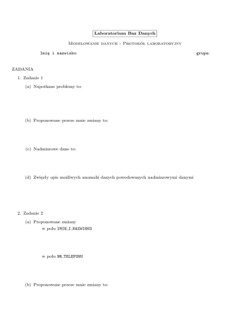 Laboratorium Baz Danych Modelowanie danych - Protokół laboratoryjny Imię i nazwisko: ZADANIA 1. Zadanie 1 (a) Napotkane problemy to: (b) Proponowane przeze mnie zmiany to: (c) Nadmiarowe dane to: (d) Zwięzły opis możliwych anomalii danych powodowanych nadmiarowymi danymi 2. Zadanie 2 (a) Proponowane zmiany w polu IMIE I NAZWISKO w polu NR TELEFONU (b) Proponowane przeze mnie zmiany to: grupa: (c) Nadmiarowe dane to: (d) Zwięzły opis możliwych anomalii danych powodowanych nadmiarowymi danymi 3. Zadanie 3 (a) Problemy związane z redundancja danych to: (b) Problemy związane z brakiem spójności danych to: (c) Usuniecie budynku oznaczonego kodem KOM spowoduje: 4. Zadanie 4 Diagram Chen’a Diagram Crow’a 5. Zadanie 5 Diagram Chen’a Diagram Crow’a Diagram Chen’a Diagram Crow’a 6. Zadanie 6 Podpunkt (a) Podpunkt (b) Diagram Chen’a Diagram Crow’a Diagram Chen’a Diagram Crow’a Podpunkt (c) Podpunkt (d) Diagram Chen’a Diagram Crow’a Diagram Chen’a Diagram Crow’a Podpunkt (e)