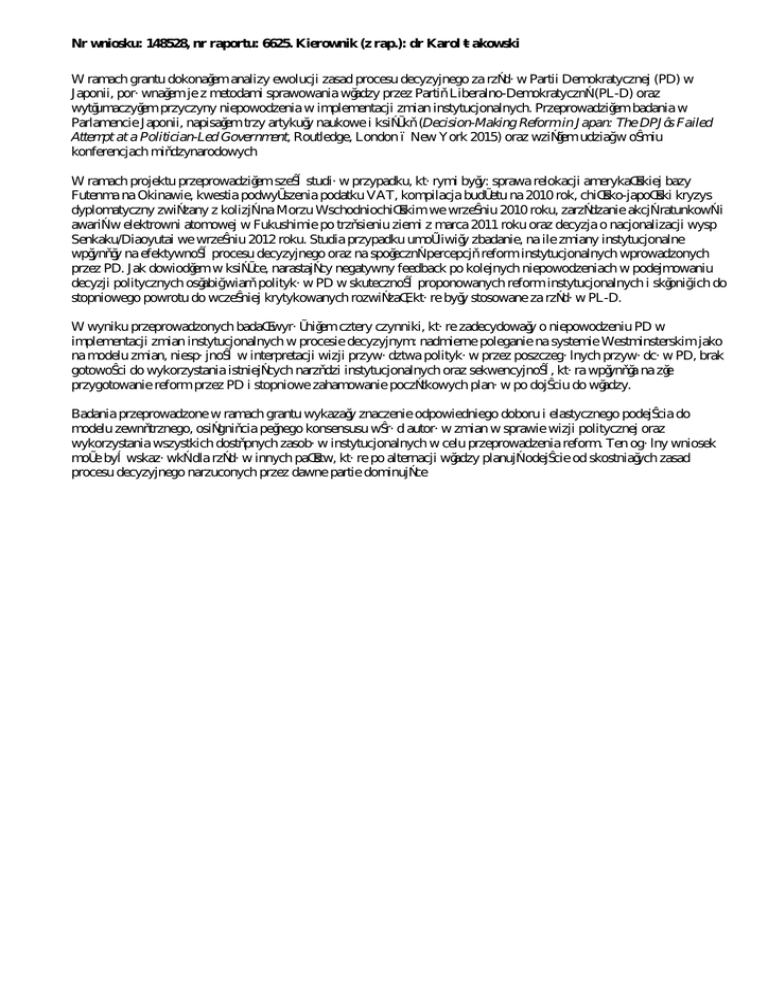 Nr wniosku: 148528, nr raportu: 6625. Kierownik (z rap.): dr Karol Żakowski W ramach grantu dokonałem analizy ewolucji zasad procesu decyzyjnego za rządów Partii Demokratycznej (PD) w Japonii, porównałem je z metodami sprawowania władzy przez Partię Liberalno-Demokratyczną (PL-D) oraz wytłumaczyłem przyczyny niepowodzenia w implementacji zmian instytucjonalnych. Przeprowadziłem badania w Parlamencie Japonii, napisałem trzy artykuły naukowe i książkę (Decision-Making Reform in Japan: The DPJ’s Failed Attempt at a Politician-Led Government, Routledge, London – New York 2015) oraz wziąłem udział w ośmiu konferencjach międzynarodowych W ramach projektu przeprowadziłem sześć studiów przypadku, którymi były: sprawa relokacji amerykańskiej bazy Futenma na Okinawie, kwestia podwyższenia podatku VAT, kompilacja budżetu na 2010 rok, chińsko-japoński kryzys dyplomatyczny związany z kolizją na Morzu Wschodniochińskim we wrześniu 2010 roku, zarządzanie akcją ratunkową i awarią w elektrowni atomowej w Fukushimie po trzęsieniu ziemi z marca 2011 roku oraz decyzja o nacjonalizacji wysp Senkaku/Diaoyutai we wrześniu 2012 roku. Studia przypadku umożliwiły zbadanie, na ile zmiany instytucjonalne wpłynęły na efektywność procesu decyzyjnego oraz na społeczną percepcję reform instytucjonalnych wprowadzonych przez PD. Jak dowiodłem w książce, narastający negatywny feedback po kolejnych niepowodzeniach w podejmowaniu decyzji politycznych osłabił wiarę polityków PD w skuteczność proponowanych reform instytucjonalnych i skłonił ich do stopniowego powrotu do wcześniej krytykowanych rozwiązań, które były stosowane za rządów PL-D. W wyniku przeprowadzonych badań wyróżniłem cztery czynniki, które zadecydowały o niepowodzeniu PD w implementacji zmian instytucjonalnych w procesie decyzyjnym: nadmierne poleganie na systemie Westminsterskim jako na modelu zmian, niespójność w interpretacji wizji przywództwa polityków przez poszczególnych przywódców PD, brak gotowości do wykorzystania istniejących narzędzi instytucjonalnych oraz sekwencyjność, która wpłynęła na złe przygotowanie reform przez PD i stopniowe zahamowanie początkowych planów po dojściu do władzy. Badania przeprowadzone w ramach grantu wykazały znaczenie odpowiedniego doboru i elastycznego podejścia do modelu zewnętrznego, osiągnięcia pełnego konsensusu wśród autorów zmian w sprawie wizji politycznej oraz wykorzystania wszystkich dostępnych zasobów instytucjonalnych w celu przeprowadzenia reform. Ten ogólny wniosek może być wskazówką dla rządów innych państw, które po alternacji władzy planują odejście od skostniałych zasad procesu decyzyjnego narzuconych przez dawne partie dominujące