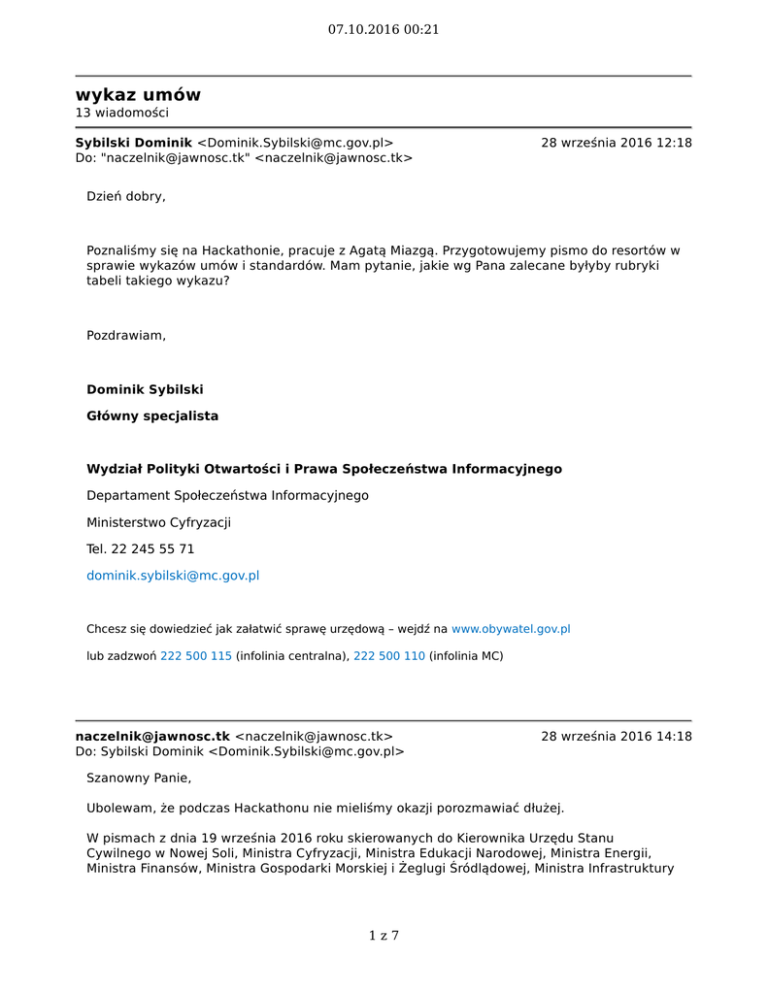 07.10.2016 00:21 wykaz umów 13 wiadomości Sybilski Dominik <[email protected]> Do: "[email protected]" <[email protected]> 28 września 2016 12:18 Dzień dobry, Poznaliśmy się na Hackathonie, pracuje z Agatą Miazgą. Przygotowujemy pismo do resortów w sprawie wykazów umów i standardów. Mam pytanie, jakie wg Pana zalecane byłyby rubryki tabeli takiego wykazu? Pozdrawiam, Dominik Sybilski Główny specjalista Wydział Polityki Otwartości i Prawa Społeczeństwa Informacyjnego Departament Społeczeństwa Informacyjnego Ministerstwo Cyfryzacji Tel. 22 245 55 71 [email protected] Chcesz się dowiedzieć jak załatwić sprawę urzędową – wejdź na www.obywatel.gov.pl lub zadzwoń 222 500 115 (infolinia centralna), 222 500 110 (infolinia MC) [email protected] <[email protected]> Do: Sybilski Dominik <[email protected]> 28 września 2016 14:18 Szanowny Panie, Ubolewam, że podczas Hackathonu nie mieliśmy okazji porozmawiać dłużej. W pismach z dnia 19 września 2016 roku skierowanych do Kierownika Urzędu Stanu Cywilnego w Nowej Soli, Ministra Cyfryzacji, Ministra Edukacji Narodowej, Ministra Energii, Ministra Finansów, Ministra Gospodarki Morskiej i Żeglugi Śródlądowej, Ministra Infrastruktury 1 z 7 07.10.2016 00:21 i Budownictwa, Ministra Kultury i Dziedzictwa Narodowego, Ministra Nauki i Szkolnictwa Wyższego, Ministra Obrony Narodowej, Ministra Rodziny, Pracy i Polityki Społecznej, Ministra Rolnictwa i Rozwoju Wsi, Ministra Rozwoju, Dyrektora Generalnego Ministerstwa Skarbu Państwa, Ministra Sportu i Turystyki, Ministra Sprawiedliwości, Ministra Spraw Wewnętrznych i Administracji, Ministra Spraw Zagranicznych, Ministra Środowiska, Ministra Zdrowia wskazywałem cyt. "Taki rejestr umów winien mieć formę zestawienia podlegającego bieżącej aktualizacji w okresie co najmniej miesiąca i zawierającej podstawowe informacji o wszystkich umowach zawieranych przez wszystkie komórki organizacyjne tut. Urzędu. W tych zestawieniu powinny się znaleźć co najmniej następujące rubryki: (i) data zawarcia umowy, (ii) przedmiot umowy, (iii) podmiot, z którym zawarto umowę, (iv) wartość umowy, (v) okres obowiązywania umowy, (vi) komórkę Urzędu z jakiej działalnością wiąże się zawarcie umowy, (vii) numer NIP/REGON/KRS w przypadku przedsiębiorców. Docelowo rejestr winien zawierać informacje o wszystkich wydatkach dokonywanych przez Urząd.". Kopia tych pism została przesłana do Minister Cyfryzacji w wiadomości z dnia 20 września 2016 roku, nie mniej przesyłam je powtórnie za pomocą adresu http://files.jawne.info.pl/private_html/2016_09_ 13b525a590ece0569e1c965aba4edd9ec27aa59e . Pragnę dodać, że przedstawiony zestawienie ma charakter minimalny (możliwy do zrealizowania w każdym przypadku bez nadmiernego wysiłku i wykrętów, więc odpowiedni do masowego nacisku), a ewentualny standard winien uwzględniać rosnące możliwości organizacyjne urzędów odnośnie publikacji takich danych, stopniowe poszerzanie zakresu danych, a docelowo publikowanie wszystkich nie wymagających ochrony danych finansowych. Warto zwrócić uwagę, że większość Minister ma treść umów w formie zeskanowanej, więc powinna je opublikować, tak jak robi to Szczecin. Podobnie dane finansowo-księgowe obrazujące faktyczną realizacje umowy np. w postaci faktur, przelewów powinna być publikowana. Szczegółowe dane o wydatkach (nie tylko na podstawie umów) są danymi pożądanymi społecznie, a publikuje je np. Gdańsk bez względu na kwotę. Można także inspirować się rozwiązaniami innych krajów np. Czechów i Słowacji ( http://informacjapubliczna.org.pl/7,898,_studium_przypadku_zamowienia_publiczne_w_ republice_slowackiej.html , http://blog.frankbold.pl/centralny-rejestr-umow-jak-to-robia-inni/, http://www.rp.pl/Firma/309239895-Czy-rejestrowac-umowy-zawierane-przez-firmy-z-panstw em.html ). Z poważaniem, [Ukryto cytowany tekst] Sybilski Dominik <[email protected]> Do: "[email protected]" <[email protected]> Dziękuję za odpowiedź From: [email protected] [mailto:[email protected]] Sent: Wednesday, September 28, 2016 2:19 PM To: Sybilski Dominik Subject: Re: wykaz umów [Ukryto cytowany tekst] 2 z 7 28 września 2016 14:22 07.10.2016 00:21 [email protected] <[email protected]> Do: Sybilski Dominik <[email protected]> 28 września 2016 14:30 Pozostaje do dyspozycji w razie dodatkowych pytań. Zwracam uwagę na teksty zebrane w dedykowanej kategorii na moim blogu. https://ochrona.jawne.info.pl/category/cru/ Z poważaniem, Sent with Mailtrack [Ukryto cytowany tekst] Sybilski Dominik <[email protected]> Do: "[email protected]" <[email protected]> 28 września 2016 14:38 Abstrahując od braku nr KRS/NIP/RGON zaproponowana struktura tabeli w CRPie https://danepubliczne.gov.pl/dataset/rejestr-zawartych-umow/resource /d802ef92-b44b-4ba1-998c-c9531c3dc78e spełnia Pana zdaniem to minimum? From: [email protected] [mailto:[email protected]] Sent: Wednesday, September 28, 2016 2:30 PM [Ukryto cytowany tekst] [Ukryto cytowany tekst] [email protected] <[email protected]> Do: Sybilski Dominik <[email protected]> 28 września 2016 14:45 Dane opublikowane na https://danepubliczne.gov.pl/dataset/rejestr-zawartych-umow/resource /d802ef92-b44b-4ba1-998c-c9531c3dc78e zawierają numer NIP, ale mimo to nie są optymalne do ponownego wykorzystywania. Sposób i zakres publikacji danych w tym konkretnym zbiorze stanowił przedmiot spotkania z p. Agatą Miazgą w dniu 28 września 2016 roku o godz. 10:00-11:30 w Gmachu Ministerstwa Cyfryzacji. Umówiony jestem na sporządzenie szczegółowej opinii odnoszącej się do tej kwestii i dostarczenie jej w przyszłym tygodniu. W obecnym projekcie mam zapisane - co może jednak ulec istotnej - zmianie następujące słowa: W nawiązaniu do publikacji rejestru zawartych umów Ministerstwa Cyfryzacji, a także w związku z moją prośbą o zamieszczanie w rejestrze numerów NIP/REGON/KRS (skierowana tuż po pierwszej publikacji m. in. na