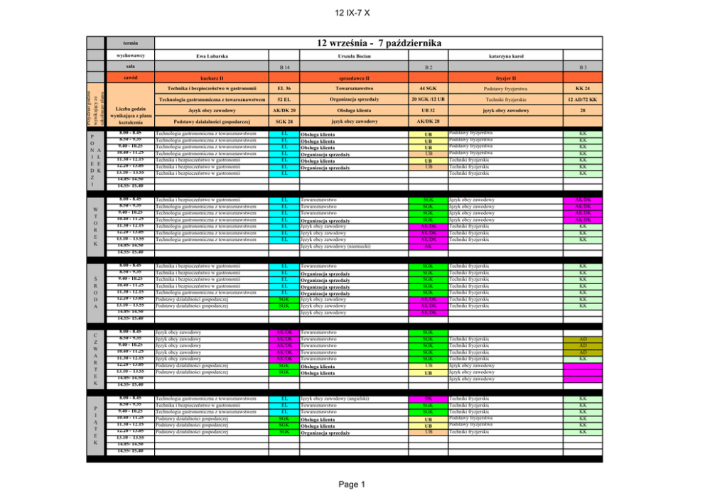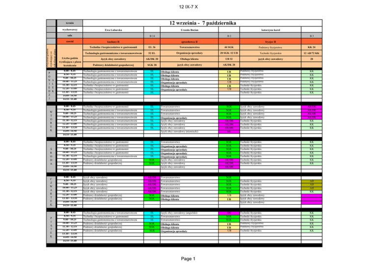 12 IX-7 X 12 września - 7 października termin wychowawcy Ewa Lubarska sala zawód Przydział godzin wynikający ze szkolnego planu fryzjer II EL 36 Towaroznawstwo 44 SGK Technologia gastronomiczna z towaroznawstwem 52 EL Organizacja sprzedaży Język obcy zawodowy AK/DK 20 Obsługa klienta Podstawy działalności gospodarczej SGK 28 język obcy zawodowy AK/DK 28 Technologia gastronomiczna z towaroznawstwem Technologia gastronomiczna z towaroznawstwem Technologia gastronomiczna z towaroznawstwem Technologia gastronomiczna z towaroznawstwem Technika i bezpieczeństwo w gastronomii Technika i bezpieczeństwo w gastronomii Technika i bezpieczeństwo w gastronomii EL EL EL EL EL EL EL Obsługa klienta Obsługa klienta Obsługa klienta Organizacja sprzedaży Obsługa klienta Organizacja sprzedaży W T O R E K 8.00 - 8.45 8.50 - 9.35 9.40 - 10.25 10.40 - 11.25 11.30 - 12.15 12.20 - 13.05 13.10 – 13.55 14.05- 14.50 14.55- 15.40 Technika i bezpieczeństwo w gastronomii Technologia gastronomiczna z towaroznawstwem Technologia gastronomiczna z towaroznawstwem Technologia gastronomiczna z towaroznawstwem Technologia gastronomiczna z towaroznawstwem Technologia gastronomiczna z towaroznawstwem Technologia gastronomiczna z towaroznawstwem EL EL EL EL EL EL EL Towaroznawstwo Towaroznawstwo Towaroznawstwo Technika i bezpieczeństwo w gastronomii Technika i bezpieczeństwo w gastronomii Technika i bezpieczeństwo w gastronomii Technika i bezpieczeństwo w gastronomii Technologia gastronomiczna z towaroznawstwem Podstawy działalności gospodarczej Podstawy działalności gospodarczej EL EL EL EL EL SGK SGK Towaroznawstwo Ś R O D A 8.00 - 8.45 8.50 - 9.35 9.40 - 10.25 10.40 - 11.25 11.30 - 12.15 12.20 - 13.05 13.10 – 13.55 14.05- 14.50 14.55- 15.40 C Z W A R T E K 8.00 - 8.45 8.50 - 9.35 9.40 - 10.25 10.40 - 11.25 11.30 - 12.15 12.20 - 13.05 13.10 – 13.55 14.05- 14.50 14.55- 15.40 Język obcy zawodowy Język obcy zawodowy Język obcy zawodowy Język obcy zawodowy Język obcy zawodowy Podstawy działalności gospodarczej Podstawy działalności gospodarczej AK/DK AK/DK AK/DK AK/DK AK/DK SGK SGK Towaroznawstwo Towaroznawstwo Towaroznawstwo Towaroznawstwo Towaroznawstwo P I Ą T E K 8.00 - 8.45 8.50 - 9.35 9.40 - 10.25 10.40 - 11.25 11.30 - 12.15 12.20 - 13.05 13.10 – 13.55 14.05- 14.50 14.55- 15.40 Technologia gastronomiczna z towaroznawstwem Technika i bezpieczeństwo w gastronomii Technologia gastronomiczna z towaroznawstwem Podstawy działalności gospodarczej Podstawy działalności gospodarczej Podstawy działalności gospodarczej A Ł E K B3 sprzedawca II 8.00 - 8.45 8.50 - 9.35 9.40 - 10.25 10.40 - 11.25 11.30 - 12.15 12.20 - 13.05 13.10 – 13.55 14.05- 14.50 14.55- 15.40 P O N I E D Z I katarzyna karol B2 kucharz II Technika i bezpieczeństwo w gastronomii Liczba godzin wynikająca z planu kształcenia Urszula Bocian B 14 EL EL EL SGK SGK SGK Organizacja sprzedaży Język obcy zawodowy Język obcy zawodowy Język obcy zawodowy Język obcy zawodowy (niemiecki) Organizacja sprzedaży Organizacja sprzedaży Organizacja sprzedaży Organizacja sprzedaży Język obcy zawodowy Język obcy zawodowy Język obcy zawodowy Podstawy fryzjerstwa KK 24 20 SGK /12 UB Techniki fryzjerskie 12 AD/72 KK UB 32 język obcy zawodowy 28 Podstawy fryzjerstwa Podstawy fryzjerstwa Podstawy fryzjerstwa Podstawy fryzjerstwa Techniki fryzjerskie Techniki fryzjerskie Techniki fryzjerskie KK KK KK KK KK KK KK SGK SGK SGK SGK AK/DK AK/DK AK/DK AK Język obcy zawodowy Język obcy zawodowy Język obcy zawodowy Język obcy zawodowy Techniki fryzjerskie Techniki fryzjerskie Techniki fryzjerskie AK/DK AK/DK AK/DK AK/DK KK KK KK SGK SGK SGK SGK SGK AK/DK AK/DK AK/DK Techniki fryzjerskie Techniki fryzjerskie Techniki fryzjerskie Techniki fryzjerskie Techniki fryzjerskie Techniki fryzjerskie Techniki fryzjerskie KK KK KK KK KK KK KK Techniki fryzjerskie Techniki fryzjerskie Techniki fryzjerskie Techniki fryzjerskie Język obcy zawodowy Język obcy zawodowy Język obcy zawodowy AD AD AD KK Techniki fryzjerskie Techniki fryzjerskie Techniki fryzjerskie Podstawy fryzjerstwa Podstawy fryzjerstwa Techniki fryzjerskie KK KK KK KK KK KK UB UB UB UB UB UB SGK SGK SGK SGK SGK UB Obsługa klienta Obsługa klienta UB Język obcy zawodowy (angielski) Towaroznawstwo Towaroznawstwo Obsługa klienta Obsługa klienta Organizacja sprzedaży Page 1 DK SGK SGK UB UB UB