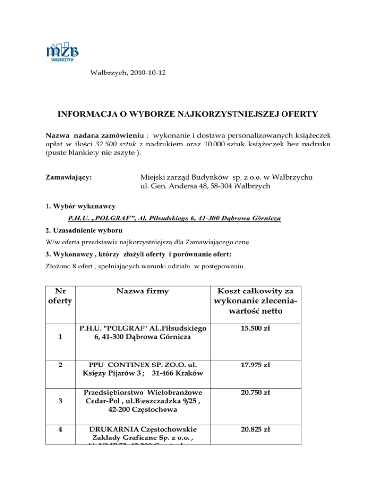 Wałbrzych, 2010-10-12 INFORMACJA O WYBORZE NAJKORZYSTNIEJSZEJ OFERTY Nazwa nadana zamówieniu : wykonanie i dostawa personalizowanych książeczek opłat w ilości 32.500 sztuk z nadrukiem oraz 10.000 sztuk książeczek bez nadruku (puste blankiety nie zszyte ). Miejski zarząd Budynków sp. z o.o. w Wałbrzychu ul. Gen. Andersa 48, 58-304 Wałbrzych Zamawiający: 1. Wybór wykonawcy P.H.U. „POLGRAF”, Al. Piłsudskiego 6, 41-300 Dąbrowa Górnicza 2. Uzasadnienie wyboru W/w oferta przedstawia najkorzystniejszą dla Zamawiającego cenę. 3. Wykonawcy , którzy złożyli oferty i porównanie ofert: Złożono 8 ofert , spełniających warunki udziału w postępowaniu. Nr oferty 1 2 3 4 Nazwa firmy Koszt całkowity za wykonanie zleceniawartość netto P.H.U. "POLGRAF" Al..Piłsudskiego 6, 41-300 Dąbrowa Górnicza 15.500 zł PPU CONTINEX SP. ZO.O. ul. Księzy Pijarów 3 ; 31-466 Kraków 17.975 zł Przedsiębiorstwo Wielobranżowe Cedar-Pol , ul.Bieszczadzka 9/25 , 42-200 Częstochowa 20.750 zł DRUKARNIA Częstochowskie Zakłady Graficzne Sp. z o.o. , Al NMP 52 42 200 C t h 20.825 zł Al..NMP 52, 42-200 Częstochowa 5 Andrzej Turowicz - ZT"COMPTUR" Sosnowiec Swiss Post Solutions Sp. z o.o. Zakład produkcyjny Wieliczka, ul.Krakowska 1, 32-020 Wieliczka 30.350 zł 7 STOLGRAF o/ Świdnica, ul.M.Konopnickiej 13, 58-100 Swidnica 47.975 zł 8 OMEKO JAN DWORZAŃSKI, UL.Zawiła 65D, 30-390 Kraków 55.250 zł 6 31.850 zł