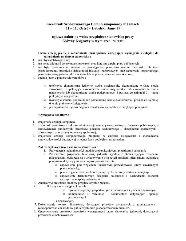 Kierownik Środowiskowego Domu Samopomocy w Jamach 21 – 110 Ostrów Lubelski, Jamy 29 ogłasza nabór na wolne urzędnicze stanowisko pracy Główny Księgowy w wymiarze 1/4 etatu 1. 2. 3. 4. Osoba ubiegająca się o zatrudnienie musi spełniać następujące wymagania niezbędne do zatrudnienia na danym stanowisku : ma obywatelstwo polskie; ma pełną zdolność do czynności prawnych oraz korzysta z pełni praw publicznych ; nie była prawomocnie skazana za przestępstwa: przeciwko mieniu, przeciwko obrotowi gospodarczemu, przeciwko działalności instytucji państwowych oraz samorządu terytorialnego, przeciwko wiarygodności dokumentów lub za przestępstwo karno – skarbowe; spełnia jeden z poniższych warunków : • • • ukończyła ekonomiczne jednolite studia magisterskie, ekonomiczne wyższe studia zawodowe, uzupełniające ekonomiczne studia magisterskie lub ekonomiczne studia magisterskie lub ekonomiczne studia podyplomowe i posiada co najmniej 3 – letnią praktykę w księgowości; ukończyła średnią, policealną lub pomaturalną szkołę ekonomiczną i posiada co najmniej 6 letnią praktykę w księgowości; jest wpisana do rejestru biegłych rewidentów na podstawie odrębnych przepisów. Wymagania dodatkowe : 1. 2. 3. 3. 4. 5. 6. znajomość obsługi komputera; znajomość przepisów z zakresu administracji samorządowej, ustawy o finansach publicznych, o zamówieniach publicznych, przepisów podatku dochodowego , ubezpieczeń społecznych i zdrowotnych oraz ustawy o pomocy społecznej; znajomość obsługi komputerowego programu w zakresie księgowania i sporządzania sprawozdawczości budżetowej w jednostkach podległych samorządom. Zakres wykonywanych zadań na stanowisku : 1. Prowadzenie rachunkowości zgodnie z obowiązującymi przepisami i zasadami; 2. Prowadzenie gospodarki finansowej jednostki zgodnie z obowiązującymi zasadami, polegającymi zwłaszcza na : wykonywanie dyspozycji środkami pieniężnymi zgodnie z przepisami dotyczącymi zasad wykonywania budżetu; • zapewnienie pod względem finansowym prawidłowości umów zawieranych przez jednostkę; • przestrzeganie zasad rozliczeń pieniężnych i ochrony wartości pieniężnych; • zapewnienie terminowego ściągania należności i dochodzenia roszczeń spornych oraz spłaty zobowiązań. Analiza wykorzystania środków przydzielonych z budżetu. Dokonywanie wstępnej kontroli : • zgodności operacji gospodarczych i finansowych z planem finansowym; • kompletność i rzetelność dokumentów dotyczących operacji gospodarczych i finansowych. Dokonywanie kontroli finansowej, dotyczącej procesów związanych z gromadzeniem i rozdysponowaniem środków publicznych oraz gospodarowaniem mieniem. Opracowywanie projektów przepisów wewnętrznych przez kierownika jednostki, dotyczących prowadzenia rachunkowości. 7. Opracowanie planów dochodów i wydatków budżetowych ( według podziału klasyfikacji budżetowej ). 8. Opracowanie zbiorczych sprawozdań finansowych z wykonania budżetu i ich analiz. Wymagane dokumenty : 1. życiorys ( CV ) z uwzględnieniem dokładnego przebiegu pracy zawodowej; 2. list motywacyjny; 3. dokumenty poświadczające wykształcenie oraz potwierdzające posiadane kwalifikacje i umiejętności ( potwierdzone kserokopie ); 4. oświadczenie osoby ubiegającej się o stanowisko o niekaralności za przestępstwo umyślne. Wymagane dokumenty należy składać osobiście w siedzibie Środowiskowego Domu Samopomocy, 21-110 Ostrów Lubelski, Jamy 29, w terminie do dnia 12.12.2011 r. do godz. 15 w pokoju nr 1 lub przesłać na wyżej wymieniony adres z dopiskiem na kopercie „ Dotyczy naboru na stanowisko Głównego Księgowego” ( decyduje data wpływu oferty ). Jamy, dnia 01.12.2011 r. Kierownik Środowiskowego Domu Samopomocy w Jamach Edyta Szkuat