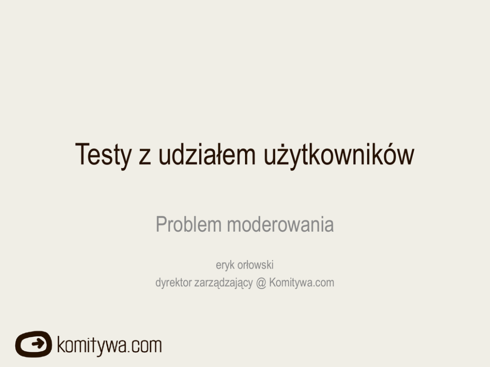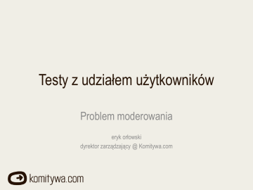 Testy z udziałem użytkowników Problem moderowania eryk orłowski dyrektor zarządzający @ Komitywa.com agenda » » » » » » » » » » » » Role moderatora Zaangażowanie vs. cel badania Wywiad wstępny Niech mówią Protokół głośnego myślenia Dopytywanie Zagrzewaj do boju Wsparcie dla użytkowników Po sesji badawczej Używam komputera za pomocą żony Jak unikać uprzedzeń Oglądaj nagrania z własnych sesji 2 Role moderatora badań » » » Sympatyczny gospodarz Lider Neutralny obserwator – Nie pozwól, by sympatyczny gospodarz w Tobie zagadał Twoich użytkowników – Użytkownicy oczekują od Ciebie wykonywania roli przewodnika, ale pozostaw ich w roli ekspertów 3 Zaangażowanie w interackję vs. cel badania » Mniej interakcji, jeżeli: – Interesuje Cię czas wykonania zadań – testujesz zaawansowane makiety, poszukując błędów » Więcej interakcji, jeżeli: – Testujesz wczesne koncepcje, wymagające omówień – 4 Wywiad wstępny » » Wykorzystuj wywiad do oswojenia respondentów z sytuacją Pozwól opowiedzieć dwa zdania o sobie, sposobach użytkowania podobnych produktów 5 Niech mówią » » » » Nie konwersuj, słuchaj „Przekazuj pałeczkę”, jeżeli to konieczne Zanim zapytasz, policz do dziesięciu ;-) Respondenci często oczekują potwierdzenia albo odpowiedzi na problem – odpowiadaj po zakończeniu sesji, proś o kontynuowanie zadań 6 Protokół głośnego myślenia (think aloud protocol) » » Proś o opisywanie oczekiwań w stosunku do testowanych elementów/funkcji Proś o komentarze w czasie sesji – Na co Pan/i patrzy? – Co się wydarzyło? » Unikaj pytania o przyczyny decyzji użytkownika w czasie wykonywania zadań (sugerują błąd) 7 Dopytywanie Dopytuj, jeżeli chcesz : » upewnić się, że respondent rozumie koncepcję » dowiedzieć się, dlaczego użytkownicy wybrali określoną opcję » zorientować się, czy efekt jest zgodny z oczekiwaniami » dowiedzieć się, czy użytkownicy zauważyli dany element (lepiej użyj eye-trackera ;-) Zasada: » Wyrażaj ciekawość, a nie pytaj wprost (vide: unikaj pytania o przyczyny) 8 Zagrzewaj do boju ;) » » Udzielaj pozytywnej informacji zwrotnej PO wykonaniu zadania Mów o formie, nie odnosząc się do treści – Pani komentarz był bardzo pomocny – Bardzo dobrze sobie Pan poradził z tym zadaniem! » Użytkownicy bardzo lubią obwiniać siebie samych za napotykane problemy z wykonaniem zadania – Wszyscy mają problem z tym zadaniem (umniejsza wagę problemu) – Nie jednocz się w bólu z użytkownikiem (wzmacnia negatywną reakcję i może wpływać na kolejne zadania i komentarze) 9 Wsparcie dla użytkowników » Udzielaj wsparcia/interweniuj, jeżeli: – Respondent utknął, a problem został już zdiagnozowany – Użytkownik zabrnąć zbyt głęboko w błędną ścieżkę – Użytkownik sądzi, że wykonał zadanie, którego nie wykonał (jeżeli zależy Ci na wykryciu dalszych problemów) – użytkownik wykonuje zadanie według nieoczekiwanego scenariusza (np. używa funkcji wyszukiwania zamiast przeglądania) » Nie tłumacz intencji projektantów – Jeżeli użytkownik błędnie zinterpretował przeznaczenie danej funkcji / znaczenie etykiety, możesz na koniec wyjaśnić zamierzenia i poprosić o opisanie pożądanej przez użytkownika formy » » Możesz przypominać treść zadania Analizując materiał, pamiętaj o udzielonym wsparciu 10 Po sesji badawczej... » Wyjaśnij to, czego nie mogłeś/aś podczas badania – Zorientujesz się, czy użytkownicy zrozumieli właściwie koncepcję » Pozwól stronom trzecim zamienić kilka zdań z respondentem (klient, projektant, it developer) – Twoi klienci bądź IT rzadko mają okazję zobaczyć „żywego użytkownika”, mogą mieć pytania o przebieg konkretnych zadań 11 - Używam komputera za pomocą żony. » Na pewno zdarzy Ci się trafić na nietypowych respondentów – Problemy nie muszą wiązać się z intelektem respondentów (np. problemy z uczeniem się interfejsu, dysleksja) – Tylko część użytkowników przyznaje się do problemów » » » Daj nietypowym respondentom więcej czasu na zrozumienie zadań Nie oczekuj zbyt wiele po komentarzach głosowych Nie każ wypełniać ankiet osobiście 12 Jak unikać uprzedzeń » » » » Trzymaj się skryptu (jeżeli to możliwe) Zadawaj pytania otwarte Postaraj się zadawać te same pytania wszystkim respondentom Odpowiadaj pytaniem na pytanie – Czy to jest to, co powinienem kliknąć? – A co Pan sądzi na ten temat? 13 Oglądaj nagrania z własnych sesji » Prawie nikt nie lubi oglądać i słuchać siebie samego na ekranie – Analiza materiałów z własnych sesji badawczych to najlepszy sposób na unikanie przyszłych błędów 14 Na podstawie... » Moderating Usability Tests, Principles & Practices for Interacting – Joe Dumas, Beth Loring, Copyright © Elsevier Inc. » Liczne doświadczenia własne 15 Dziękuję za uwagę http://tnij.org/moderowanie eryk orłowski @ Komitywa.com [email protected] || 605 103 742 || gg# 2765