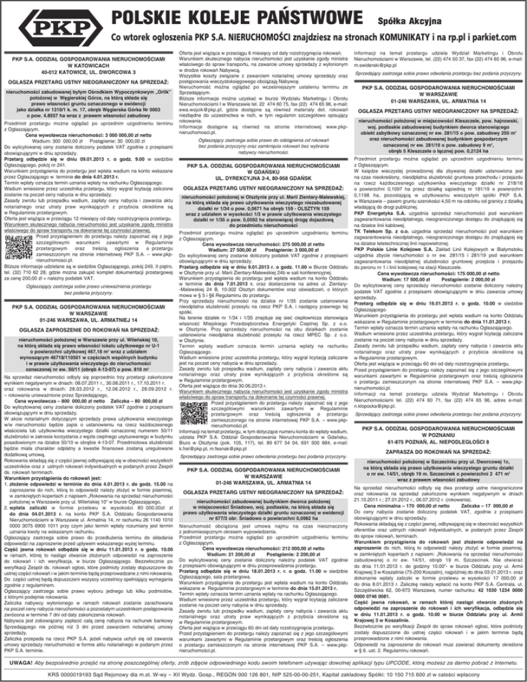 Co wtorek ogłoszenia PKP S.A. NIERUCHOMOŚCI znajdziesz na stronach KOMUNIKATY i na rp.pl i parkiet.com PKP S.A. ODDZIAŁ GOSPODAROWANIA NIERUCHOMOŚCIAMI W KATOWICACH 40-012 KATOWICE, UL. DWORCOWA 3 OGŁASZA PRZETARG USTNY NIEOGRANICZONY NA SPRZEDAŻ: nieruchomości zabudowanej byłym Ośrodkiem Wypoczynkowym „Orlik” położonej w Węgierskiej Górce, na którą składa się prawo własności gruntu oznaczonego w ewidencji jako działka nr 1310/1 k. m. 17, obręb Węgierska Górka Nr 0003 o pow. 4.8557 ha wraz z prawem własności zabudowy Przedmiot przetargu można oglądać po uprzednim uzgodnieniu terminu z Ogłaszającym. Cena wywoławcza nieruchomości: 3 000 000,00 zł netto Wadium: 300 000,00 zł Postąpienie: 30 000,00 zł Do wylicytowanej ceny zostanie doliczony podatek VAT zgodnie z przepisami obowiązującymi w dniu sprzedaży. Przetarg odbędzie się w dniu 09.01.2013 r. o godz. 9.00 w siedzibie Ogłaszającego, pokój nr 241. Warunkiem przystąpienia do przetargu jest wpłata wadium na konto wskazane przez Ogłaszającego w terminie do dnia 4.01.2013 r. Termin wpłaty oznacza termin uznania wpłaty na rachunku Ogłaszającego. Wadium wniesione przez uczestnika przetargu, który wygrał licytację zaliczone zostanie na poczet ceny nabycia w dnu sprzedaży. Zasady zwrotu lub przepadku wadium, zapłaty ceny nabycia i zawarcia aktu notarialnego oraz utraty praw wynikających z przybicia określone są w Regulaminie przetargowym. Oferta jest wiążąca w przeciągu 12 miesięcy od daty rozstrzygnięcia przetargu. Warunkiem skutecznego nabycia nieruchomości jest uzyskanie zgody ministra właściwego do spraw transportu na dokonanie tej czynności prawnej. Przed przystąpieniem do przetargu należy zapoznać się z jego szczegółowymi warunkami zawartymi w Regulaminie przetargowym oraz treścią ogłoszenia o przetargu zamieszczonym na stronie internetowej PKP S.A. – www.pkpnieruchomosci.pl. Bliższe informacje udzielane są w siedzibie Ogłaszającego, pokój 249, II piętro, tel. (32) 710 62 28, gdzie można zakupić komplet dokumentacji przetargowej za cenę 200,00 zł + należny podatek VAT. Ogłaszający zastrzega sobie prawo unieważnienia przetargu bez podania przyczyny. PKP S.A. ODDZIAŁ GOSPODAROWANIA NIERUCHOMOŚCIAMI W WARSZAWIE 01-246 WARSZAWA, UL. ARMATNIEJ 14 OGŁASZA ZAPROSZENIE DO ROKOWAŃ NA SPRZEDAŻ: nieruchomości położonej w Warszawie przy ul. Wileńskiej 10, na którą składa się prawo własności lokalu użytkowego nr U-1 o powierzchni użytkowej 467,18 m2 wraz z udziałem wynoszącym 46718/110501 w częściach wspólnych budynku i w prawie użytkowania wieczystego do nieruchomości oznaczonej nr ew. 50/11 (obręb 4-13-07) o pow. 810 m2 Na sprzedaż nieruchomości odbyły się poprzednio trzy przetargi zakończone wynikiem negatywnym w dniach: 08.07.2011 r., 30.08.2011 r., 17.10.2011 r. oraz rokowania w dniach: 28.03.2012 r., 12.06.2012 r., 28.09.2012 r. – rokowania unieważnione przez Sprzedającego, Cena wywoławcza – 800 000,00 zł netto Zaliczka – 80 000,00 zł Do wylicytowanej ceny zostanie doliczony podatek VAT zgodnie z przepisami obowiązującymi w dniu sprzedaży. W akcie notarialnym dotyczącym sprzedaży prawa użytkowania wieczystego w/w nieruchomości będzie zapis o ustanowieniu na rzecz każdoczesnego właściciela lub użytkownika wieczystego działki oznaczonej numerem 50/11 służebności w zakresie korzystania z węzła cieplnego usytuowanego w budynku posadowionym na działce 50/10 w obrębie 4-13-07. Przedmiotowa służebność będzie miała charakter odpłatny a kwestie finansowe zostaną uregulowane dodatkową umową. Rokowania składają się z części jawnej odbywającej się w obecności wszystkich uczestników oraz z ustnych rokowań indywidualnych w podanych przez Zespół ds. rokowań terminach. Warunkiem przystąpienia do rokowań jest: 1. złożenie odpowiedzi w terminie do dnia 4.01.2013 r. do godz. 15.00 na zaproszenie do nich, którą to odpowiedź należy złożyć w formie pisemnej, w zamkniętych kopertach z napisem „Rokowania na sprzedaż nieruchomości położonej w Warszawie przy ul. Wileńskiej 10” w biurze Ogłaszającego, 2. wpłata zaliczki w formie przelewu w wysokości 80 000,00zł zł do dnia 04.01.2013 r. na konto PKP S.A. Oddziału Gospodarowania Nieruchomościami w Warszawie ul. Armatnia 14, nr rachunku 26 1140 1010 0000 3075 6900 1011 przy czym jako termin wpłaty rozumiany jest termin uznania kwoty na wskazanym rachunku. Ogłaszający zastrzega sobie prawo do przedłużenia terminu do składania odpowiedzi na zaproszenie przed upływem wskazanego wyżej terminu. Część jawna rokowań odbędzie się w dniu 11.01.2013 r. o godz. 10.00 w ramach, której to nastąpi otwarcie złożonych odpowiedzi na zaproszenie do rokowań i ich weryfikacja, w biurze Ogłaszającego. Bezzwłocznie po weryfikacji Zespół ds. rokowań ogłosi, które podmioty zostały dopuszczone do ustnej części rokowań i w jakim terminie będą przeprowadzane z nimi rokowania. Do części ustnej będą dopuszczeni wszyscy uczestnicy spełniający wymagania zgodnie z regulaminem. Ogłaszający zastrzega sobie prawo wyboru jednego lub kilku podmiotów, z którymi podejmie rokowania. Zaliczka nabywcy wyłonionego w ramach rokowań zostanie zarachowana na poczet ceny nabycia nieruchomości a pozostałym uczestnikom postępowania zwrócona w terminie 7 dni od daty zakończenia rokowań. Nabywca jest zobowiązany zapłacić całą cenę nabycia na rachunek bankowy Sprzedającego nie później niż 3 dni przed zawarciem notarialnej umowy sprzedaży. Zaliczka przepada na rzecz PKP S.A. jeżeli nabywca uchyli się od zawarcia umowy sprzedaży nieruchomości w formie aktu notarialnego w podanym przez PKP S.A. terminie. Oferta jest wiążąca w przeciągu 6 miesięcy od daty rozstrzygnięcia rokowań. Warunkiem skutecznego nabycia nieruchomości jest uzyskanie zgody ministra właściwego do spraw transportu, na zawarcie umo