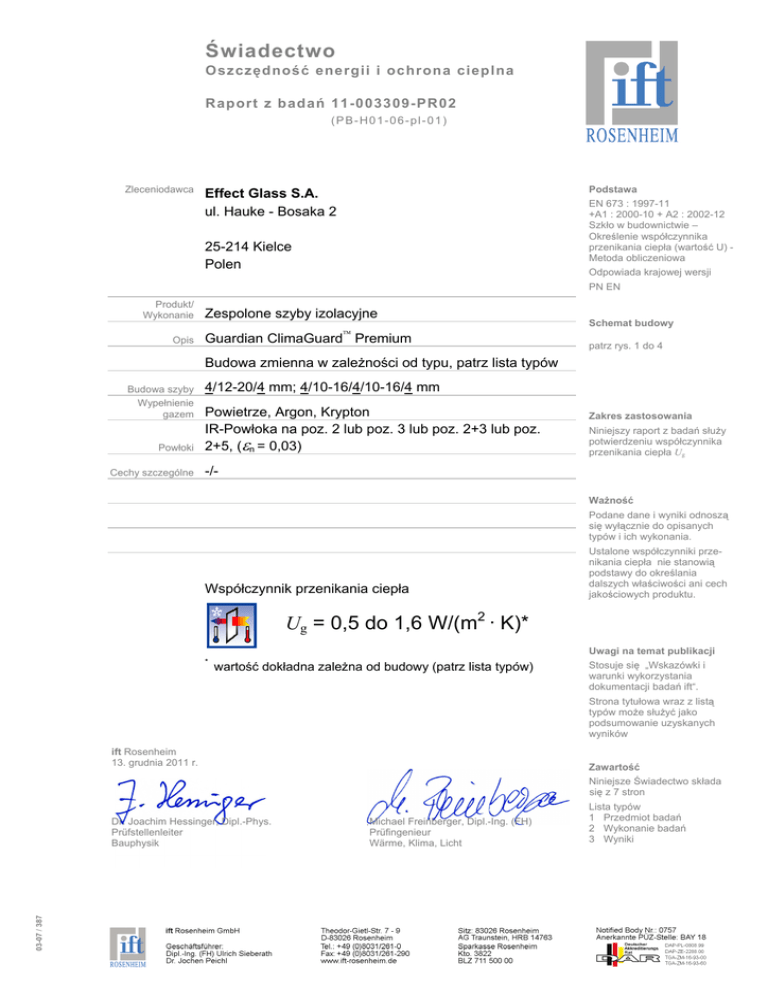 Świadectwo Oszczędność energii i ochrona cieplna Raport z badań 11-003309-PR02 (PB-H01-06-pl-01) Zleceniodawca Podstawa Effect Glass S.A. ul. Hauke - Bosaka 2 EN 673 : 1997-11 +A1 : 2000-10 + A2 : 2002-12 Szkło w budownictwie – Określenie współczynnika przenikania ciepła (wartość U) Metoda obliczeniowa 25-214 Kielce Polen Odpowiada krajowej wersji PN EN Produkt/ Wykonanie Opis Zespolone szyby izolacyjne Guardian ClimaGuard Premium Schemat budowy patrz rys. 1 do 4 Budowa zmienna w zależności od typu, patrz lista typów Budowa szyby Wypełnienie gazem Powłoki Cechy szczególne 4/12-20/4 mm; 4/10-16/4/10-16/4 mm Powietrze, Argon, Krypton IR-Powłoka na poz. 2 lub poz. 3 lub poz. 2+3 lub poz. 2+5, (εn = 0,03) Zakres zastosowania Niniejszy raport z badań służy potwierdzeniu współczynnika przenikania ciepła Ug -/Ważność Podane dane i wyniki odnoszą się wyłącznie do opisanych typów i ich wykonania. Współczynnik przenikania ciepła Ustalone współczynniki przenikania ciepła nie stanowią podstawy do określania dalszych właściwości ani cech jakościowych produktu. Ug = 0,5 do 1,6 W/(m2 · K)* Uwagi na temat publikacji * wartość dokładna zależna od budowy (patrz lista typów) Stosuje się „Wskazówki i warunki wykorzystania dokumentacji badań ift“. Strona tytułowa wraz z listą typów może służyć jako podsumowanie uzyskanych wyników ift Rosenheim 13. grudnia 2011 r. Zawartość Niniejsze Świadectwo składa się z 7 stron 03-07 / 387 Dr. Joachim Hessinger, Dipl.-Phys. Prüfstellenleiter Bauphysik Michael Freinberger, Dipl.-Ing. (FH) Prüfingenieur Wärme, Klima, Licht Lista typów 1 Przedmiot badań 2 Wykonanie badań 3 Wyniki Świadectwo. Oszczędność energii i ochrona cieplna Arkusz 2 vz7 Świadectwo 11-003309-PR02 (PB-H01-06-pl-01) z 13. grudnia 2011 r. Zleceniodawca: Effect Glass S.A., PL-25-214 Kielce Lista typów zespolonych szyb izolacyjnych Guardian ClimaGuard Premium Wartości przyjęte do obliczeń Typ szyby Budowa Gaz εn* Ug wyliczona wartość Ug wg DIN EN 673 ∆T = 15 K 2 w W/(m ⋅K) w mm w% 4/12/4 - Powietrze 2 0,03 1,6 2 Guardian ClimaGuard Premium 4/14/4 - Powietrze 2 0,03 1,5 3 Guardian ClimaGuard Premium 4/18/4 - Powietrze 2 0,03 1,4 - Powietrze 2 0,03 1,4 4/12/4 - Powietrze 3 0,03 1,6 4/14/4 - Powietrze 3 0,03 1,5 7 Guardian ClimaGuard Premium 4/16/4 - Powietrze 3 0,03 1,4 8 Guardian ClimaGuard Premium 4/18/4 - Powietrze 3 0,03 1,4 4/20/4 - Powietrze 3 0,03 1,4 4/12/4 90 Argon 2 0,03 1,3 4/14/4 90 Argon 2 0,03 1,2 12 Guardian ClimaGuard Premium 4/16/4 90 Argon 2 0,03 1,1 13 Guardian ClimaGuard Premium 4/18/4 90 Argon 2 0,03 1,1 4/20/4 90 Argon 2 0,03 1,2 4/20/4 91 Argon 2 0,03 1,1 4/12/4 90 Argon 3 0,03 1,3 17 Guardian ClimaGuard Premium 4/14/4 90 Argon 3 0,03 1,2 18 Guardian ClimaGuard Premium 4/16/4 90 Argon 3 0,03 1,1 19 Guardian ClimaGuard Premium 4/18/4 90 Argon 3 0,03 1,1 4/20/4 90 Argon 3 0,03 1,2 4/20/4 91 Argon 3 0,03 1,1 4/10/4 90 Krypton 2 0,03 1,0 23 Guardian ClimaGuard Premium 4/12/4 90 Krypton 2 0,03 1,1 24 Guardian ClimaGuard Premium 4/12/4 92 Krypton 2 0,03 1,0 4/16/4 90 Krypton 2 0,03 1,1 4/10/4 90 Krypton 3 0,03 1,0 4/12/4 90 Krypton 3 0,03 1,1 28 Guardian ClimaGuard Premium 4/12/4 92 Krypton 3 0,03 1,0 29 Guardian ClimaGuard Premium 4/16/4 90 Krypton 3 0,03 1,1 1 Guardian ClimaGuard Premium 4 Guardian ClimaGuard Premium 5 Guardian ClimaGuard Premium 6 Guardian ClimaGuard Premium 9 Guardian ClimaGuard Premium 10 Guardian ClimaGuard Premium 11 Guardian ClimaGuard Premium 14 Guardian ClimaGuard Premium 15 Guardian ClimaGuard Premium 16 Guardian ClimaGuard Premium \\sift01\iftello_daten_rw\Ablage\VO11003309\Projekt\PR02\Prüfberichte\11-003309-PR02 PB-H0106-pl-01_PB02.doc Stopień wypełnienia E ** 20 Guardian ClimaGuard Premium 21 Guardian ClimaGuard Premium 22 Guardian ClimaGuard Premium 25 Guardian ClimaGuard Premium 26 Guardian ClimaGuard Premium 27 Guardian ClimaGuard Premium 4/20/4 Świadectwo. Oszczędność energii i ochrona cieplna Arkusz 3 vz7 Świadectwo 11-003309-PR02 (PB-H01-06-pl-01) z 13. grudnia 2011 r. Zleceniodawca: Effect Glass S.A., PL-25-214 Kielce Wartości przyjęte do obliczeń Typ szyby Budowa Stopień wypełnienia Gaz E ** Ug wyliczona wartość Ug wg DIN EN 673 ∆T = 15 K 2 w W/(m ⋅K) w mm w% 4/12/4 90 Argon 2+3 0,03 1,2 4/15/4 94 Argon 2+3 0,03 1,0 32 Guardian ClimaGuard Premium 4/12/4 90 Krypton 2+3 0,03 1,0 33 Guardian ClimaGuard Premium 4/14/4 90 Krypton 2+3 0,03 1,0 34 Guardian ClimaGuard Premium 4/16/4 90 Krypton 2+3 0,03 1,0 4/18/4 90 Krypton 2+3 0,03 1,1 4/10/4/10/4 90 Argon 2+5 0,03 0,8 4/12/4/12/4 90 Argon 2+5 0,03 0,7 38 Guardian ClimaGuard Premium 4/14/4/14/4 90 Argon 2+5 0,03 0,6 39 Guardian ClimaGuard Premium 4/16/4/16/4 90 Argon 2+5 0,03 0,6 4/10/4/10/4 90 Krypton 2+5 0,03 0,6 4/12/4/12/4 90 Krypton 2+5 0,03 0,5 30 Guardian ClimaGuard Premium 31 Guardian ClimaGuard Premium 35 Guardian ClimaGuard Premium 36 Guardian ClimaGuard Premium 37 Guardian ClimaGuard Premium 40 Guardian ClimaGuard Premium 41 Guardian ClimaGuard Premium E** pozycja powłoki εn* \\sift01\iftello_daten_rw\Ablage\VO11003309\Projekt\PR02\Prüfberichte\11-003309-PR02 PB-H0106-pl-01_PB02.doc εn* emisyjność normalna; Źródło: badanie wg pkt. 2.2 przeprowadzone w ift Świadectwo. Oszczędność energii i ochrona cieplna Arkusz 4 vz7 Świadectwo 11-003309-PR02 (PB-H01-06-pl-01) z 13. grudnia 2011 r. Zleceniodawca: Effect Glass S.A., PL-25-214 Kielce 1 Przedmiot badań 1.1 Opis (wszystkie wymiary w mm) Produkt Opis p[roduktu Konfiguracja w mm Powłoka Typ / Dostawca Pozycje powłoki Emisyjność normalna εn Żródło Wypełnienie komór gazem Gaz Objętość % Zespolone szyby izolacyjne Guardian ClimaGuard Premium patrz lista typów Guardian ClimaGuard Premium/ Guardian 2, 3, 2+3, 2+5 0,03 Pomiar według EN 12898 według informacji zleceniodawcy patrz lista typów patrz lista typów Opisy i numery artykułów, jak również dane materiałowe, są informacjami podanymi przez zleceniodawcę i o