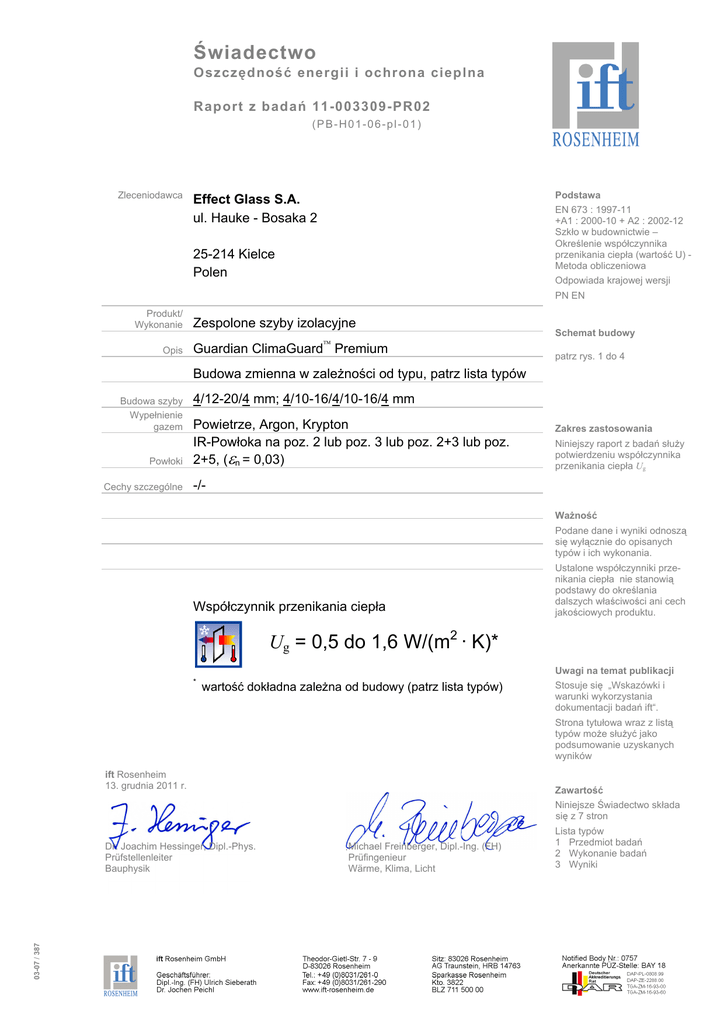 Świadectwo Ug = 0,5 do 1,6 W/(m · K)*
