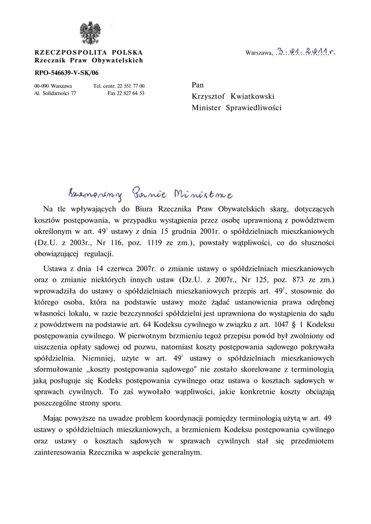 R Z E C Z P O S P O L I T A POLSKA Rzecznik Praw O b y w a t e l s k i c h RPO-546639-V-SK/06 00-090 Warszawa Al. Solidarności 77 Tel. centr. 22 551 77 00 Fax 22 827 64 53 Pan Krzysztof Kwiatkowski Minister Sprawiedliwości Na tle wpływających do Biura Rzecznika Praw Obywatelskich skarg, dotyczących kosztów postępowania, w przypadku wystąpienia przez osobę uprawnioną z powództwem określonym w art. 491 ustawy z dnia 15 grudnia 2001r. o spółdzielniach mieszkaniowych (Dz.U. z 2003r., Nr 116, poz. 1119 ze zm.), powstały wątpliwości, co do słuszności obowiązującej regulacji. Ustawa z dnia 14 czerwca 2007r. o zmianie ustawy o spółdzielniach mieszkaniowych oraz o zmianie niektórych innych ustaw (Dz.U. z 2007r., Nr 125, poz. 873 ze zm.) wprowadziła do ustawy o spółdzielniach mieszkaniowych przepis art. 491, stosownie do którego osoba, która na podstawie ustawy może żądać ustanowienia prawa odrębnej własności lokalu, w razie bezczynności spółdzielni jest uprawniona do wystąpienia do sądu z powództwem na podstawie art. 64 Kodeksu cywilnego w związku z art. 1047 § 1 Kodeksu postępowania cywilnego. W pierwotnym brzmieniu tegoż przepisu powód był zwolniony od uiszczenia opłaty sądowej od pozwu, natomiast koszty postępowania sądowego pokrywała spółdzielnia. Niemniej, użyte w art. 491 ustawy o spółdzielniach mieszkaniowych sformułowanie „koszty postępowania sądowego" nie zostało skorelowane z terminologią jaką posługuje się Kodeks postępowania cywilnego oraz ustawa o kosztach sądowych w sprawach cywilnych. To zaś wywołało wątpliwości, jakie konkretnie koszty obciążają poszczególne strony sporu. Mając powyższe na uwadze problem koordynacji pomiędzy terminologią użytą w art. 49 ustawy o spółdzielniach mieszkaniowych, a brzmieniem Kodeksu postępowania cywilnego oraz ustawy o kosztach sądowych w sprawach cywilnych stał się przedmiotem zainteresowania Rzecznika w aspekcie generalnym. 2 W wystąpieniu z dnia 26 listopada 2008r. (RPO-601030-V-SK/08) Rzecznik zwrócił uwagę ówczesnemu Ministrowi Sprawiedliwości, iż z pism kierowanych do Rzecznika wynika, że obywatele są przekonani, iż regulacja art. 49' ustawy o spółdzielniach mieszkaniowych wyłącza zastosowanie ogólnych przepisów dotyczących odpowiedzialności za wynik postępowania, w szczególności art. 108 ustawy o kosztach sądowych w sprawach cywilnych nakazującego obowiązek zwrotu kosztów procesu przeciwnikowi, także gdy strona była zwolniona od kosztów sądowych. Natomiast, analiza nadsyłanych Rzecznikowi orzeczeń sądowych, zapadłych w sprawach dotyczących przenoszenia odrębnej własności lokali w zasobach spółdzielczych, pozwala stwierdzić, iż sądy orzekały w sposób zróżnicowany. Użyte w omawianym zakresie nieprecyzyjne sformułowania, niepowiązane z językiem Kodeksu postępowania cywilnego oraz ustawy o kosztach sądowych w sprawach cywilnych były zatem źródłem problemów zarówno dla osób próbujących realizować swoje roszczenia, dla spółdzielni mieszkaniowych, jak i dla sądów, które musiały interpretować niejasny przepis. Odpowiadając na ww. wystąpienie Rzecznika, Minister Sprawiedliwości podzielił stanowisko o braku koordynacji pomiędzy terminologią użytą w art. 491 ustawy o spółdzielniach mieszkaniowych, a brzmieniem Kodeksu postępowania cywilnego oraz ustawy o kosztach sądowych w sprawach cywilnych (pismo z dnia 8 stycznia 2009r., znak: DL-P-II-0760-11/08). Ponadto, Minister wyjaśnił, że jakkolwiek z orzecznictwa nie wynika, aby na gruncie art. 491 ww. ustawy spółdzielnie - bez względu na wynik postępowania - były obciążane wszystkim kosztami związanymi z postępowaniem sądowym, to celem usunięcia wątpliwości interpretacyjnych niezbędne jest doprecyzowanie przepisu art. 491 ustawy o spółdzielniach mieszkaniowych. W toku uzgodnień międzyresortowych dotyczących nowelizacji ustawy o spółdzielniach mieszkaniowych Ministerstwo Sprawiedliwości zgłosiło propozycję zmiany art. 491 ustawy o spółdzielniach mieszkaniowych poprzez zastąpienie pojęcia „kosztów postępowania sądowego" pojęciem „kosztów sądowych" (pismo Ministra Sprawiedliwości z dnia 19 czerwca 2009r., znak: DL-P-II-0760-11/08, DL-P-II-4162-4/09). Ponadto Ministerstwo Sprawiedliwości postulowało rezygnację z zapisu, iż koszty obciążają spółdzielnię - stojąc na stanowisku, że w tym zakresie zastosowanie powinny znaleźć ogólne zasady przewidziane w art. 113 ustawy o kosztach sądowych w sprawach cywilnych. W toku dalszych uzgodnień Ministerstwo Infrastruktury zaproponowało z kolei ograniczenie zawartej w powyższym przepisie regulacji dotyczącej zwolnienia od kosztów sądowych poprzez pozostawienie jedynie zwolnienia z opłaty od pozwu. W tym miejscu należy podnieść, że propozycje w przedmiocie zmiany treści art. 491 ustawy o spółdzielniach mieszkaniowych, przedkładane tak przez Ministra Sprawiedliwości, jak i Ministra Infrastruktury, nie znalazły pełnego odzwierciedlenia w nowelizacji ustawy o spółdzielniach mieszkaniowych opierającej się głównie na projekcie 3 poselskim. Ustawodawca doprecyzował bowiem wyrażenie użyte w powyższej regulacji, przy czym przyjął zasadę, zgodnie z którą praktycznie wszystkie koszty postępowania winny obciążać stronę pozwaną (spółdzielnię mieszkaniową). Mianowicie, od dnia 1 1 stycznia 2010r. przepis art. 49 zd. 2 w/w ustawy wyraźnie stanowi, że osoba, która w razie bezczynności spółdzielni, wystąpiła do sądu z powództwem na podstawie art. 64 Kodeksu cywilnego w związku z art. 1047 § 1 Kodeksu postępowania cywilnego nie ponosi tak kosztów sądowych, jak i kosztów zastępstwa procesowego, które pokrywa spółdzielnia. W 1 zaistniałym stanie rzeczy aktualne brzmienie art. 49 zd. 2 w/w ustawy nie pozostawia wątpliwości, co do zasad ponoszenia kosztów w sprawie dotyczącej żądania ustanowienia prawa