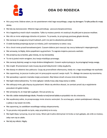 ODA DO RODZICA Nie psuj mnie. Dobrze wiem, że nie powinienem mieć tego wszystkiego, czego się domagam. To tylko próba sil z mojej strony. Nie bój się stanowczości. Właśnie tego potrzebuję - poczucia bezpieczeństwa. Nie bagatelizuj moich złych nawyków. Tylko ty możesz pomóc mi zwalczyć zło póki jest to jeszcze możliwe. Nie rób ze mnie większego dziecka niż jestem. To prawda, że przyjmuję postawę głupio dorosłą. Nie zwracaj mi uwagi przy innych ludziach, jeśli nie jest to absolutnie potrzebne. O wiele bardziej przejmuję się tym co mówisz, jeśli rozmawiamy w cztery- oczy. N i e chroń mnie przed konsekwencjami. Czasem dobrze jest nauczyć się rzeczy bolesnych i nieprzyjemnych. Nie wmawiaj, że błędy, które popełniam są grzechem. To zagraża mojemu poczuciu wartości. Nie przejmuj się za bardzo, gdy mówię, że cię nienawidzę To nie ty jesteś moim wrogiem, lecz twoja miażdżąca przewaga. Nie zwracaj zbytniej uwagi na moje drobne dolegliwości. Czasem wykorzystuję je, by przyciągnąć twoją uwagę. Nie zrzędź. W przeciwnym razie muszę się przed tobą bronić i robię się głuchy. Nie dawaj mi obietnic bez pokrycia. Czuję się przeraźliwie stłamszony, kiedy nic z tego wszystkiego nie wychodzi. Nie zapominaj, że jeszcze trudno jest mi precyzyjnie wyrazić swoje myśli. To dlatego nie zawsze się rozumiemy. Nie sprawdzaj z uporem maniaka mojej uczciwości. Zbyt łatwo strach zmusza mnie do kłamstwa. Nie bądź niekonsekwentny. To mnie ogłupia i wtedy tracę całą moją wiarę w siebie. Nie odtrącaj mnie, gdy dręczę cię pytaniami. Może się wkrótce okazać, że zamiast prosić cię o wyjaśnienie poszukam ich gdzie indziej. Nie wmawiaj mi, że moje lęki są głupie. One po prostu są. Nie rób z siebie nieskazitelnego ideału. Prawda na twój temat byłaby w przyszłości nie do zniesienia. Nie wyobrażaj sobie, że przepraszając mnie stracisz autorytet. Za uczciwą grę umiem podziękować miłością, o jakiej ci się nawet nie śniło. Nie zapominaj, że uwielbiam wszelkiego rodzaju eksperymenty. To po prostu mój sposób na życie, więc przymknij na to oczy. Nie bądź ślepy i przyznaj, że ja też rosnę. Wiem jak trudno dotrzymać mi kroku w tym galopie, ale zrób co możesz, żeby nam się to udało. Nie bój się miłości. Nigdy.