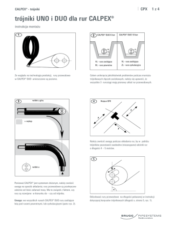 CPX CALPEX® - trójniki 1z4 trójniki UNO i DUO dla rur CALPEX® instrukcja montażu CALPEX® DUO 6 bar Ze względu na technologię produkcji, rury przewodowe w CALPEX® DUO umieszczone są poziomo. widok z góry CALPEX® DUO 10 bar VL - rura zasilająca VL - rura zasilająca RL - rura powrotna ZL - rura cyrkulacyjna Celem uniknięcia jakichkolwiek problemów podczas montażu trójnikowych złączek zaciskowych, należy się upewnić, że wszystkie 3 rurociągi mają pionowy układ rur przewodowych. Korpus GFK = wykop Należy zwrócić uwagę podczas układania rur, by w pobliżu trójników pozostawić swobodne (niezasypane) odcinki rur o długości 4 – 5 metrów. widok a Ponieważ CALPEX® jest systemem złożonym, należy zwrócić uwagę na sposób układania; rury przewodowe są przekręcane zależnie od ilości załamań trasy. Ma to związek z faktem, czy rury są rozwijane w kierunku do – czy od trójnika. Uwaga: we wszystkich rurach CALPEX® DUO rury zasilające leżą pod rurami powrotnymi, lub cyrkulacyjnymi (patrz rys. 2). Odizolować rury przewodowe na długości pokazanej w instrukcji dotyczącej korpusów trójnikowych (długość x, strona 5, rys. 1). CPX CALPEX® - trójniki 2z4 trójniki UNO i DUO dla rur CALPEX® instrukcja montażu Dla rur DUO zamknięcie odgałęzień we wspólnym korpusie oznacza konieczność jednoczesnego pozycjonowania obu złączek trójnikowych. Należy w tym celu : Nasunąć pierścienie ślizgowe. Rozpęczyć narzędziem końcówkę rury zasilającej (przez ok. 60 sek.). Rozpęczyć narzędziem końcówkę rury powrotnej (cyrkulacyjnej) przez ok. 50 sek. Ponownie rozpęczyć końcówkę rury zasilającej (przez ok. 40 sek.). Ponownie rozpęczyć końcówkę rury powrotnej (cyrkulacyjnej) przez ok. 30 sek. Założyć obie złączki trójnikowe. Nasunąć narzędziem pierścienie ślizgowe. Powtórzyć czynności na rurze przelotowej. CPX CALPEX® - trójniki trójniki UNO i DUO dla rur CALPEX® instrukcja montażu Powtórzyć czynności na odgałęzieniach. Nałożyć oba półkorpusy trójnikowe zgodnie z instrukcjami montażu (strona 5 i 6). Korpus trójnikowy GFK na obu półskorupach Zamontować złączkę trójnikową na rurach przewodowych, zgodnie z instrukcjami Rehau / Beulco. Jeśli potrzeba, należy odciąć redukcję na korpusie piłą. Wcisnąć taśmę uszczelniającą do rowków na obrzeżach korpusu (na obu połowach). pierścień redukcyjny Jeśli trzeba, należy na rurę płaszczową nałożyć pierścień redukcyjny, owijając go podwójnie taśmą uszczelniającą, a następnie umieścić trójnik w korpusie. Skręcić obie połówki korpusu symetrycznie (patrz rysunek 4), momentem nie większym niż 10,5 Nm. Po ok. 10 minutach dociągnąć śruby. 3z4 CPX CALPEX® - trójniki 4z4 trójniki UNO i DUO dla rur CALPEX® instrukcja montażu pojemnik na piankę PUR Próba ciśnieniowa (max. 0,3 bara). Wlać przygotowaną według instrukcji piankę do otworu. Pojemnik z pianką musi się znajdować nad otworem wlewowym. zakrętka uszczelnienie O-ring uszczelniający Natychmiast po wlaniu pianki nakręcić korek, uważając na prawidłowe umieszczenie pierścienia uszczelniającego. Gdy tylko nadmiar pianki wypchnie kulkę w korku, zamontować końcową zakrętkę z uszczelnieniem.