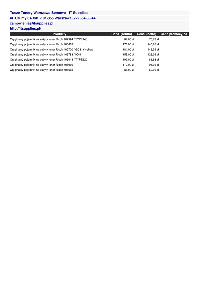 Tusze Tonery Warszawa Bemowo - IT Supplies ul. Czumy 6A lok. 7 01-355 Warszawa (22) 664-33-44 [email protected] http://itsupplies.pl/ Produkty Oryginalny pojemnik na zużyty toner Ricoh 402324 / TYPE145 Cena (brutto) Cena (netto) 87,00 zł 70,73 zł Oryginalny pojemnik na zużyty toner Ricoh 405663 173,00 zł 140,65 zł Oryginalny pojemnik na zużyty toner Ricoh 405700 / GC31Y yellow 184,00 zł 149,59 zł Oryginalny pojemnik na zużyty toner Ricoh 405783 / IC41 155,00 zł 126,02 zł Oryginalny pojemnik na zużyty toner Ricoh 406043 / TYPE220 102,00 zł 82,93 zł Oryginalny pojemnik na zużyty toner Ricoh 406066 112,00 zł 91,06 zł Oryginalny pojemnik na zużyty toner Ricoh 406665 86,00 zł 69,92 zł Cena promocyjna