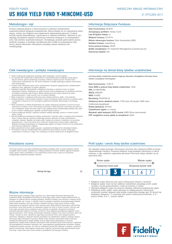 ret.pl.xx.20170131.LU1284733786.pdf US High Yield Fund Y-MINCOME-USD FIDELITY FUNDS MIESIĘCZNY ARKUSZ INFORMACYJNY US HIGH YIELD FUND Y-MINCOME-USD 31 STYCZEŃ 2017 Metodologia i styl Informacje Dotyczące Funduszu Fundusz inwestuje głównie w denominowane w dolarach amerykańskich wysokodochodowe obligacje przedsiębiorstw. Nacisk kładzie się na indywidualny dobór pozycji, analizę due diligence oraz zapewnienie odpowiedniej płynności. Fundusz cechuje wysoka dywersyfikacja i ograniczenia w zakresie emitentów i sektorów w celu lepszego zarządzania ryzykiem koncentracji naturalnie istniejącym na amerykańskim rynku instrumentów wysokodochodowych. Zarządzający posiada jednocześnie pewną swobodę inwestycji w strategie nieindeksowe jako środek do podwyższenia stóp zwrotu, jednak elementem nadrzędnym pozostaje zawsze realizacja celu inwestycyjnego. Data Uruchomienia: 05.09.01 Zarządzający portfelem: Harley J Lank Lata W Spółce Fidelity: 21 Wielkość Funduszu: $ 3.977m Waluta referencyjna funduszu: Dolar Amerykański (USD) Siedziba funduszu: Luksemburg Forma prawna funduszu: SICAV Spółka zarządzająca: FIL Investment Management (Luxembourg) S.A. Gwarancja kapitału: Nie Cele inwestycyjne i polityka inwestycyjna Informacje na temat klasy tytułów uczestnictwa • Celem funduszu jest osiągnięcie wysokiego zysku bieżącego i wzrostu kapitału. • Co najmniej 70% środków jest inwestowanych w wysokodochodowe obligacje niższej jakości, których emitenci główną działalność prowadzą w Stanach Zjednoczonych. Fundusz może maksymalnie zainwestować do 10% swoich aktywów w kredyty spełniające kryteria instrumentów rynku pieniężnego. • Fundusz może inwestować poza swoim podstawowym obszarem geograficznym, podstawowymi sektorami rynku, gałęziami czy typami aktywów. • Inwestycje mogą być dokonywane w obligacje emitowane w walutach innych niż waluta referencyjna funduszu. Ekspozycję na ryzyko kursowe można zabezpieczyć na przykład za pomocą kontraktów walutowych typu forward. Walutą referencyjną jest waluta używana do celów sprawozdawczości i może ona być inna niż waluta transakcji. • Może inwestować w obligacje emitowane przez władze publiczne, spółki i inne podmioty. • Rodzaje obligacji, w które przede wszystkim fundusz zainwestuje, będą narażone na wysokie ryzyko i nie będzie w stosunku do nich wymagane spełnienie standardu dotyczącego minimalnego ratingu. • Może inwestować w aktywa bezpośrednio lub uzyskać ekspozycję pośrednio za pomocą innych dozwolonych środków, w tym instrumentów pochodnych. Może stosować instrumenty pochodne w celu zmniejszenia ryzyka lub kosztu bądź w celu wygenerowania dodatkowego kapitału albo zysku, w tym w celach inwestycyjnych, zgodnie z profilem ryzyka funduszu. • Fundusz podejmuje decyzje o wyborze inwestycji według własnego uznania w ramach swoich celów i zasad. • Zysk jest wypłacany posiadaczom tytułów uczestnictwa z dochodu netto z inwestycji przez większość czasu. Fundusz dąży do utrzymania stabilnego poziomu płatności na tytuły uczestnictwa w rozsądnym zakresie. Wypłata nie będzie stała i będzie się zmieniać w zależności od warunków gospodarczych i innych warunków oraz możliwości obsługi przez fundusz stałych wypłat bez długoterminowego pozytywnego ani negatywnego wpływu na kapitał. Oznacza to, że okazjonalnie zysk może być wypłacany z kapitału. • Tytuły uczestnictwa można zwykle kupować i sprzedawać każdego dnia roboczego funduszu. • Ten fundusz może być nieodpowiedni dla inwestorów, którzy planują umorzyć swoje tytuły uczestnictwa w funduszu w ciągu 5 lat. Inwestycję w fundusz należy uznać za długoterminową. Inne klasy tytułów uczestnictwa również mogą być oferowane. Szczegółowe informacje można znaleźć w prospekcie informacyjnym. Niezależna ocena Profil ryzyka i zwrotu klasy tytułów uczestnictwa Informacje zawarte w tej sekcji przedstawiają ostatnio dostępne dane na dzień publikacji. Dalsze szczegóły można znaleźć w glosariuszu niniejszej publikacji. Ponieważ niektóre agencje ratingowe mogą używać wyniki z przeszłości w celu wytworzenia swoich ocen, oceny te nie stanowią wiarygodnego wskaźnika przyszłych wyników. Ten wskaźnik ryzyka pochodzi z Kluczowych informacji dla inwestorów (KIID) na koniec odpowiedniego miesiąca. Ponieważ wskaźniki mogą podlegać aktualizacji w trakcie miesiąca, w celu uzyskania najbardziej aktualnych informacji należy odwołać się do dokumentu KIID. Rating Feri’ego: Data Uruchomienia: 15.09.15 Cena WAN w walucie klasy tytułów uczestnictwa: 10,44 ISIN: LU1284733786 SEDOL: BYP5LP9 WKN: A14ZR2 Bloomberg: FFUHYYM LX Ostateczny termin składania zleceń: 17:00 czasu UK (zwykle 18:00 czasu środkowoeuropejskiego) Rodzaj dystrybucji: Dochód Częstotliwość wypłat: co miesiąc Wysokość opłat bieżących (OCF) rocznie: 0,89% (Dane szacunkowe) OCF uwzględnia roczną opłatę za zarządzanie: 0,65% (B) Ważne informacje Przed dokonaniem inwestycji należy zapoznać się z dokumentem Kluczowe Informacje Dla Inwestorów (KIID). Szczegółowe informacje na temat tego, gdzie można znaleźć dokument KIID, są dostępne na ostatniej stronie niniejszej publikacji. Wartość inwestycji oraz dochód z inwestycji może zarówno spadać, jak i rosnąć, a inwestor może nie odzyskać pierwotnie zainwestowanego kapitału. Jeżeli waluta inwestora różni się od waluty inwestycji funduszu, stopy zwrotu funduszu mogą pozostawać pod wpływem wahań kursów wymiany walut. Wykorzystanie finansowych instrumentów pochodnych może doprowadzić do zwiększenia zysków lub strat w ramach funduszu. Plynnosc jest miara tego, jak latwo dana inwestycje mozna zamienic na gotówke. W pewnych warunkach rynkowych sprzedaz aktywów moze byc utrudniona. Ceny obligacji pozostają pod wpływem zmian stóp procentowych, zmian ratingu kredytowego emitentów ob