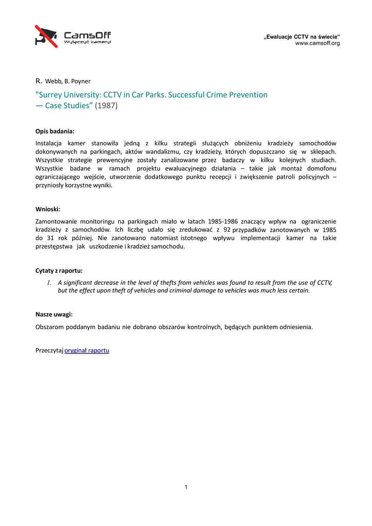 „Ewaluacje CCTV na świecie” www.camsoff.org R. Webb, B. Poyner "Surrey University: CCTV in Car Parks. Successful Crime Prevention — Case Studies” (1987) Opis badania: Instalacja kamer stanowiła jedną z kilku strategii służących obniżeniu kradzieży samochodów dokonywanych na parkingach, aktów wandalizmu, czy kradzieży, których dopuszczano się w sklepach. Wszystkie strategie prewencyjne zostały zanalizowane przez badaczy w kilku kolejnych studiach. Wszystkie badane w ramach projektu ewaluacyjnego działania – takie jak montaż domofonu ograniczającego wejście, utworzenie dodatkowego punktu recepcji i zwiększenie patroli policyjnych – przyniosły korzystne wyniki. Wnioski: Zamontowanie monitoringu na parkingach miało w latach 1985-1986 znaczący wpływ na ograniczenie kradzieży z samochodów. Ich liczbę udało się zredukować z 92 przypadków zanotowanych w 1985 do 31 rok później. Nie zanotowano natomiast istotnego wpływu implementacji kamer na takie przestępstwa jak uszkodzenie i kradzież samochodu. Cytaty z raportu: 1. A significant decrease in the level of thefts from vehicles was found to result from the use of CCTV, but the effect upon theft of vehicles and criminal damage to vehicles was much less certain. Nasze uwagi: Obszarom poddanym badaniu nie dobrano obszarów kontrolnych, będących punktem odniesienia. Przeczytaj oryginał raportu 1 „Ewaluacje CCTV na świecie” www.camsoff.org B. Webb, G. Laycock ”Reducing crime on the London Underground” (1992) (badanie Home Office Crime Prevention Unit) Opis badania: Badanie systemu CCTV zamontowanego w 1988 r. w szeroki sposób diagnozuje charakter problemów, z jakimi borykały się służby mundurowe i władze metra przed instalacją. Stosunkowo długi okres analizy, kompleksowe omówienie programów prewencyjnych stosowanych przed i po wdrożeniu monitoringu, wyznaczenie obszaru kontrolnego – to niewątpliwe zalety studium. Przed wdrożeniem kamer deklarowano, że celem działania jest ograniczenie kradzieży kieszonkowych, walka z przypadkami niszczenia mienia i zniwelowanie poczucia zagrożenia korzystających z metra. Wnioski: Badania wykazały brak skuteczności monitoringu w obniżaniu kradzieży kieszonkowych i nie zredukowały znacząco niszczenia mienia. Wpływ instalacji kamer na komfort w podróżowaniu i wzrost poczucia bezpieczeństwa został uznany za niepewny. Cytaty z raportu: 1. The robbery data is more reliable and shows no evidence that the project has been an effective crime prevention initiative. 2. The survey team found limited evidence of change in passengers attitudes and feelings which could be attributed to the pilot project. Nasze uwagi: Stosunkowo krótki okres analizy po wprowadzeniu programów. Przeczytaj oryginał raportu 2 „Ewaluacje CCTV na świecie” www.camsoff.org N. Tilley "Understading car parks, crime and CCTV: Evaluation lessons from safer cities” (1993) (badanie Home Office Police Research Group) Opis badania: Przedmiotem badania Tilley'a, określanego w literaturze jako ewaluacja realistyczna, był wpływ, jaki instalacja kamer będzie mieć na ilość przestępstw samochodowych. Systemy CCTV wdrożono w 6 miastach Wielkiej Brytanii. Wnioski: Efektem była redukcja ilości kradzieży samochodów. Słabszą zależność odnotowano pomiędzy instalacją kamer a obniżeniem kradzieży z samochodów. Zaobserwowano ponadto, że większe korzyści prewencyjne mogą płynąć z działań lub aktywności służb mundurowych, które będą realizowane w krótkim okresie, lecz z dużą intensywnością niż w długim czasie przy zwykłym nakładzie środków. Dużą rolę w budowaniu wizerunku monitoringu jako skutecznego narzędzia prewencyjnego przyznano również mediom. Cytaty z raportu: 1. An evaluation of six crime prevention initiatives found that overall car crime had reduced in the car parks in which CCTV had been installed, when compared either to a period prior to the installation or to control areas without CCTV. The effects appeared to be more positive for theft of as opposed to theft from vehicles. 2. With many other crime prevention efforts, if and when the real potential of CCTV to lead to apprehension loses credibility amongst car criminals, the effect will begin to fade, though by highly publicised (over)-statement of successes periodic effectiveness may be reestablished. Nasze uwagi: W badaniu nie uwzględniono trendów w przestępczości notowanych przed instalacją kamer – analizą objęto wyłącznie okres roku przed i po implementacji CCTV. Przeczytaj oryginał raportu 3 „Ewaluacje CCTV na świecie” www.camsoff.org B. Brown "CCTV in Town Centres: Three case studies" (1995) (badanie Home Office Police Research Group) Opis badania: Studium stanowi próbę diagnozy wpływu instalacji kamer na większość kategorii przestępstw w trzech miastach Wielkiej Brytanii (Newcastle, Birmingham, King's Lynn). W przypadku Birmirgham zbadano również poziom poczucia bezpieczeństwa mieszkańców. Wnioski: Instalacja kamer w centrum trzech miast w większości miała wpływ na ograniczenie ilości przestępstw przeciwko mieniu. Efekt ten zaobserwowano zwłaszcza w przypadku rozbojów i kradzieży kieszonkowych. Z kolei w Birmingham, po zainstalowaniu monitoringu, wystąpiło statystycznie istotne zjawisko przemieszczenia przestępczości. Oznacza to, że w obszarze objętym zasięgiem kamer udało się ograniczyć kradzież z samochodów, podczas gdy w odpowiadającym mu obszarze bez kamer liczba kradzieży wzrosła o niemal identyczną liczbę. Po implementacji kamer w Birmingham zaobserwowano również korzystne zjawisko znane jako dyfuzja korzyści. Cytaty z raportu: 1. The findings from the case studies indicate that CCTV camera systems can help reduce the incidence of property crime within town centres. In Newcastle and King's Lynn, and to a lesser extent Birmingham, property crime has reduced in those areas covered by cameras. This re