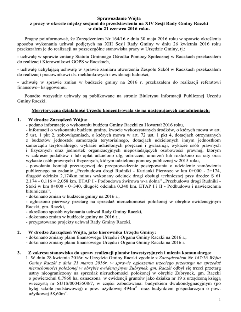 Sprawozdanie Wójta z pracy w okresie między sesjami do przedstawienia na XIV Sesji Rady Gminy Raczki w dniu 21 czerwca 2016 roku. Pragnę poinformować, że Zarządzeniem Nr 164/16 z dnia 30 maja 2016 roku w sprawie określenia sposobu wykonania uchwał podjętych na XIII Sesji Rady Gminy w dniu 26 kwietnia 2016 roku przekazałem je do realizacji na poszczególne stanowiska pracy w Urzędzie Gminy, tj.: - uchwałę w sprawie zmiany Statutu Gminnego Ośrodka Pomocy Społecznej w Raczkach przekazałem do realizacji Kierownikowi GOPS w Raczkach, - uchwałę uchylającą uchwałę w sprawie zamiaru utworzenia Zespołu Szkół w Raczkach przekazałem do realizacji pracownikowi ds. meldunkowych i ewidencji ludności, - uchwałę w sprawie zmian w budżecie gminy na 2016 r. przekazałem do realizacji referatowi finansowo– księgowemu. Ponadto wszystkie uchwały są publikowane na stronie Biuletynu Informacji Publicznej Urzędu Gminy Raczki. Merytoryczna działalność Urzędu koncentrowała się na następujących zagadnieniach: 1. W drodze Zarządzeń Wójta: - podano informację o wykonaniu budżetu Gminy Raczki za I kwartał 2016 roku, - informacji o wykonaniu budżetu gminy, kwocie wykorzystanych środków, o których mowa w art. 5 ust. 1 pkt 2, zobowiązaniach, o których mowa w art. 72 ust. 1 pkt 4, dotacjach otrzymanych z budżetów jednostek samorządu terytorialnego, dotacjach udzielonych innym jednostkom samorządu terytorialnego, wykazie udzielonych poręczeń i gwarancji, wykazie osób prawnych i fizycznych oraz jednostek organizacyjnych nieposiadających osobowości prawnej, którym w zakresie podatków i lub opłat udzielono ulg, odroczeń, umorzeń lub rozłożono na raty oraz wykazie osób prawnych i fizycznych, którym udzielono pomocy publicznej w 2015 roku, - powołania komisji przetargowej do przeprowadzenie postępowania o udzielenie zamówienia publicznego na zadanie „Przebudowa drogi Rudniki - Kurianki Pierwsze w km 0+000 - 2+174, długość odcinka 2,174km minus wykonany odcinek drogi obsługi technicznej przy drodze S 61 2,174 - 0,116 = 2,058 km. ETAP I - Podbudowa żwirowa w-a dolna” „Przebudowa drogi Rudniki Stoki w km 0+000 - 0+340, długość odcinka 0,340 km. ETAP I i II - Podbudowa i nawierzchnia bitumiczna”, - dokonano zmian w budżecie gminy na 2016 r., - ogłoszono pierwszy przetarg na sprzedaż nieruchomości położonej w obrębie ewidencyjnym Raczki, gm. Raczki, - określono sposób wykonania uchwał Rady Gminy Raczki, - dokonano zmian w budżecie gminy na 2016 r., - przygotowano projekty uchwał Rady Gminy Raczki. 2. W drodze Zarządzeń Wójta, jako kierownika Urzędu Gminy: - dokonano zmiany planu finansowego Urzędu i Organu Gminy Raczki na 2016 r., - dokonano zmiany planu finansowego Urzędu i Organu Gminy Raczki na 2016 r. 3. Z zakresu stanowiska do spraw realizacji planów inwestycyjnych i mienia komunalnego: 1. W dniu 28 kwietnia 2016r. w Urzędzie Gminy Raczki zgodnie z Zarządzeniem Nr 147/16 Wójta Gminy Raczki z dnia 21 marca 2016r. w sprawie ogłoszenia trzeciego przetargu na sprzedaż nieruchomości położonej w obrębie ewidencyjnym Żubrynek, gm. Raczki odbył się trzeci przetarg ustny nieograniczony na sprzedaż nieruchomości położonej w obrębie Żubrynek, gm. Raczki o powierzchni 0,7960 ha, oznaczona w ewidencji gruntów jako działka nr 19 z urządzoną księgą wieczystą nr SU1S/00043508/7, w części zabudowana: budynkiem dwukondygnacyjnym (po byłej szkole podstawowej) o pow. użytkowej 494m2 oraz budynkiem gospodarczym o pow. użytkowej 58,60m2. 1 Liczba osób dopuszczonych – 2 osoby. Liczba osób niedopuszczonych – brak. Cena wywoławcza nieruchomości - 250.000 zł (słownie złotych: dwieście pięćdziesiąt tysięcy). Cena najwyższa osiągnięta w przetargu – 262.500 zł (słownie złotych: dwieście sześćdziesiąt dwa tysiące pięćset). 2. Zgodnie z Zarządzeniem Nr 163/16 Wójta Gminy Raczki z dnia 12 maja 2016r. w sprawie ogłoszenia pierwszego przetargu na sprzedaż nieruchomości położonej w obrębie ewidencyjnym Raczki, gm. Raczki został ogłoszony pierwszy przetarg ustny nieograniczony na sprzedaż nieruchomości gruntowej niezabudowanej położonej w obrębie ewidencyjnym Raczki, gm. Raczki o łącznej powierzchni 0,7308 ha, oznaczonej w ewidencji gruntów jako działki numer 929/4 i 929/5 z urządzoną księgą wieczystą numer SU1S/00027224/4. Nieruchomość zgodnie z obowiązującym miejscowym planem zagospodarowania przestrzennego położona jest na terenie usług komercyjnych. Cena wywoławcza w kwocie: - 620.000 zł, Wysokość wadium w kwocie: - 50.000 zł, Przetarg odbędzie się w dniu 21 lipca 2016 r. w budynku Urzędu Gminy Raczki przy Placu Kościuszki 14, pokój nr 11 i rozpocznie się o godz. 10.00. 4. Z zakresu Referatu inwestycji, planowania przestrzennego i gospodarki nieruchomościami: 1. Zaświadczenia o przeznaczeniu nieruchomości w miejscowym planie zagospodarowania przestrzennego: - wydano 16 zaświadczeń. 2. Decyzje o warunkach zabudowy: - wydano 3 decyzje, - 2 postępowania umorzono, - prowadzone jest 7 postępowań. 3. Decyzje o ustalenie lokalizacji inwestycji celu publicznego: - wydano 2 decyzje w sprawie: „Budowa osadnika wtórnego i pompowni osadów w oczyszczalni ścieków w Dowspudzie, gm. Raczki”, „Budowa słupa linii napowietrznej SN-20kV, budowa linii napowietrznej i kablowej SN- 20kV, budowa słupowej stacji transformatorowej napowietrznej 20kV/04kV, budowa linii kablowej nn-0,4kV wraz ze złączem kablowo-pomiarowym, na nieruchomościach położonych w obrębie 0003- Chodźki, gm. Raczki oznaczonych na mapie ewidencji gruntów numerami geodezyjnymi: 109/4, 116, 20, 115/2, 109/3” - prowadzone jest 1 postępowanie w sprawie: „Budowa i przebudowa drogi Wysokie-Słoboda ulepszonej pospółką na żwirową”. 4. Decyzje o podział nieruchomości: - wydano 2 decyzje; - prowadzone są 3 postępowania. 5. W zakresie planowania i zagospodarowania prze