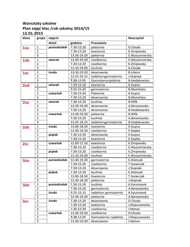 Warsztaty szkolne Plan zajęć klas /rok szkolny 2014/15 12.01.2015 klasa 1za 1zb 1zc 2zd 2za 2zb 2zc 3za 3zb 3zc grupa zajęcia 1 2 3 1 2 3 1 2 3 1 2 1 2 1 2 3 1 2 3 1 2 1 2 1 2 1 2 1 2 3 1 2 3 1 2 1 2 1 2 3 1 2 3 dzień godzina poniedziałek 7.30-13.20 7.30-13.20 13.30-19.20 wtorek 13.30-19.20 7.30-13.20 13.10-19.00 środa 13.30-19.20 13.25-19.15 7.15-13.05 wtorek 7.30-13.20 9.55-15.45 czwartek 7.30-13.20 7.30-13.20 wtorek 7.30-13.20 13.30-19.20 7.30-13.20 czwartek 13.30-19.20 7.30-13.20 13.25-19.15 środa 13.00-18.50 13.30-19.20 piątek 7.30-13.20 7.30-13.20 czwartek 12.00-17.50 7.30-13.20 piątek 7.30-13.20 13.10-19.00 poniedziałek 13.30-19.20 7.30-13.20 7.30-13.20 piątek 7.30-13.20 13.00-18.50 12.30-18.20 poniedziałek 7.30-13.20 7.30-13.20 środa 9.25-15.15 13.30-19.20 środa 7.30-13.20 7.30-13.20 7.30-13.20 czwartek 13.30-19.20 7.15-13.05 13.30-19.20 Nauczyciel Pracownia piekarnia kawiarnia piekarnia ciastkarnia ciastkarnia kuchnia deserownia Jadalnia+garmażernia Garmażeria+jadalnia kawiarnia garmażernia Piekarnia deserownia kuchnia deserownia deserownia piekarnia kuchnia Jadalnia+garmażernia kawiarnia ciastkarnia deserownia kawiarnia kawiarnia ciastkarnia ciastkarnia kuchnia garmażernia ciastkarnia deserownia kuchnia Kawiarnia piekarnia kuchnia garmażernia Jadalnia+ garmażernia piekarnia deserownia kawiarnia ciastkarnia ciastkarnia Garmażernia +jadalnia deserownia D.Chuda K.Żmijewska E.Wyszomierska E.Wyszomierska K.Żmijewska D.Chuda B.Libera J.Stajniak B.Hodakowska K.Kupisz B.Słomińska K.Kupisz B.Słomińska B.Wilk A.Baranowska B.Hodakowska B.Wilk A.Baranowska B.Hodakowska K.Kupisz E.Siepka K.Kupisz E.Siepka K.Żmijewska E.Wyszomierska K.Żmijewska E.Wyszomierska E.Walczak T.Szewczak J.Stajniak E.Walczak T.Szewczak J.Stajniak K.Kaczmarek A.Baranowska K.Kaczmarek A.Baranowska D.Chuda J.Klepuszewska I.Hetnar D.Chuda J.Klepuszewska I.Hetnar 1Ga 1Gb 1Gc 2Ga 2Gb 2Gc 4Lb Gi1+2 1 2 3 1 2 3 1 2 3 1 2 3 1 2 1 2 3 1 2 1 piątek 7.30-12.20 7.30-12.20 13.30-18.20 czwartek 11.15-16.05 13.10-18.00 7.30-12.20 wtorek 13.55-18.45 7.30-12.20 13.00-17.50 poniedziałek 13.10-18.00 środa środa wtorek wtorek garmażernia piekarnia ciastkarnia Garmażernia+jadalnia kuchnia Garmażernia Jadalnia+garmażernia piekarnia kawiarnia kuchnia technologia 13.00-17.50 kawiarnia 7.30-12.20 piekarnia technologia 12.10-17.00 kuchnia technologia 7.30-12.20 kuchnia 12.30-17.00 piekarnia 7.15-11.45 garmażernia 7.30-13.20 Obieralnia +kuchnia gar J.Klepuszewska B.Libera K.Kaczmarek T.Szewczak E.Walczak K.Kaczmarek E.Siepka B.Libera I.Hetnar B.Słomińska M.Kwiatkowska B.Hodakowska B.Słomińska M.Frydel B.Wilk I.Beker T.Szewczak J.Klepuszewska E.Walczak J.Stajniak
