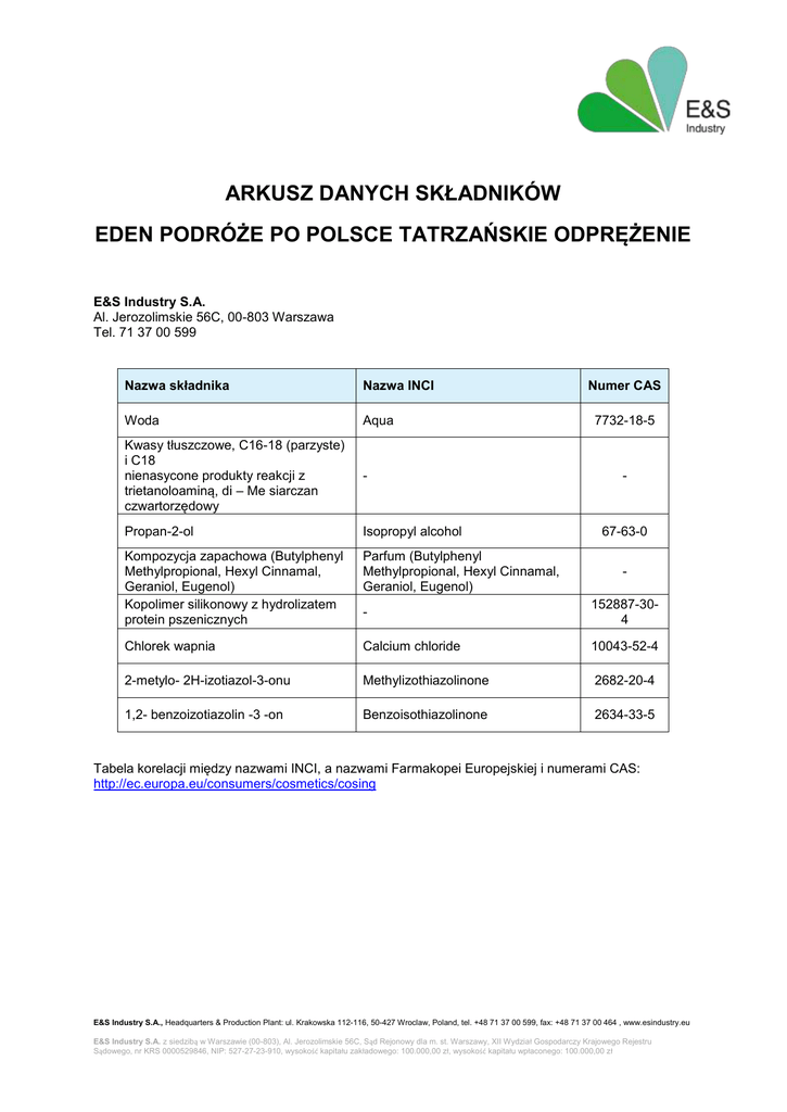 ARKUSZ DANYCH SKŁADNIKÓW EDEN PODRÓŻE PO POLSCE TATRZAŃSKIE ODPRĘŻENIE E&S Industry S.A. Al. Jerozolimskie 56C, 00-803 Warszawa Tel. 71 37 00 599 Nazwa składnika Nazwa INCI Woda Aqua Kwasy tłuszczowe, C16-18 (parzyste) i C18 nienasycone produkty reakcji z trietanoloaminą, di – Me siarczan czwartorzędowy - Propan-2-ol Isopropyl alcohol Kompozycja zapachowa (Butylphenyl Methylpropional, Hexyl Cinnamal, Geraniol, Eugenol) Kopolimer silikonowy z hydrolizatem protein pszenicznych Parfum (Butylphenyl Methylpropional, Hexyl Cinnamal, Geraniol, Eugenol) - 152887-304 Chlorek wapnia Calcium chloride 10043-52-4 2-metylo- 2H-izotiazol-3-onu Methylizothiazolinone 2682-20-4 1,2- benzoizotiazolin -3 -on Benzoisothiazolinone 2634-33-5 Numer CAS 7732-18-5 - 67-63-0 - Tabela korelacji między nazwami INCI, a nazwami Farmakopei Europejskiej i numerami CAS: http://ec.europa.eu/consumers/cosmetics/cosing E&S Industry S.A., Headquarters & Production Plant: ul. Krakowska 112-116, 50-427 Wroclaw, Poland, tel. +48 71 37 00 599, fax: +48 71 37 00 464 , www.esindustry.eu E&S Industry S.A. z siedzibą w Warszawie (00-803), Al. Jerozolimskie 56C, Sąd Rejonowy dla m. st. Warszawy, XII Wydział Gospodarczy Krajowego Rejestru Sądowego, nr KRS 0000529846, NIP: 527-27-23-910, wysokość kapitału zakładowego: 100.000,00 zł, wysokość kapitału wpłaconego: 100.000,00 zł