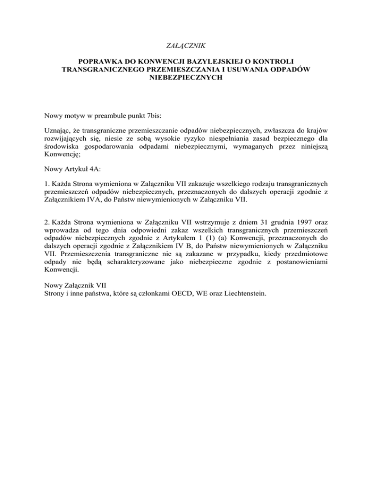 ZAŁĄCZNIK POPRAWKA DO KONWENCJI BAZYLEJSKIEJ O KONTROLI TRANSGRANICZNEGO PRZEMIESZCZANIA I USUWANIA ODPADÓW NIEBEZPIECZNYCH Nowy motyw w preambule punkt 7bis: Uznając, że transgraniczne przemieszczanie odpadów niebezpiecznych, zwłaszcza do krajów rozwijających się, niesie ze sobą wysokie ryzyko niespełniania zasad bezpiecznego dla środowiska gospodarowania odpadami niebezpiecznymi, wymaganych przez niniejszą Konwencję; Nowy Artykuł 4A: 1. Każda Strona wymieniona w Załączniku VII zakazuje wszelkiego rodzaju transgranicznych przemieszczeń odpadów niebezpiecznych, przeznaczonych do dalszych operacji zgodnie z Załącznikiem IVA, do Państw niewymienionych w Załączniku VII. 2. Każda Strona wymieniona w Załączniku VII wstrzymuje z dniem 31 grudnia 1997 oraz wprowadza od tego dnia odpowiedni zakaz wszelkich transgranicznych przemieszczeń odpadów niebezpiecznych zgodnie z Artykułem 1 (1) (a) Konwencji, przeznaczonych do dalszych operacji zgodnie z Załącznikiem IV B, do Państw niewymienionych w Załączniku VII. Przemieszczenia transgraniczne nie są zakazane w przypadku, kiedy przedmiotowe odpady nie będą scharakteryzowane jako niebezpieczne zgodnie z postanowieniami Konwencji. Nowy Załącznik VII Strony i inne państwa, które są członkami OECD, WE oraz Liechtenstein.
