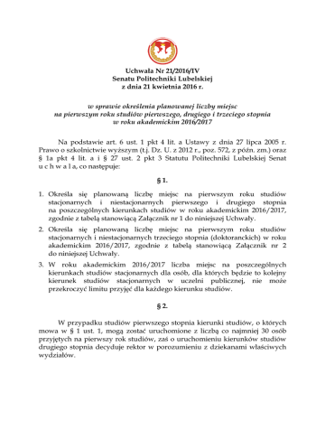 Uchwała Nr 21/2016/IV Senatu Politechniki Lubelskiej z dnia 21 kwietnia 2016 r. w sprawie określenia planowanej liczby miejsc na pierwszym roku studiów pierwszego, drugiego i trzeciego stopnia w roku akademickim 2016/2017 Na podstawie art. 6 ust. 1 pkt 4 lit. a Ustawy z dnia 27 lipca 2005 r. Prawo o szkolnictwie wyższym (t.j. Dz. U. z 2012 r., poz. 572, z późn. zm.) oraz § 1a pkt 4 lit. a i § 27 ust. 2 pkt 3 Statutu Politechniki Lubelskiej Senat u c h w a l a, co następuje: § 1. 1. Określa się planowaną liczbę miejsc na pierwszym roku studiów stacjonarnych i niestacjonarnych pierwszego i drugiego stopnia na poszczególnych kierunkach studiów w roku akademickim 2016/2017, zgodnie z tabelą stanowiącą Załącznik nr 1 do niniejszej Uchwały. 2. Określa się planowaną liczbę miejsc na pierwszym roku studiów stacjonarnych i niestacjonarnych trzeciego stopnia (doktoranckich) w roku akademickim 2016/2017, zgodnie z tabelą stanowiącą Załącznik nr 2 do niniejszej Uchwały. 3. W roku akademickim 2016/2017 liczba miejsc na poszczególnych kierunkach studiów stacjonarnych dla osób, dla których będzie to kolejny kierunek studiów stacjonarnych w uczelni publicznej, nie może przekroczyć limitu przyjęć dla każdego kierunku studiów. § 2. W przypadku studiów pierwszego stopnia kierunki studiów, o których mowa w § 1 ust. 1, mogą zostać uruchomione z liczbą co najmniej 30 osób przyjętych na pierwszy rok studiów, zaś o uruchomieniu kierunków studiów drugiego stopnia decyduje rektor w porozumieniu z dziekanami właściwych wydziałów. § 3. Uchwała wchodzi w życie z dniem podpisania przez rektora Politechniki Lubelskiej. 2 Załącznik nr 1 do Uchwały Nr 21/2016/IV Senatu Politechniki Lubelskiej z dnia 21 kwietnia 2016 r. Planowana liczba miejsc na pierwszym roku studiów stacjonarnych i niestacjonarnych pierwszego i drugiego stopnia w roku akademickim 2016/2017 Lp. 1. 2. 3. 4. 5. 6. 7. 8. 9. 10. 11. 12. 13. 14. 15. 16. 17. 18. 19. 20. Wydział/kierunek studiów Wydział Budownictwa i Architektury Architektura Budownictwo Wydział Elektrotechniki i Informatyki Elektrotechnika Informatyka Inżynieria systemów bezpieczeństwa wewnętrznego* Wydział Mechaniczny Inżynieria materiałowa Inżynieria produkcji Transport Mechanika i budowa maszyn Wydział Inżynierii Środowiska Inżynieria środowiska Inżynieria odnawialnych źródeł energii Wydział Zarządzania Finanse i rachunkowość Marketing i komunikacja rynkowa** Zarządzanie Wydział Podstaw Techniki Edukacja technicznoinformatyczna Matematyka Inżynieria bezpieczeństwa Kierunki prowadzone wspólnie Mechatronika Inżynieria biomedyczna Zarządzanie i inżynieria produkcji Razem planowana liczba miejsc: Studia stacjonarne pierwszego drugiego stopnia stopnia Studia niestacjonarne pierwszego drugiego stopnia stopnia 310 180 90 90 90 220 60 120 90 90 390 255 270 150 210 180 150 105 120 90 60 90 - - 60* - 365 60 60 90 330 60 60 90 240 30 60 60 210 30 60 60 155 120 90 60 225 150 60 30 150 150 60 30 75 - - - 270 90 120 - 90 30 120 - 90** - 30** - 90 120 30 120 180 90 90 60 60 60 30 30 60 60 30 - 30 30 30 - 285 180 150 150 90 75 90 60 60 60 60 60 120 30 30 30 2025 1305 990 810 * kierunek w organizacji ** kierunek w organizacji, zostanie uruchomiony po uzyskaniu zgody Ministra Nauki i Szkolnictwa Wyższego 3 Załącznik nr 2 do Uchwały Nr 21/2016/IV Senatu Politechniki Lubelskiej z dnia 21 kwietnia 2016 r. Planowana liczba miejsc na pierwszym roku studiów trzeciego stopnia (doktoranckich) w roku akademickim 2016/2017 Lp. Dyscyplina 1. budowa i eksploatacja maszyn 2. elektrotechnika 3. inżynieria środowiska Razem planowana liczba miejsc: Studia trzeciego stopnia (doktoranckie) stacjonarne niestacjonarne 30 20 20 15 50 35 4