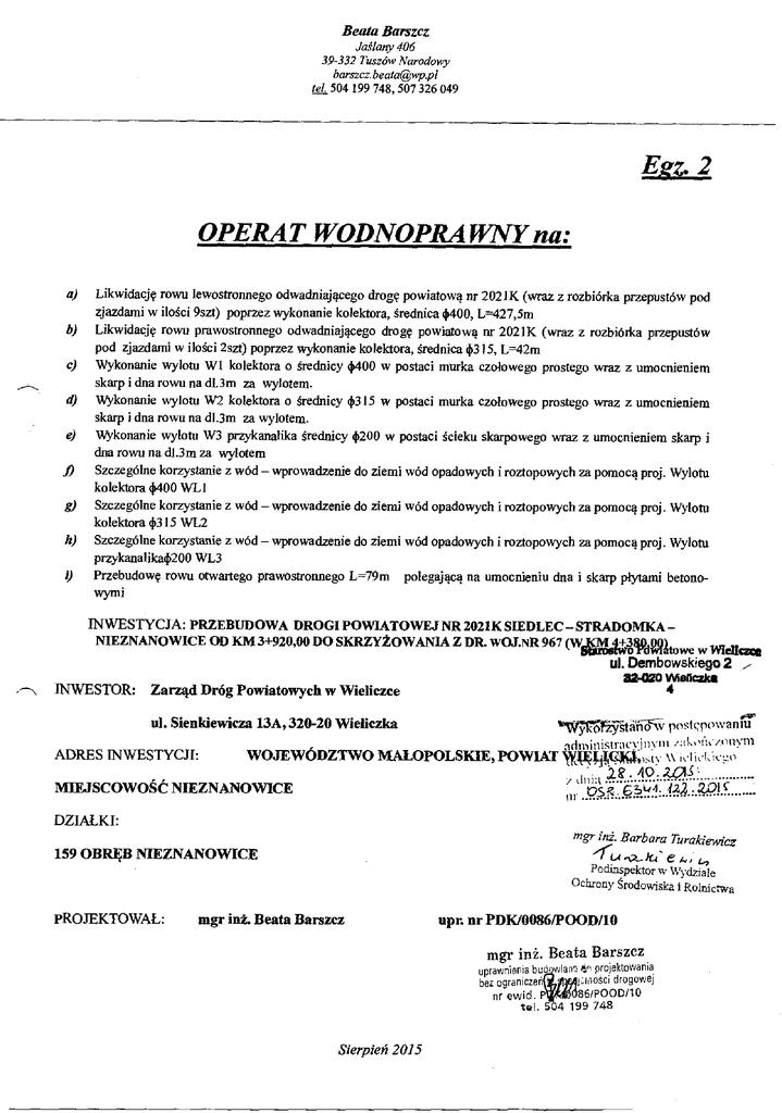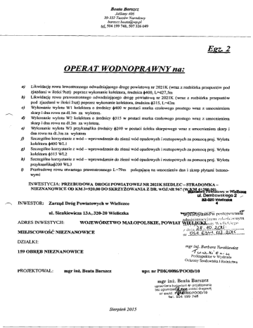 Beata Barszcz Jaślany 406 39-332 Tuszów Narodowy barszcz.beatawp.pi set 504 199 748, 507 326 049 Ejzz.2 OPERA T WODNOPRA WAT na: a) Likwidacj ę rowu lewostronnego odwadniaj ącego drogę powiatową nr 2021K (wraz z rozbiórka przepustów pod zjazdami w iloś ci 9szt) poprzez wykonanie kolektora, średnica 4)400, L427,5m b) Likwidacj ę rowu prawostronnego odwadniaj ącego drogę powiatową nr 2021K (wraz z rozbiórka przepustów pod zjazdami w ilo ś ci 2szt) poprzez wykonanie kolektora, średnica 4)315, L42m c) Wykonanie wylotu W1 kolektora o średnicy 4)400 w postaci murka czołowego prostego wraz z umocnieniem skarp i dna rowu na dl.3m za wylotem. d) Wykonanie wylotu W2 kolektom o średnicy 4,315 w postaci murka czoł owego prostego wraz z umocnieniem skarp i dna rowu na dl.3m za wylotem. e) Wykonanie wylotu W3 przykanalika średnicy 4)200 w postaci ś cieku skarpowego wraz z umocnieniem skarp i dna rowu na dl.3m za wylotem /) Szczególne korzystanie z wód - wprowadzenie do ziemi wód opadowych i roztopowych za pomoc ą proj. Wylotu kolektom 4,400 WL 1 g) Szczególne korzystanie z wód - wprowadzenie do ziemi wód opadowych i roztopowych za pomoc ą proj. Wylotu kolektora 4,315 WL2 Ii) Szczególne korzystanie z wód - wprowadzenie do ziemi wód opadowych i roztopowych za pomoc ą proj. Wylotu przykanalika4)200 WL3 1) Przebudowę rowu otwartego prawostronnego L79m polegaj ącą na umocnieniu dna i skarp p łytami betonowymi INWESTYCJA: PRZEBUDOWA DROGI POWIATOWEJ NR 2021K SIEDLEC - STRADOMKA NIEZNANO WICE OD KM 3+920,00 DO SKRZY ŻOWANIA Z DR. WOJ.NR 967 (W~3 ¥dWltowe w ffleuczce ul. Dembowskego2 fl-020 W.fl 4 .-. INWESTOR: Zarząd Dróg Powiatowych w Wieliczce ul. Sienkiewicza 13A,320-20 Wieliczka ADRES INWESTYCJI: wytdhW post ę powaniu WOJEWÓDZTWO MAŁOPOLSKIE, POWIAT diiiflistr C.il1 11 \\1cliLLCt ) MWJSCOWOŚĆ NIEZNANOWICE DZIAŁKI: mgr mgr inż. Barbara Turakjy4 159 OBRĘB NIEZNANO WICE e ; Podinspektor w W ydziale Ochrony Ś rodowiska i Rolnictwa PROJEKTOWAŁ : mgr inż. Beata Barszcz Upr. nr PDK/0086/POODI10 mgr in ż . Beata Barszcz uprawnienia bud w!ane projektowania h1osCi drogowej bez ogranicze ń 86/POOD/lO P nr ewid. tal. 504 199 748 Sierpień 2015 OPERAT WODNOPRAWNy: PRZEBUDOWA DROGI POWIATOWEJ NR 2021K SIEDLEC STRADONIKA - NIEZNANOWICE OD KM 3+920,00 DO SKRZYŻOWA)L% Z DR. WOJ. NR 967 (W KM 4+380,00) Statostwo Powiat ul. Dembowji 32-020 Wli1 4 A. CZĘŚĆ OPISOWA Spis treści I. Część ogólna ......................................................................................................................3 Cel izakres opracowania ......................................................................................................................................................3 Jednostka ubiegaj ąca się o wydanie pozwolenia wodnoprawnego .......................................................................................3 Podstawy prawne i merytoryczne opracowania ....................................................................................................................3 Charakterystyka terenu, którego dotyczy wniosek o wydanie pozwolenia wodnoprawnego ........................... 4 Cel i zakres zamierzonego korzystania zwód ...................................................................................................................... 4 Charakterystyka terenu opracowania....................................................................................................................................5 Obowiązki ubiegaj ącego si ę o pozwolenie wodnoprawne w stosunku do osób trzecich ......................................................9 Opis urządzenia wodnego ................................................................................................................................................... IQ S. Rodzaj urządzeń pomiarowych oraz znaków żeglugowych ................................................................................................ 13 III. Charakterystyka wód obj ę tych pozwoleniem wodnoprawnym ..........................................................13 1. Charakterystyka odbiornika wód deszczowych .................................................................................................................13 2. Wyniki pomiarów ilo ści ijakoś ci wód deszczowych..........................................................................................................13 3. Opis instalacji i urządzeń służących do gromadzenia, oczyszczania oraz odprowadzania ścieków ...................................14 4. Informacja o sposobie zagospodarowania osadów ś ciekowych .......................................................................................... 14 Opis urządzeń służących do pomiaru oraz rejestracji ilo ści, stanu i składu odprowadzanych ścieków ..............................15 5. Opis jakoś ci wody w miejscu zamierzonego wprowadzania ścieków ................................................................................15 6. IV. Obliczenia ...................................................................................................................... 15 1. Warunki hydrologiczne i metodyka oblicze ń ...................................................................................................................... 15 2. Obliczenia hydrologiczne hydrauliczne............................................................................................................................17 3. Określenie wielkości zrzutu ścieków .................................................................................................................................. 21 1. Obliczenia hydrauliczne dla koryta rowu do którego odprowadzane s ą wody opadowe ....................................................21 V. Ustalenia wynikaj ące z planu gospodarowania wodami na obszarze dorzecza i warunków korzystania z wód regionu wodnego, planu zarz ądzania ryzykiem powodziowym,